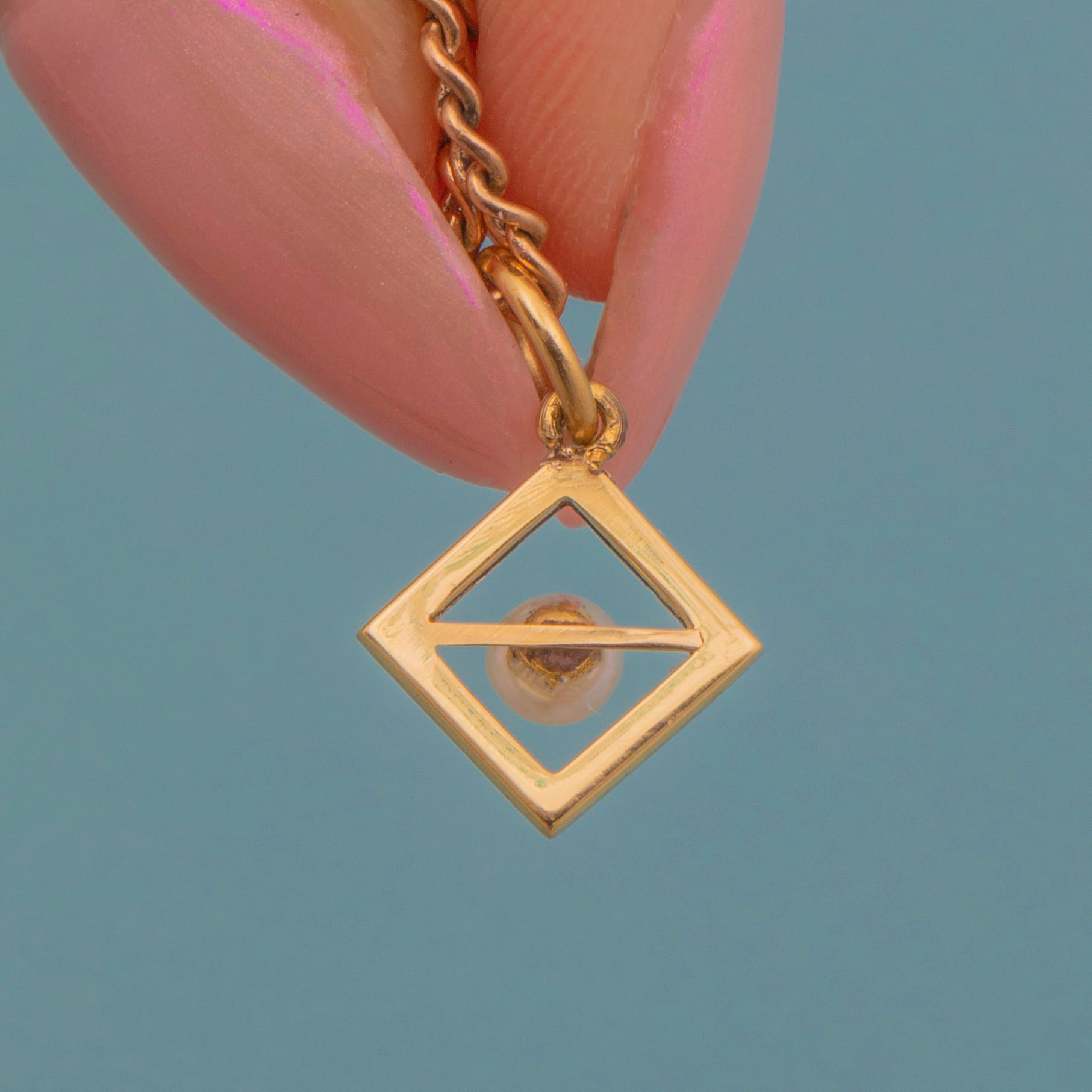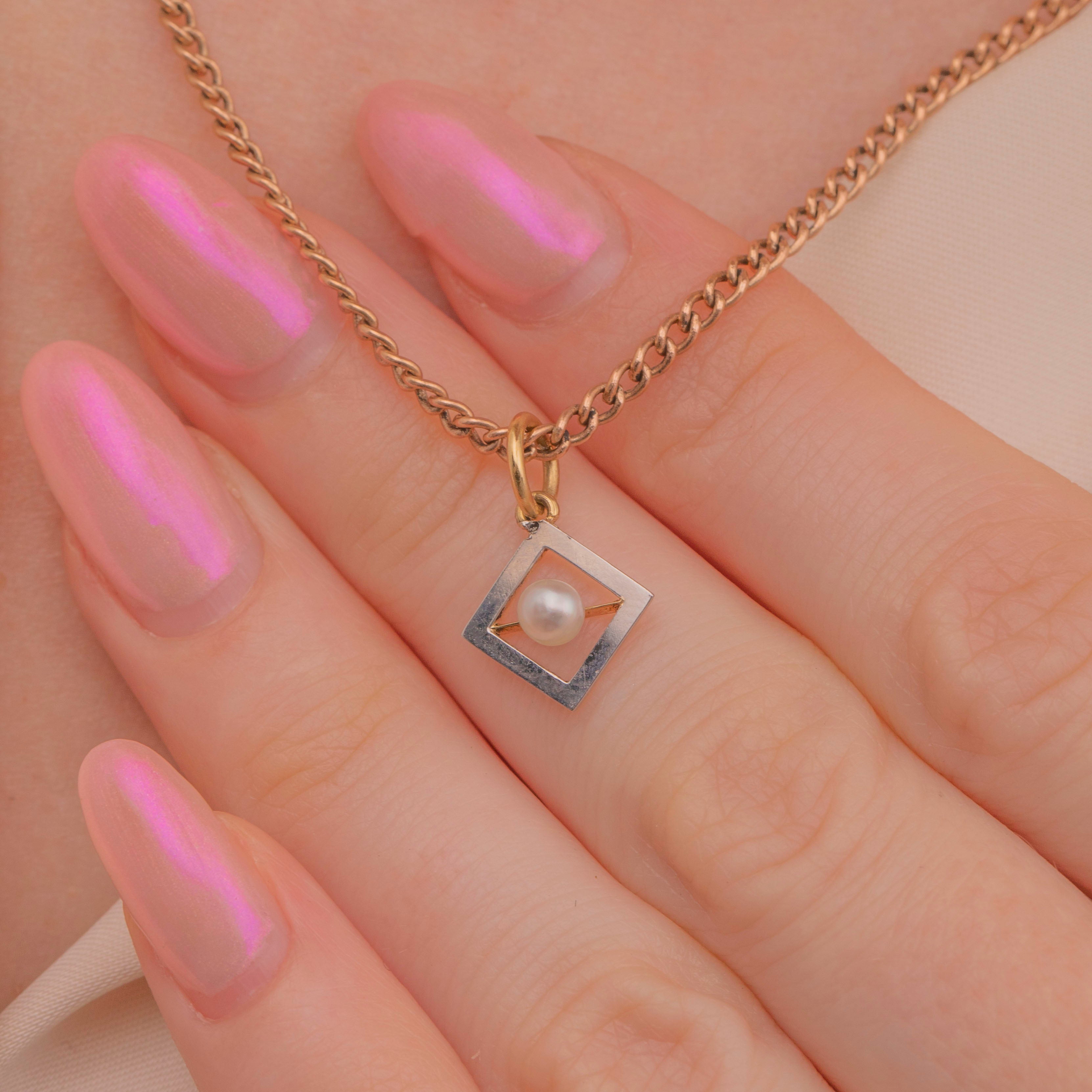Crafted from lustrous 18ct Gold and a radiant Platinum front, she features a creamy Pearl in her centre that catches the light wonderfully. Suspended from a fine chain, this little geometric Edwardian charm is the perfect dainty, versatile piece to add to your collection.