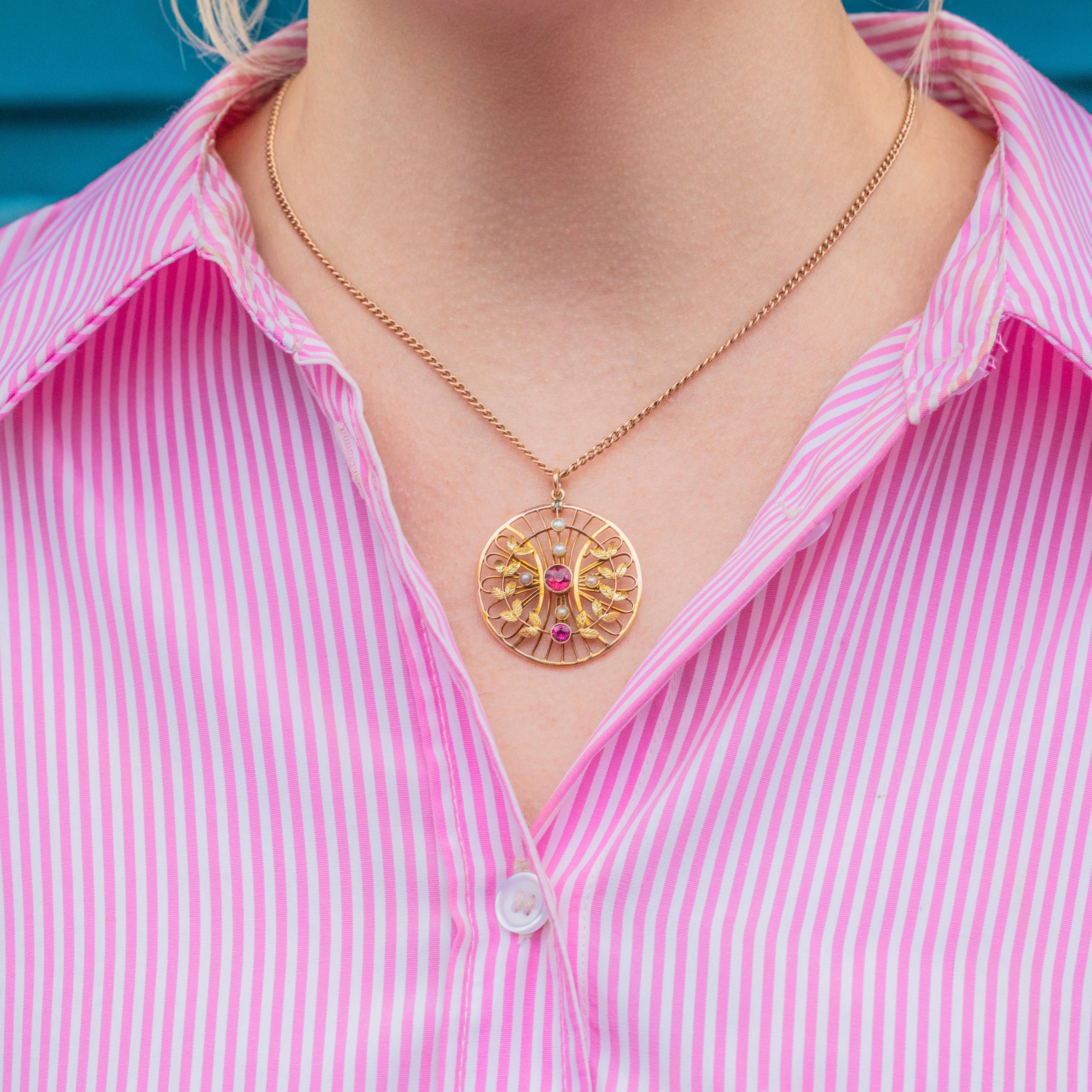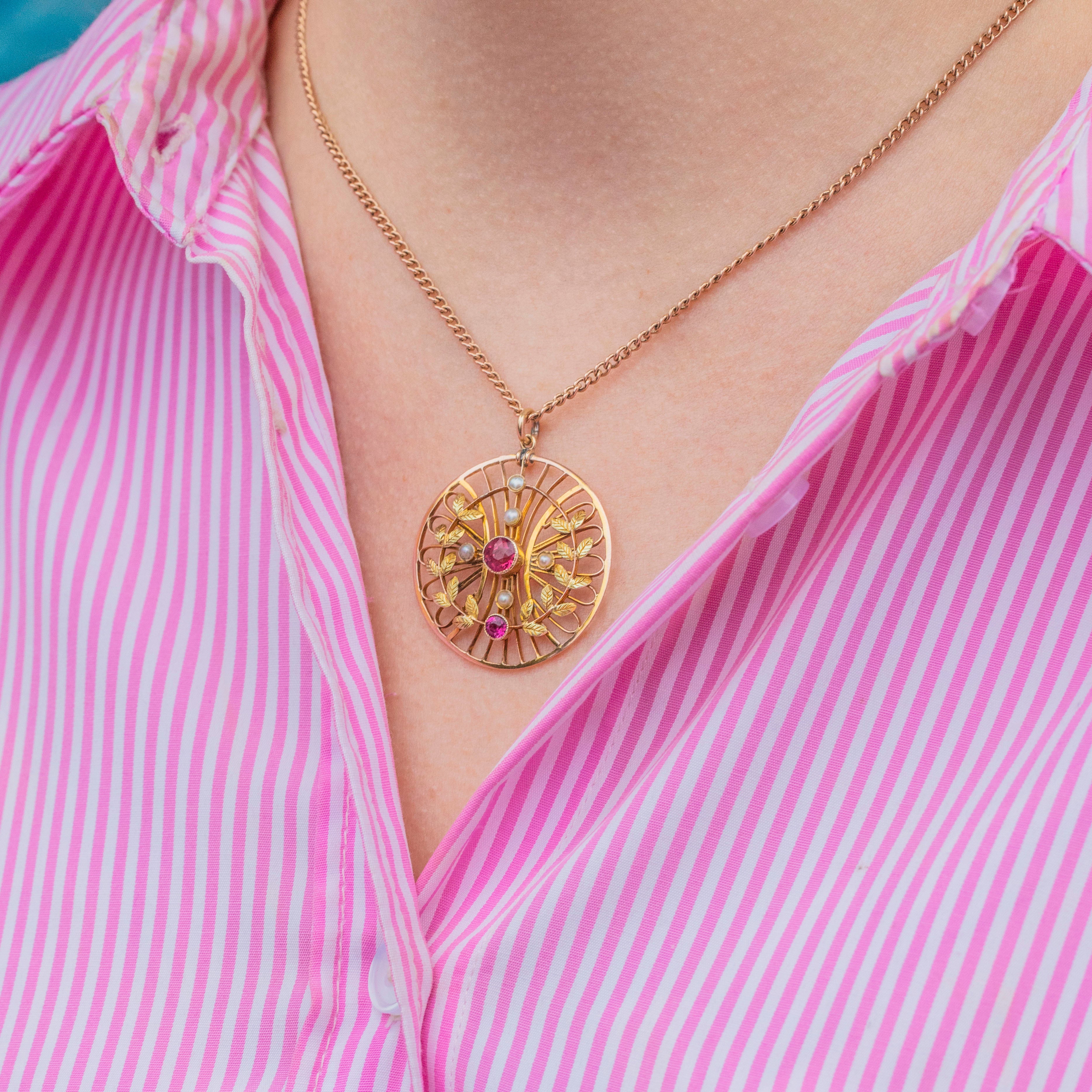 Add a pop of elegance to your collection with this Edwardian 18ct Gold Ruby Pearl round pendant!