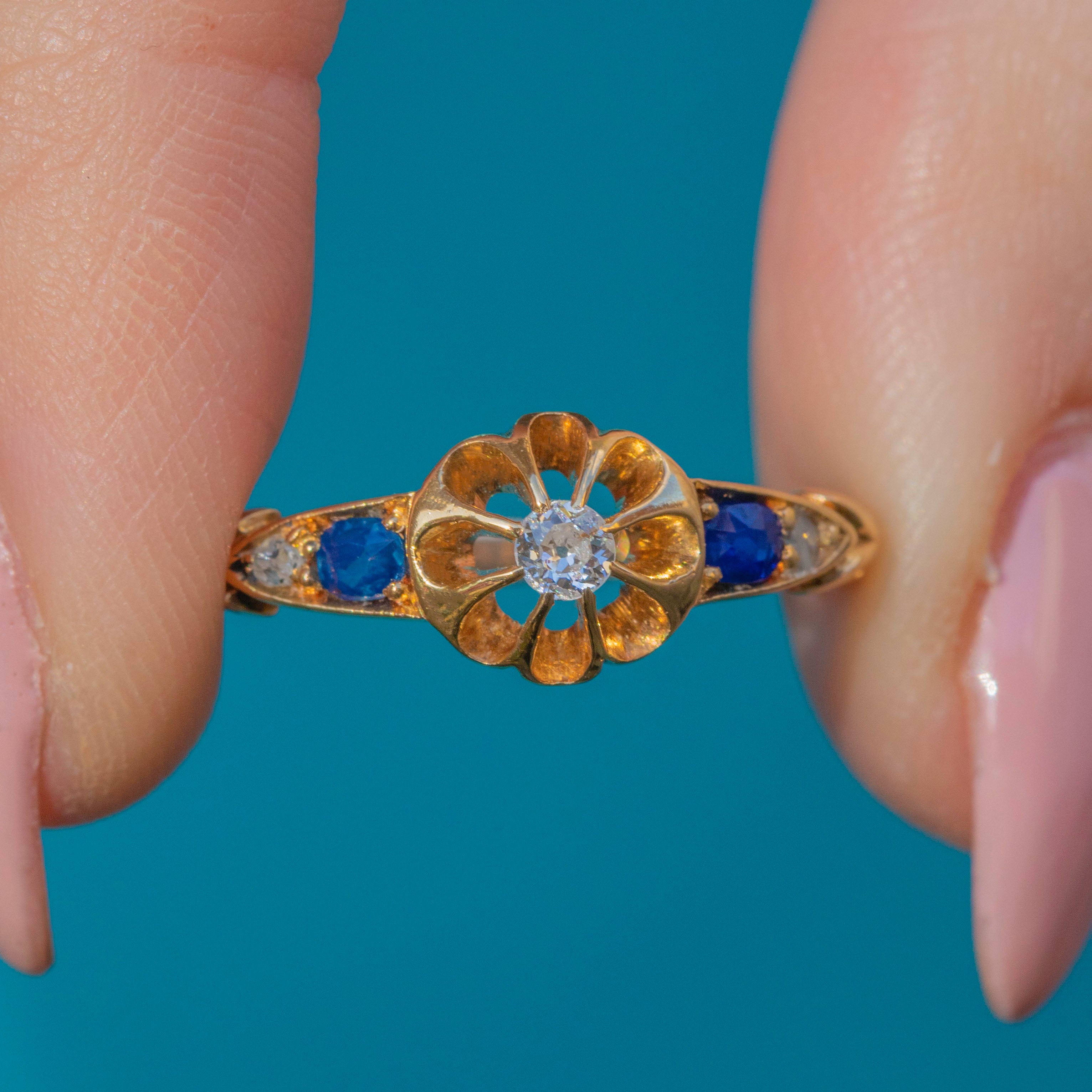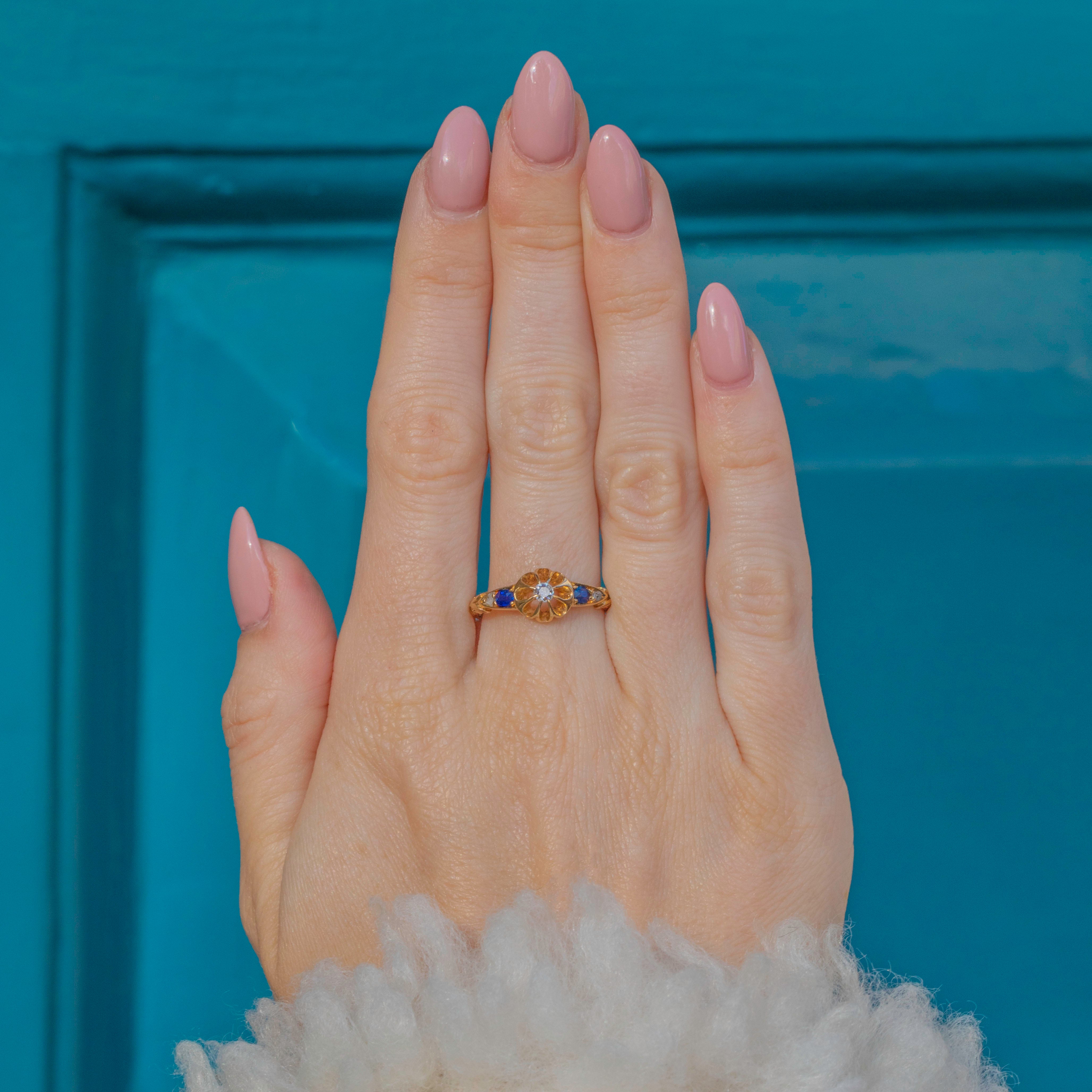 This Edwardian 18ct Gold Sapphire Diamond flower ring is just the sweetest! The star of the show is her Diamond elevated by feminine buttercup settings, allowing the light to pour through from every angle creating a mesmerising glisten.