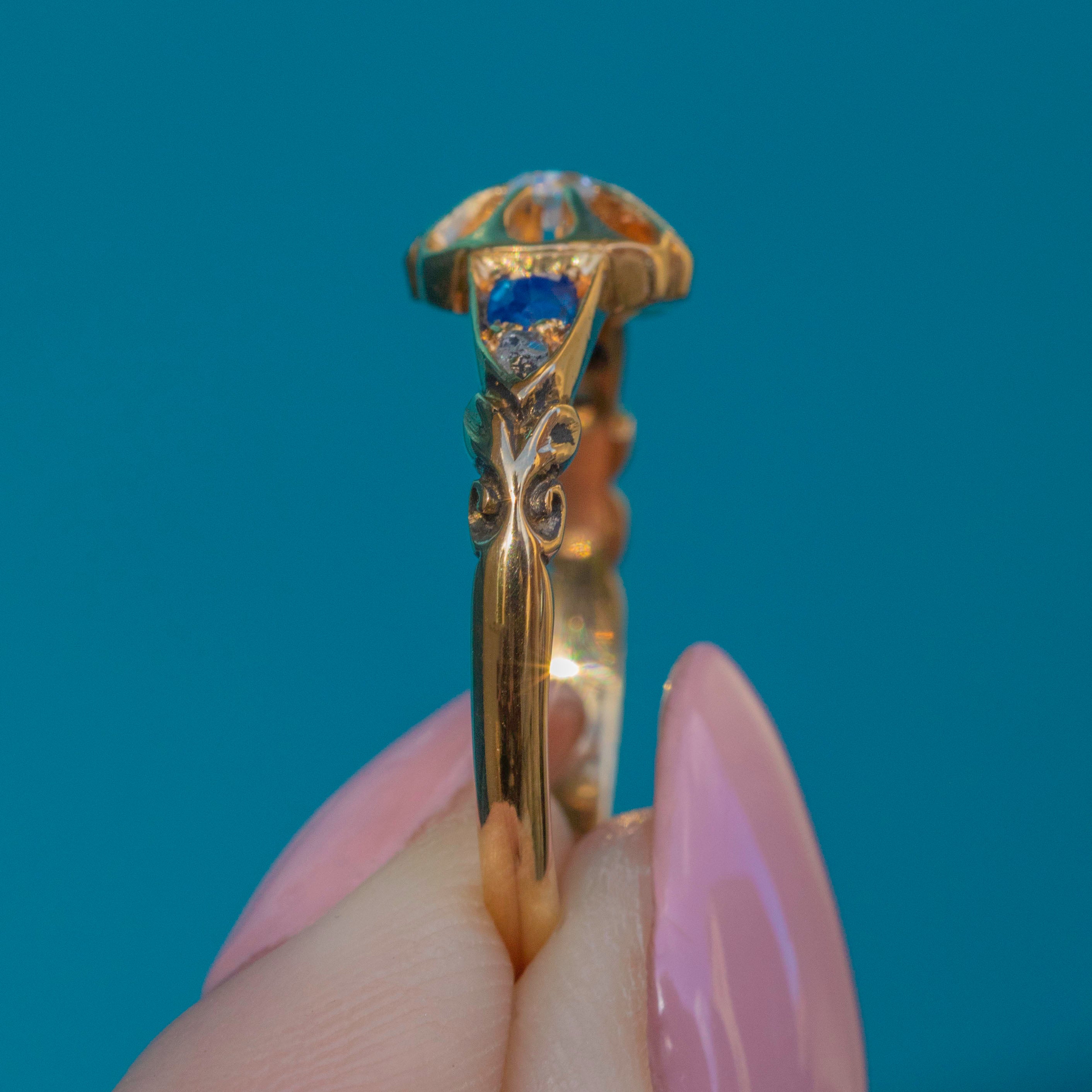 The shoulders of this Edwardian ring are exquisite, inlaid with two glistening Sapphires and two more Diamonds for the finishing touch. With gorgeous scrollwork on either side, all eyes are guaranteed to draw towards her.