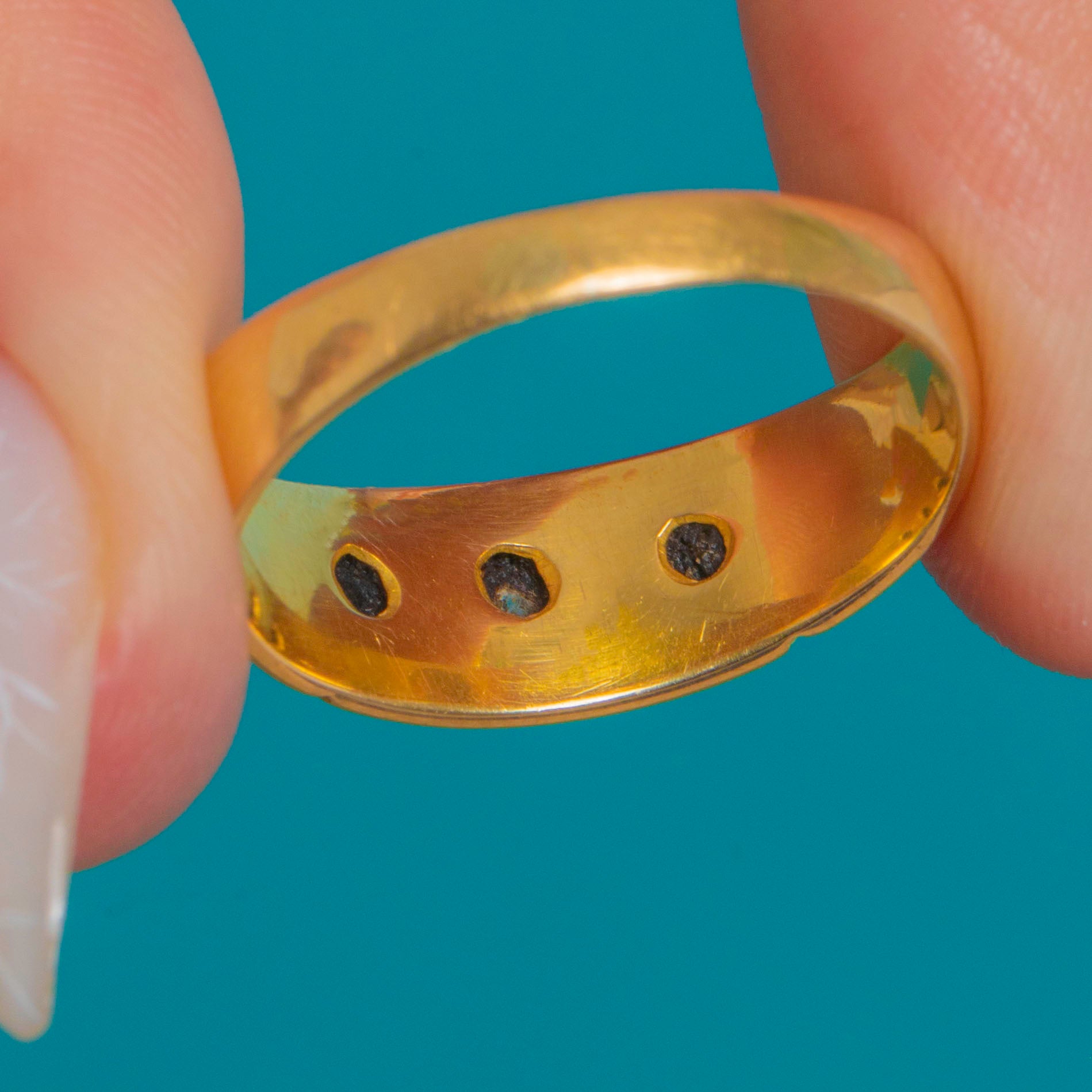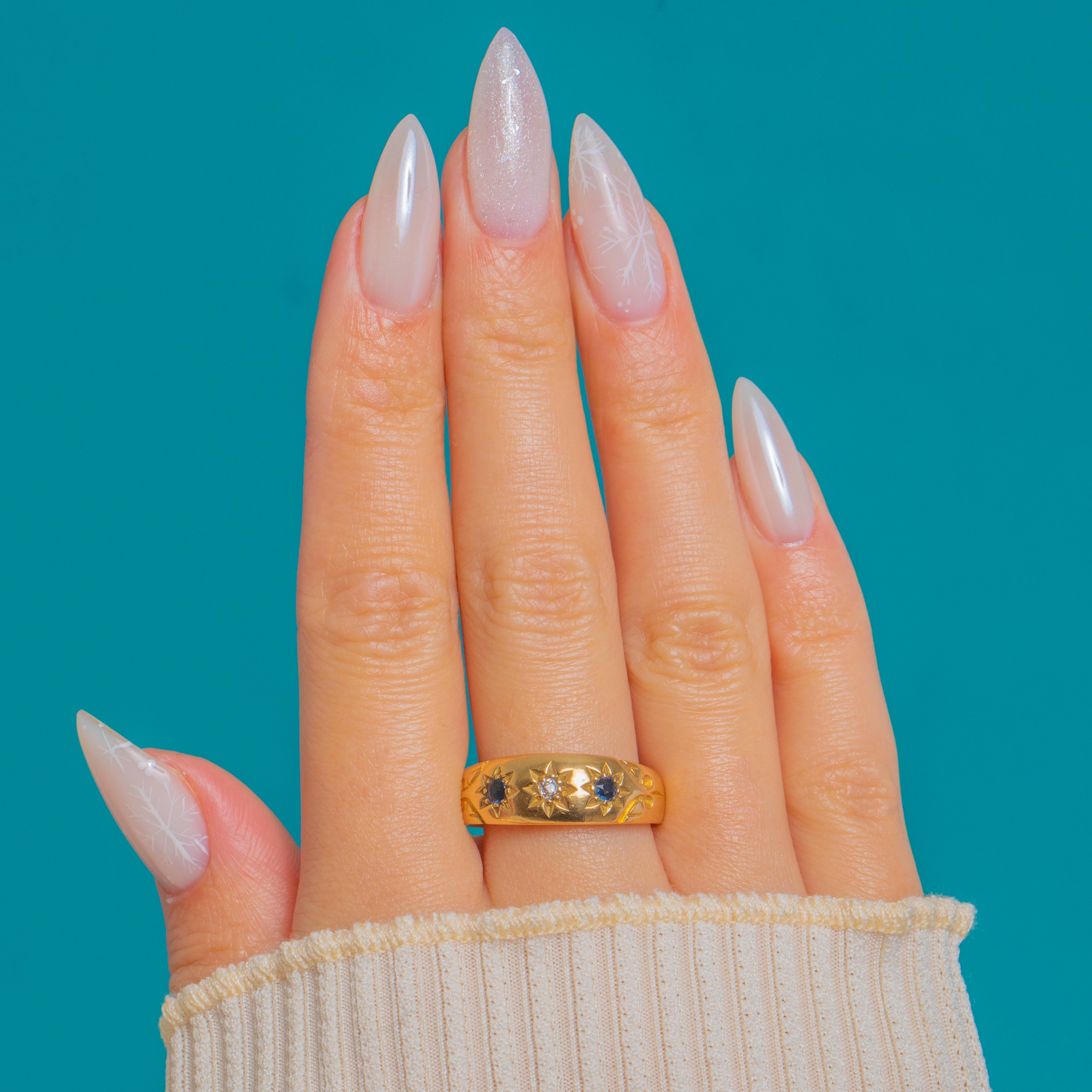 This handsome Edwardian gypsy ring is a timeless classic: a rich 18ct Gold domed band set with a lively trio of star-cut settings, the central Diamond flanked by two deep blue Sapphires. The low, smooth profile hugs the finger beautifully, while the crisp eight-point starbursts add that signature antique sparkle.