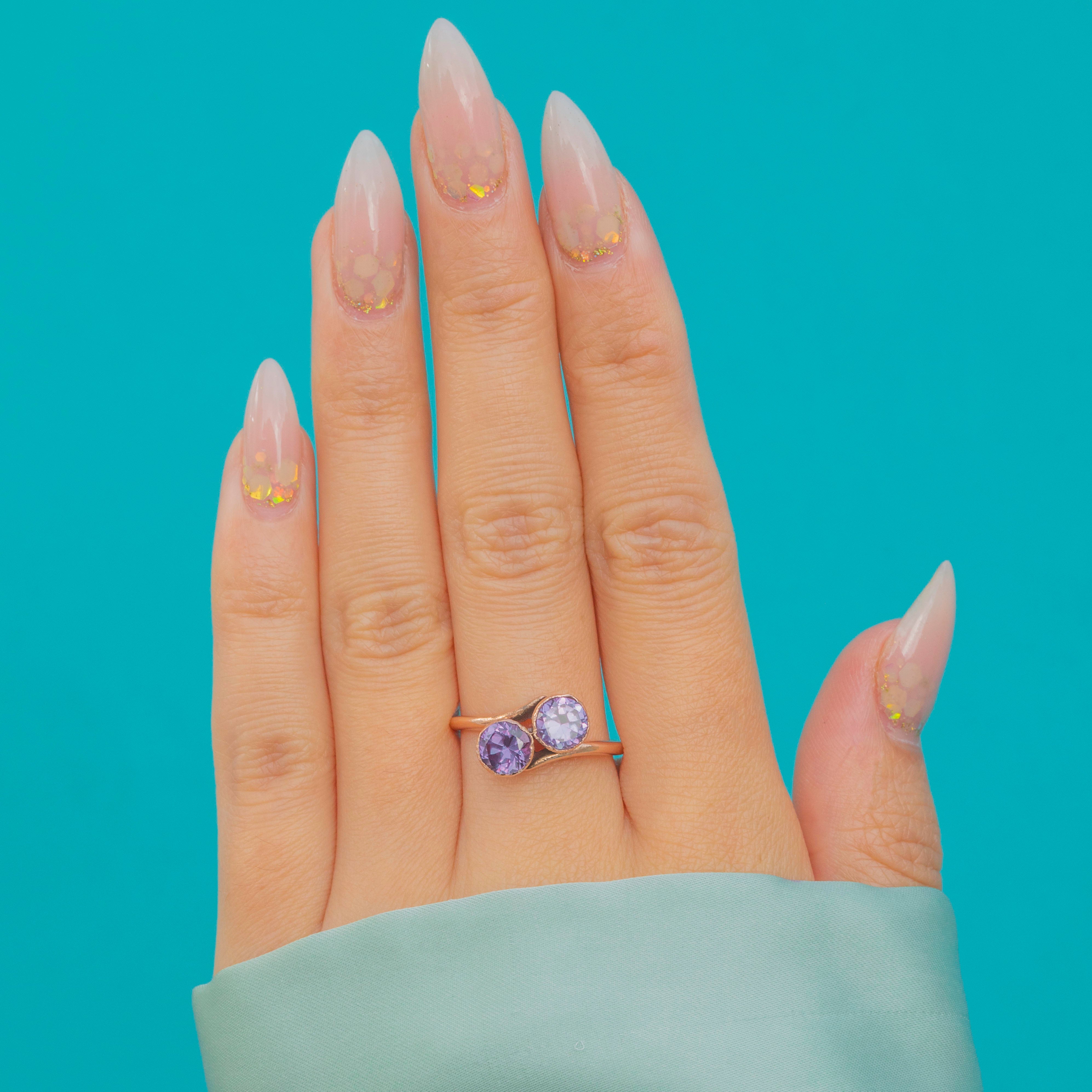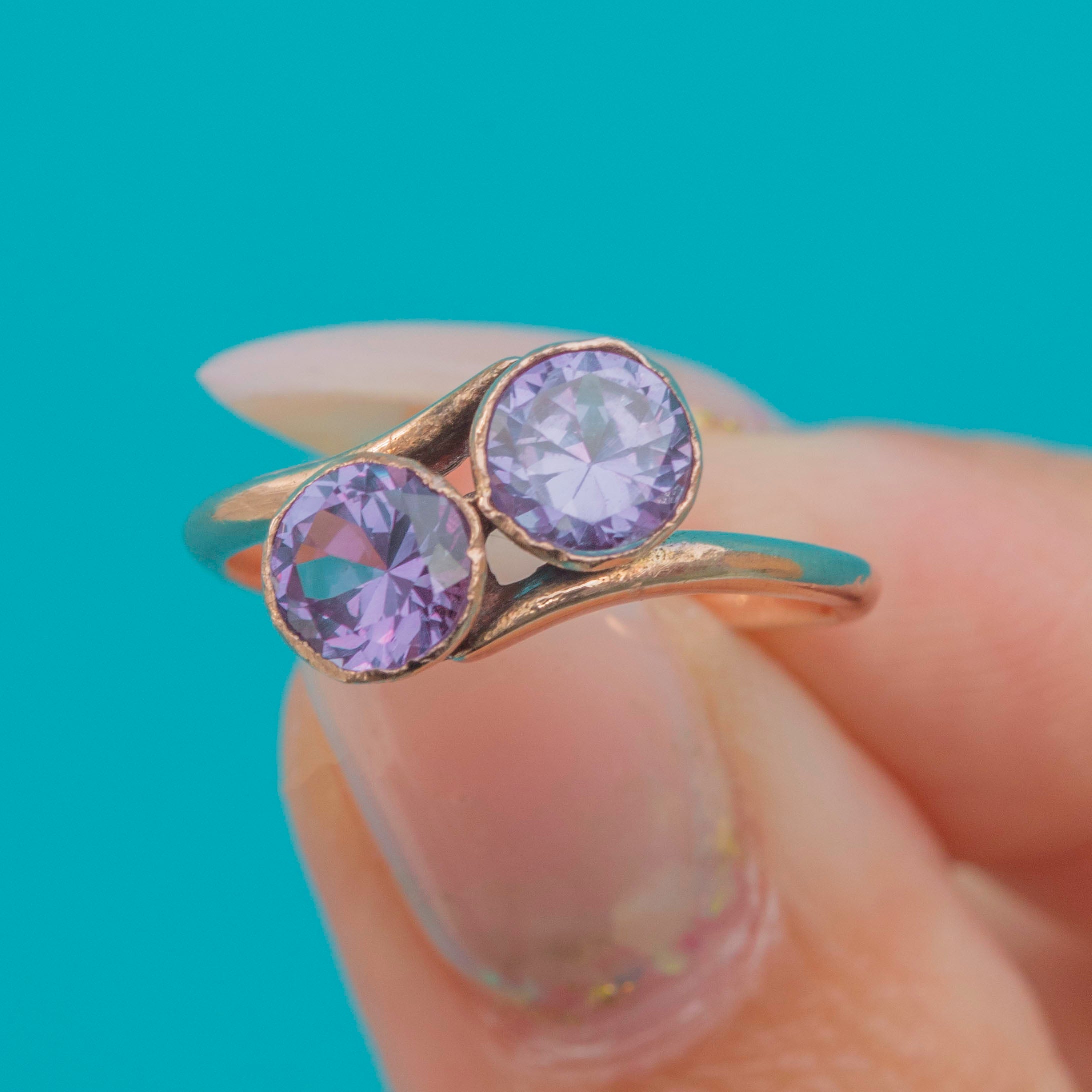 A romantic Edwardian “Toi et Moi” ring, symbolising two souls entwined, crafted in 9ct Gold and set with a pair of captivating lilac to purple colour-change Sapphires. Each round Sapphire is an antique lab-made or “synthetic “ Sapphire, just over 0.50ct each, and shifts in hue depending on the light, ranging from violet to bluish tones, adding a magical and ever-changing character to this antique jewel.