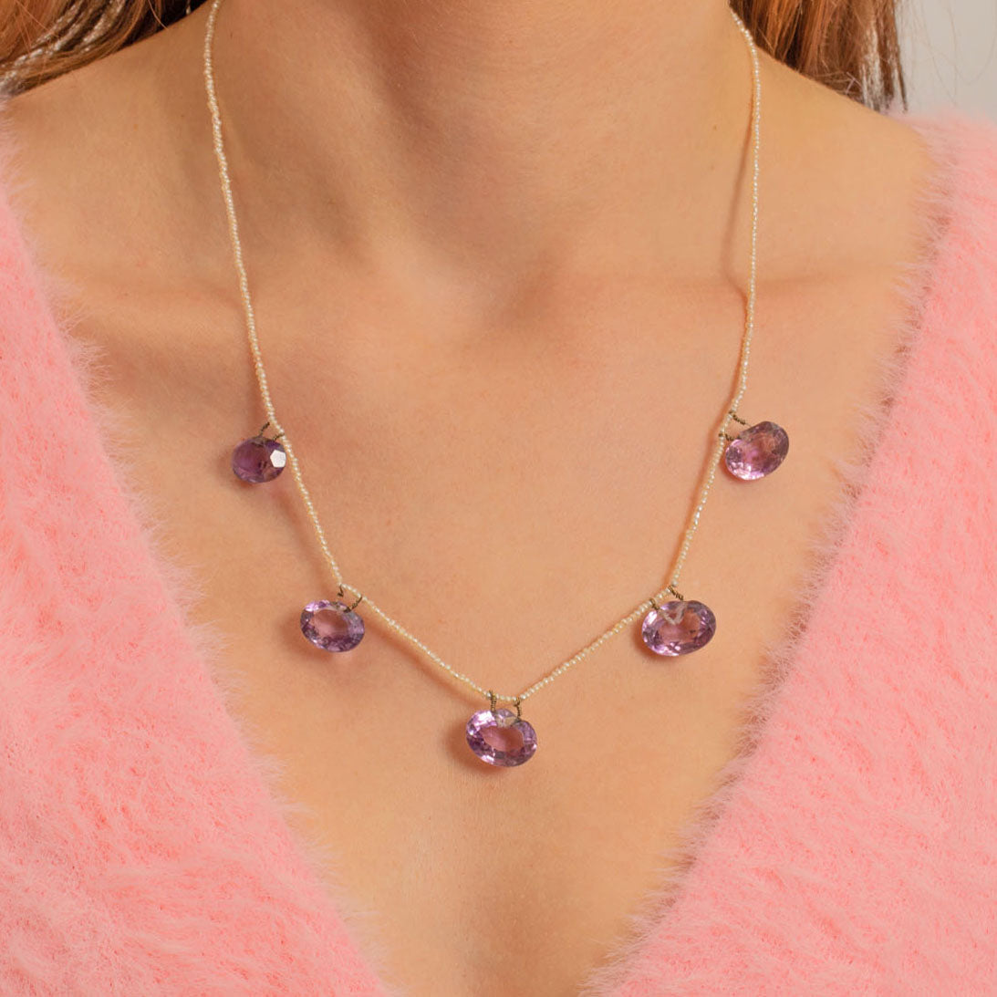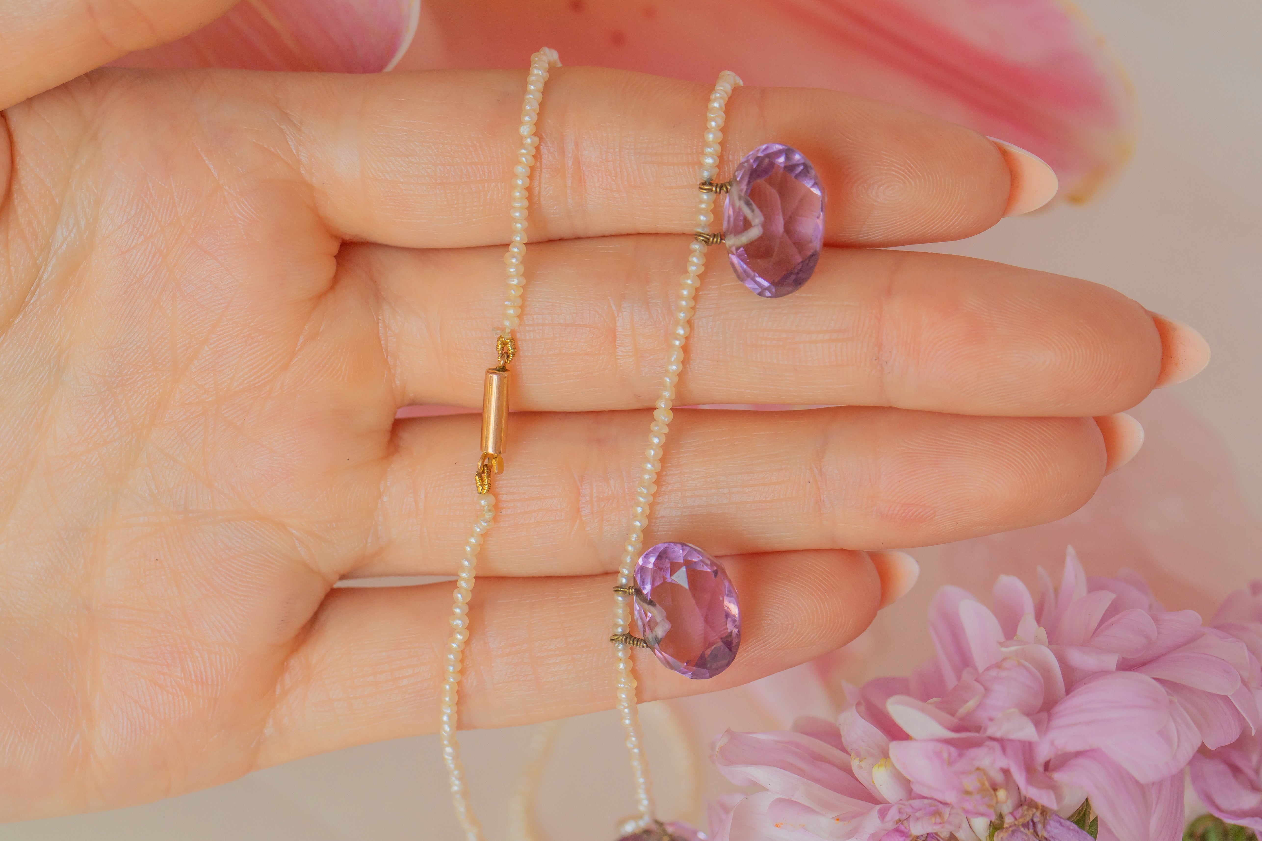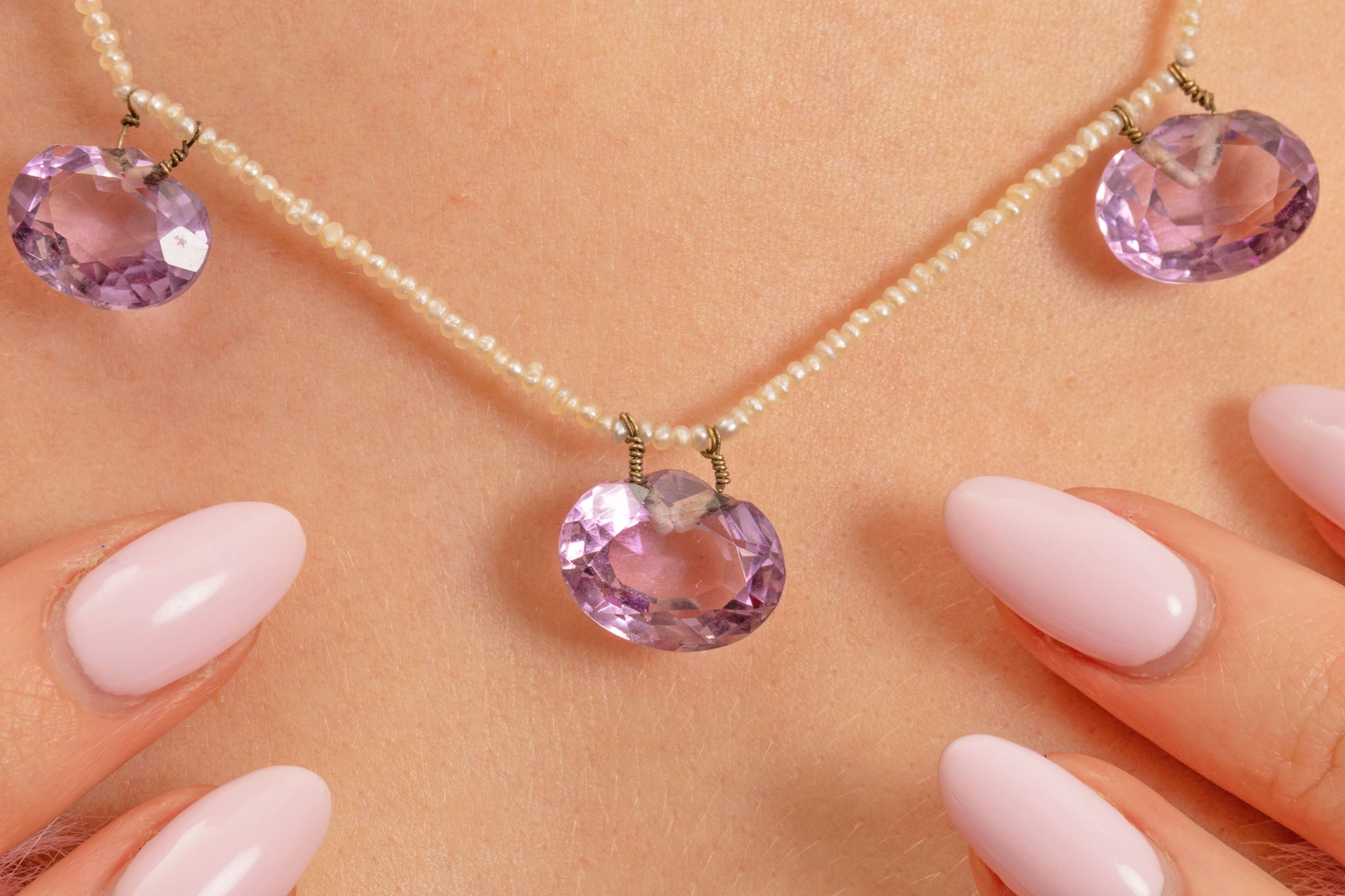 Strung with shimmering Seed Pearls, each dainty yet individual in shape and size, celebrating their organic form. She comes complete with a stamped 9ct Gold barrel clasp. Amethyst is the birthstone of February, making this mermaid-esque Edwardian necklace a fine gift for any Aquarius baby.