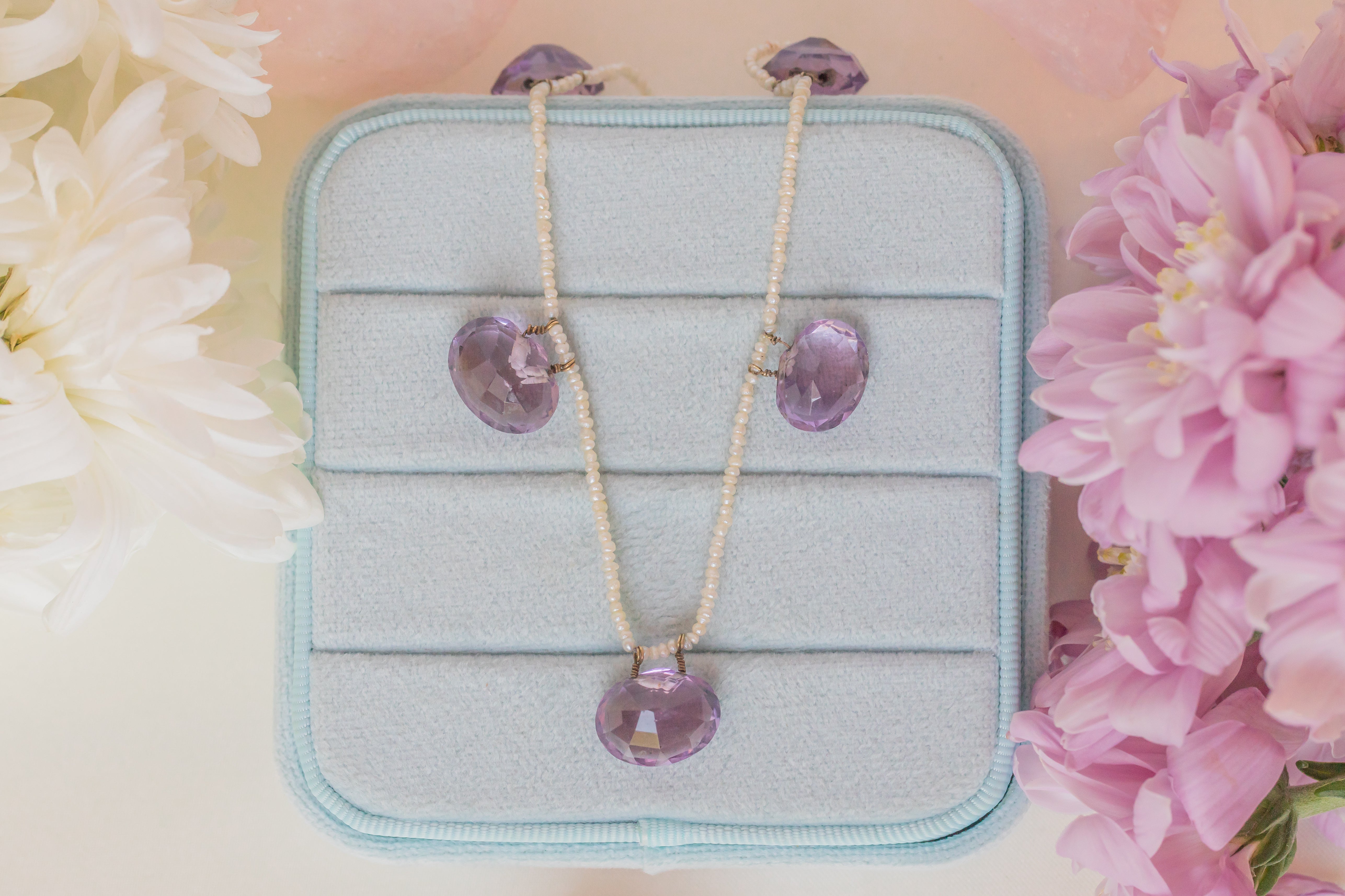 We can't believe how beautiful this Edwardian amethyst & Seed Pearl necklace is! A summery find perfect for the upcoming warmer months, this antique necklace flaunts five juicy Amethysts. Gorgeously plump, light billows through every facet exuding a subtle twinkle.