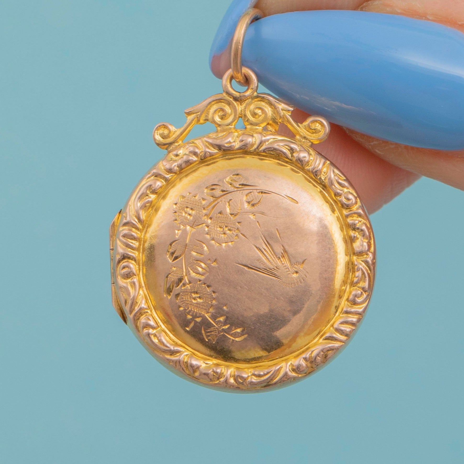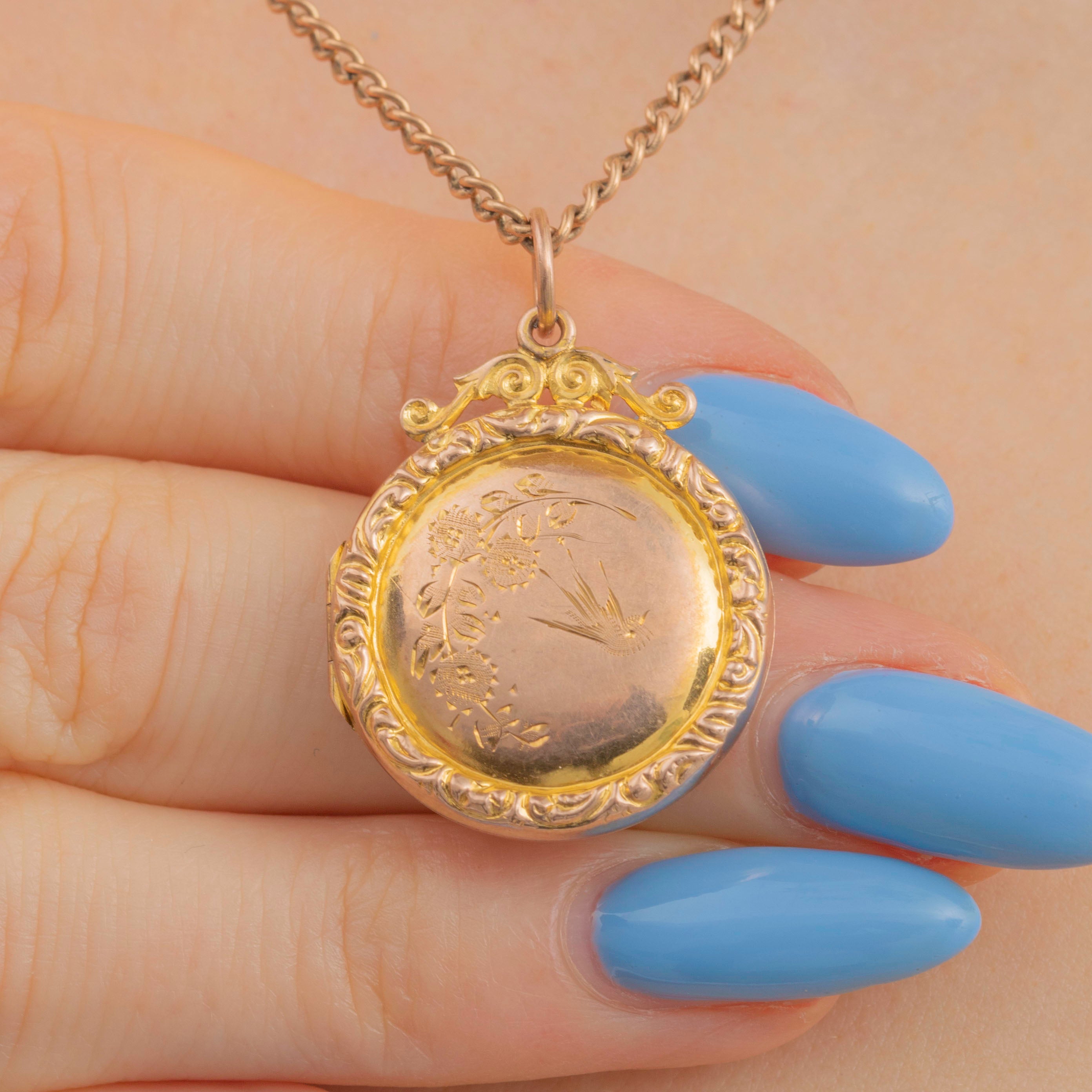 This charming Edwardian 9ct Gold chased locket will make a lovely addition to your collection! The locket boasts fine details throughout, including a romantic swooping swallow on one side symbolising love and protection, and a bouquet of flowers on the reverse.