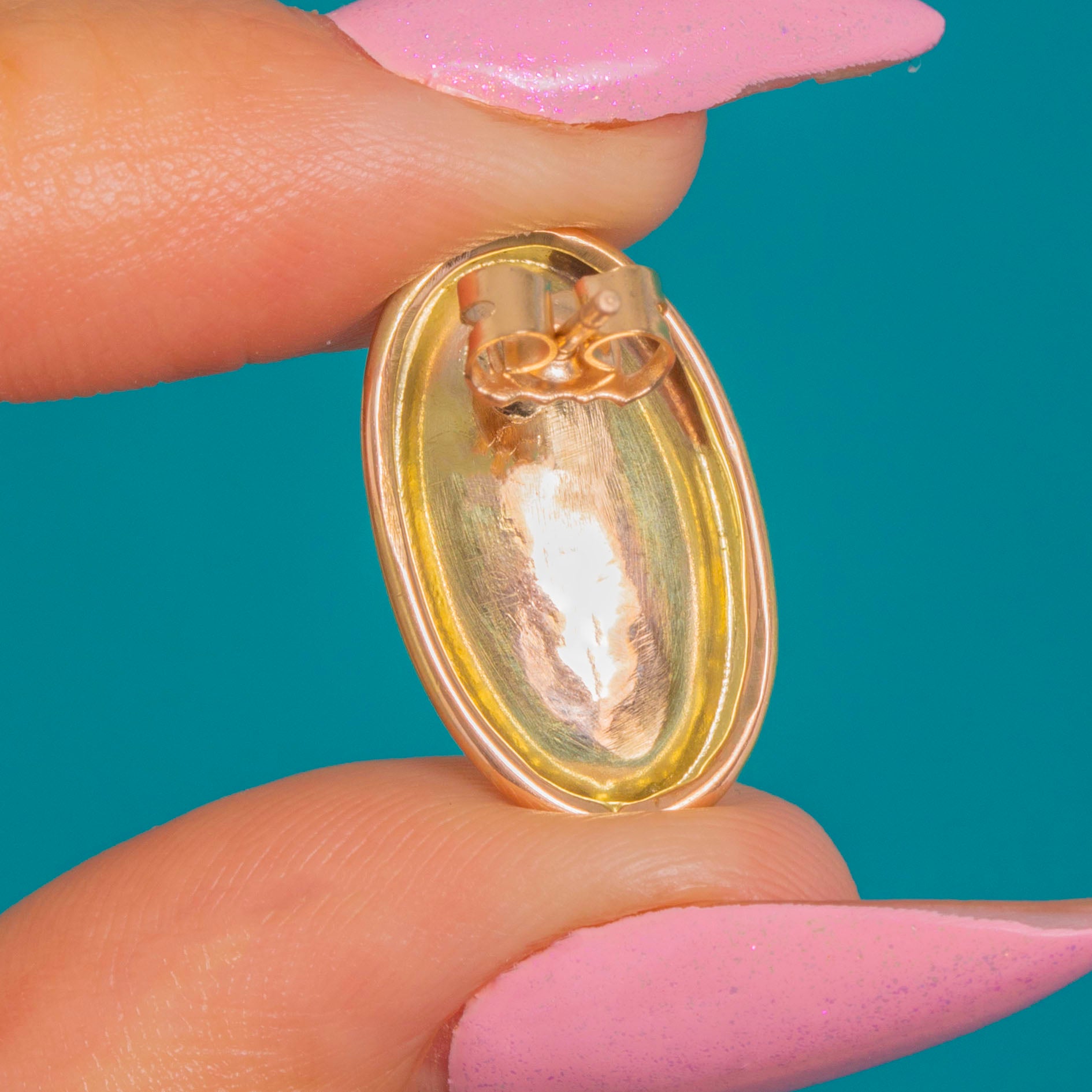 Refined and effortlessly elegant, these Edwardian 9ct Gold oval studs showcase the era’s love of delicate ornamentation. Converted from antique cufflinks, each domed oval is framed by a raised rim and divided vertically: one half gleams with a high polish while the other is adorned with low‑relief foliate scroll engravings, separated by a slender beaded divider.