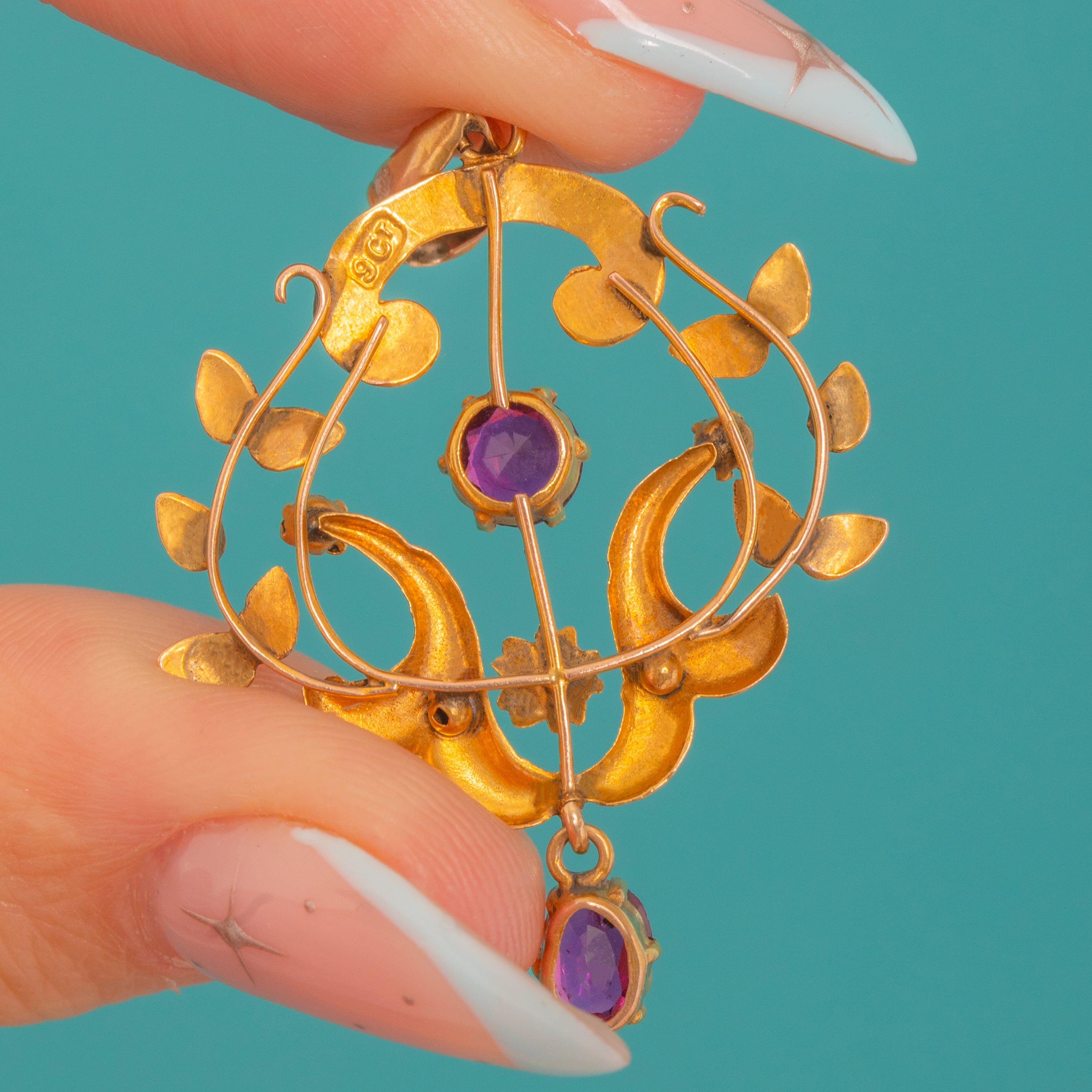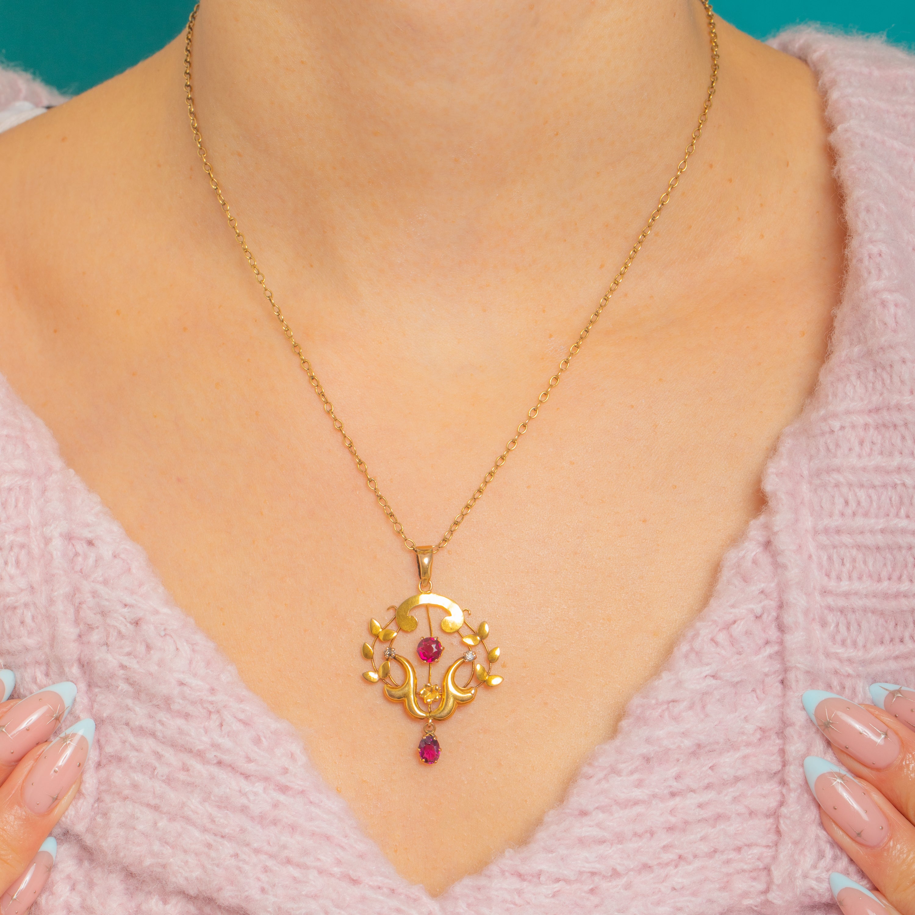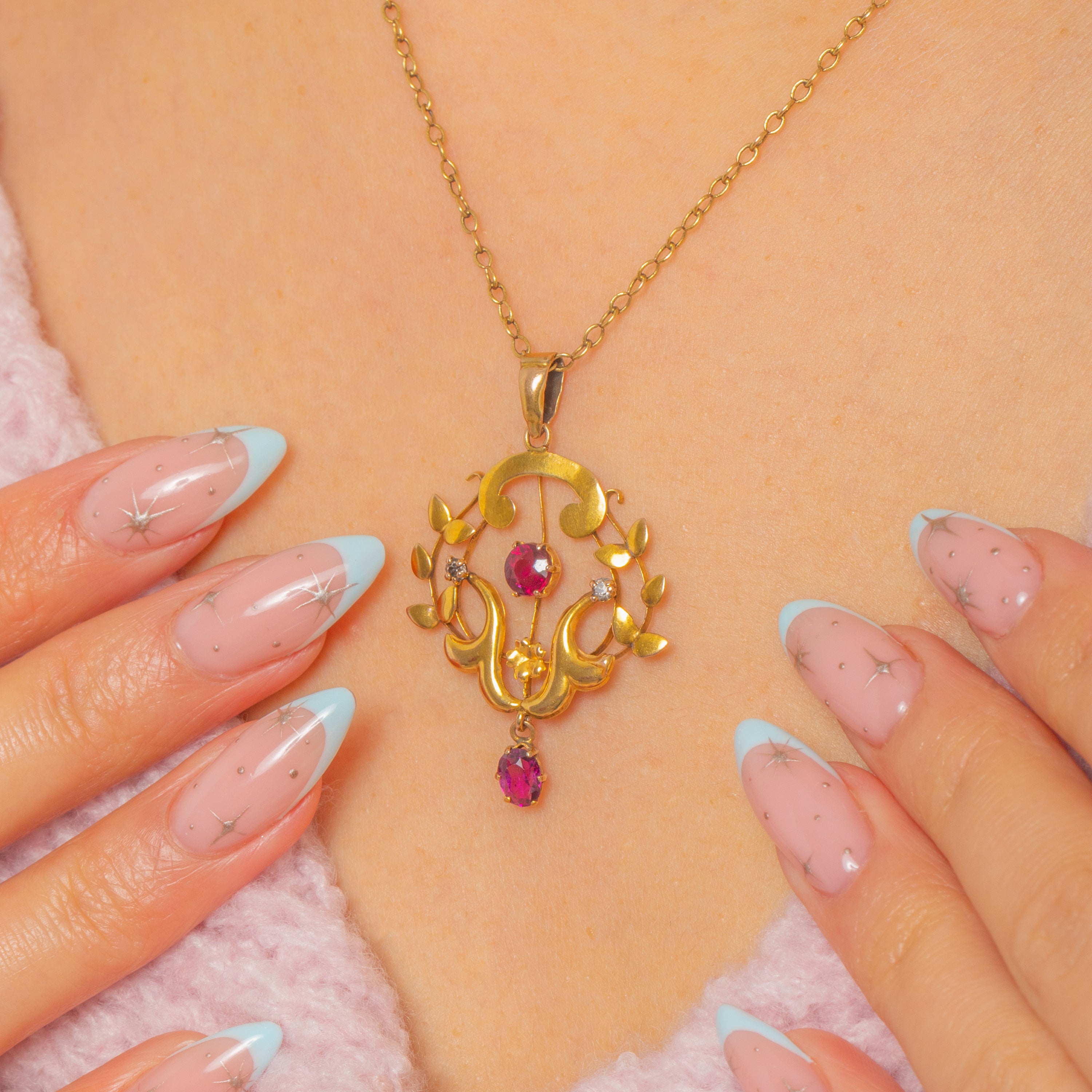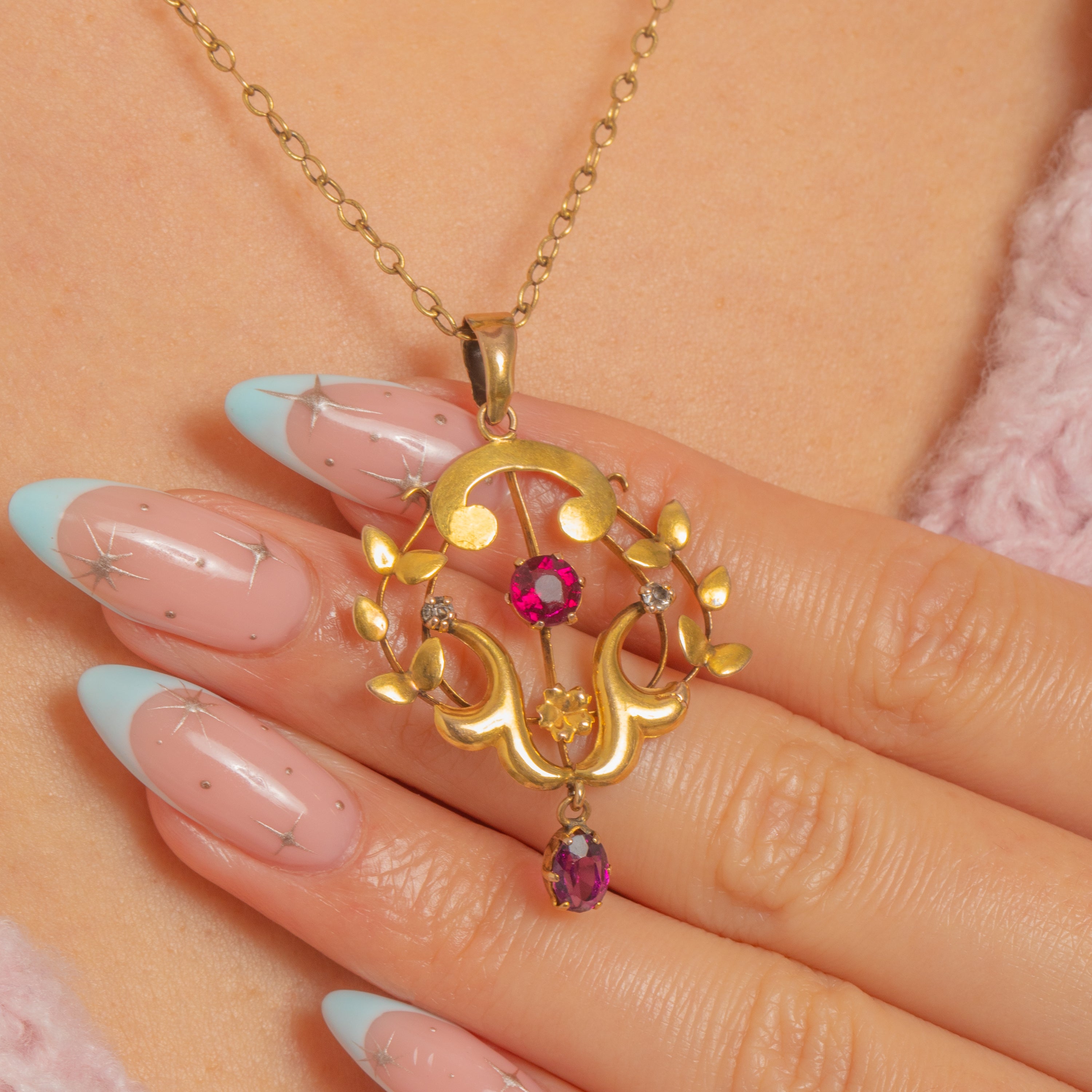 A graceful Edwardian garland pendant crafted in 9ct Gold, its openwork foliate wreath alive with flowing whiplash scrolls and delicate leafy sprays. At the heart glows a vivid round Red Paste, while two dainty Rock Crystal accents add a cool, sparkling lift. An articulated oval Garnet drop completes the composition, adding a soft, romantic movement as it catches the light.