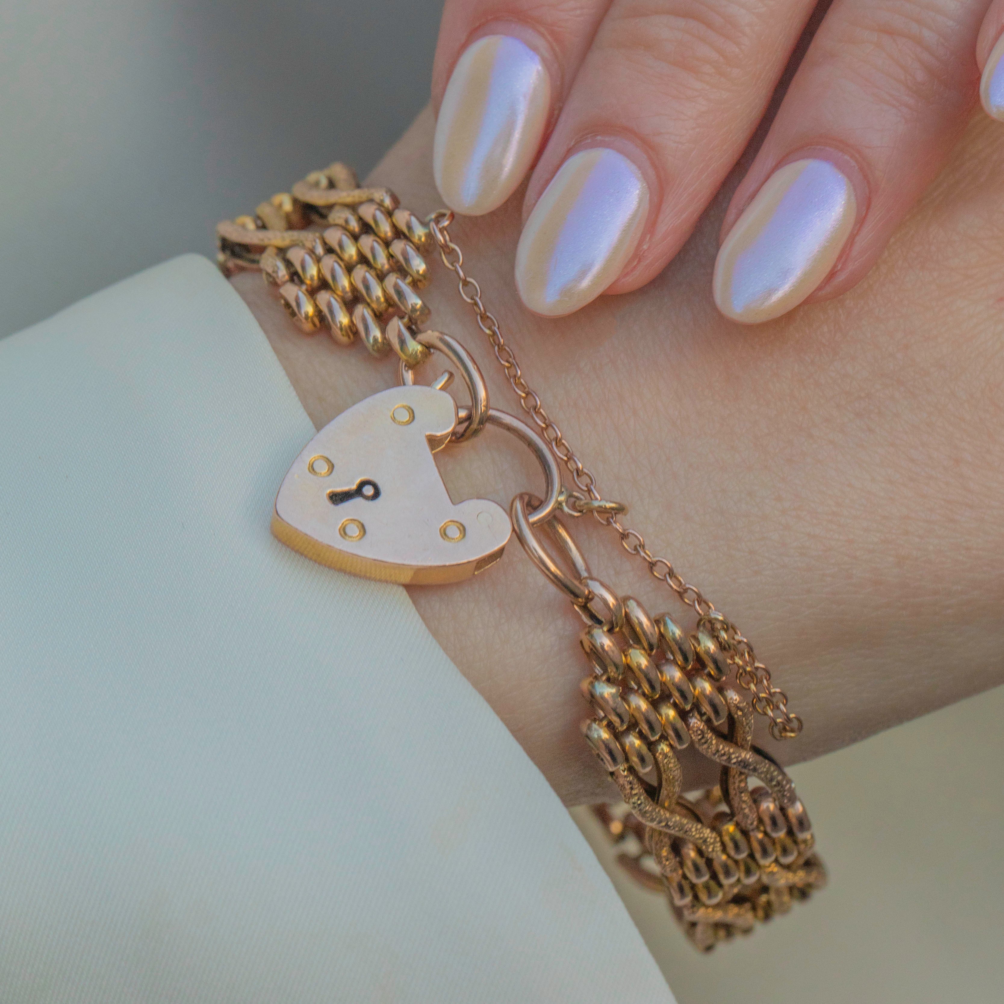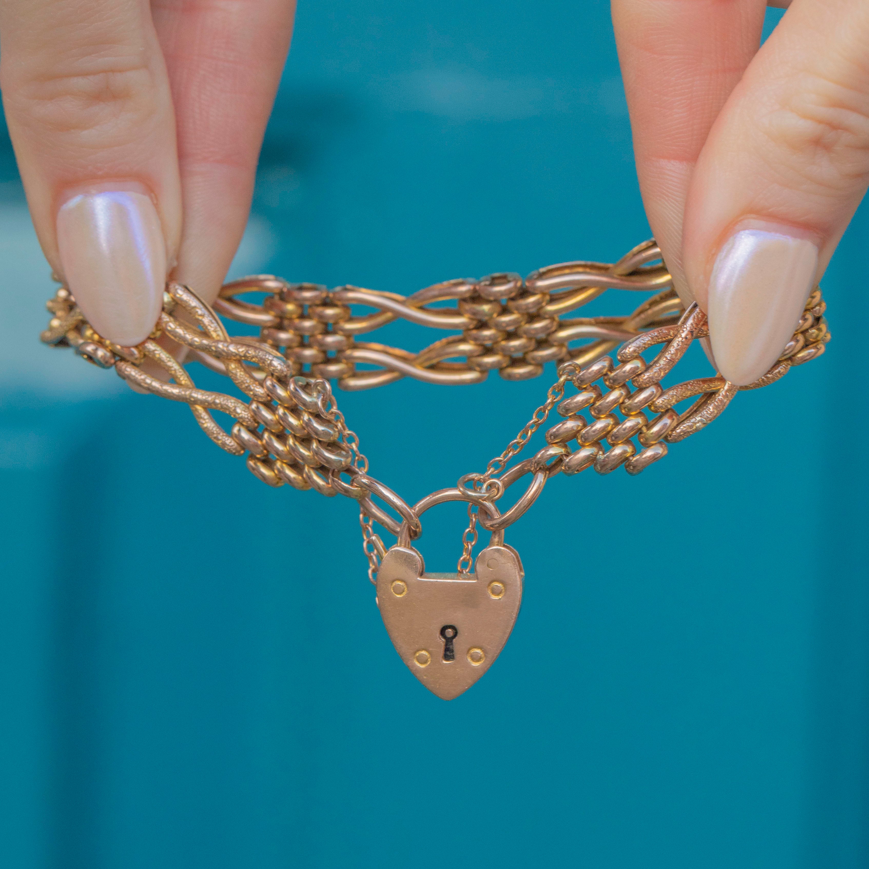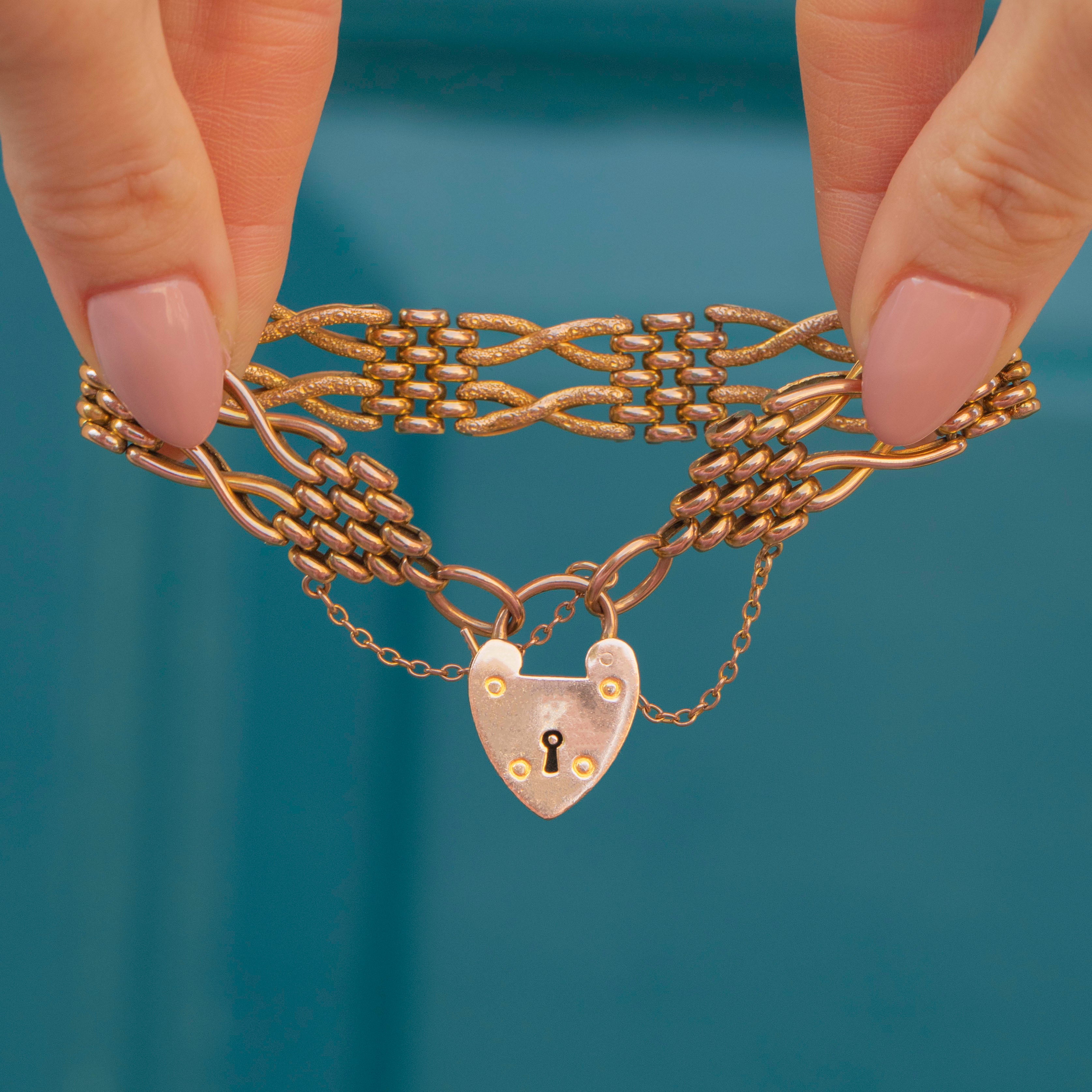 EXCELLENT. We are pleased to present this Edwardian 9ct Gold gate bracelet in excellent condition. Her smooth, saturated gate links are secure and without any visible signs of wear. Her heart padlock is additionally in great working order, allowing for comfortable and confident wear. In such brilliant condition, this antique delight is a must-have!