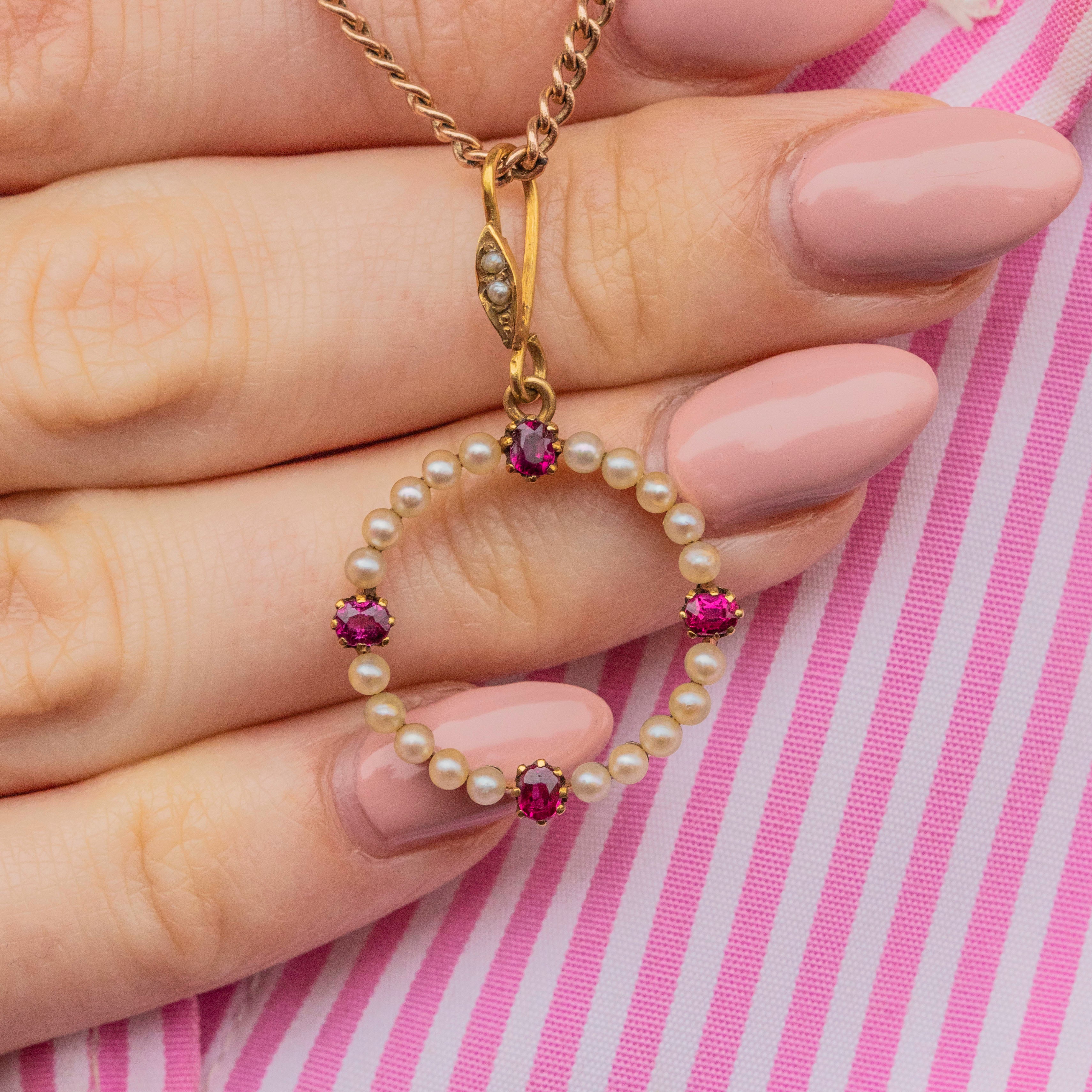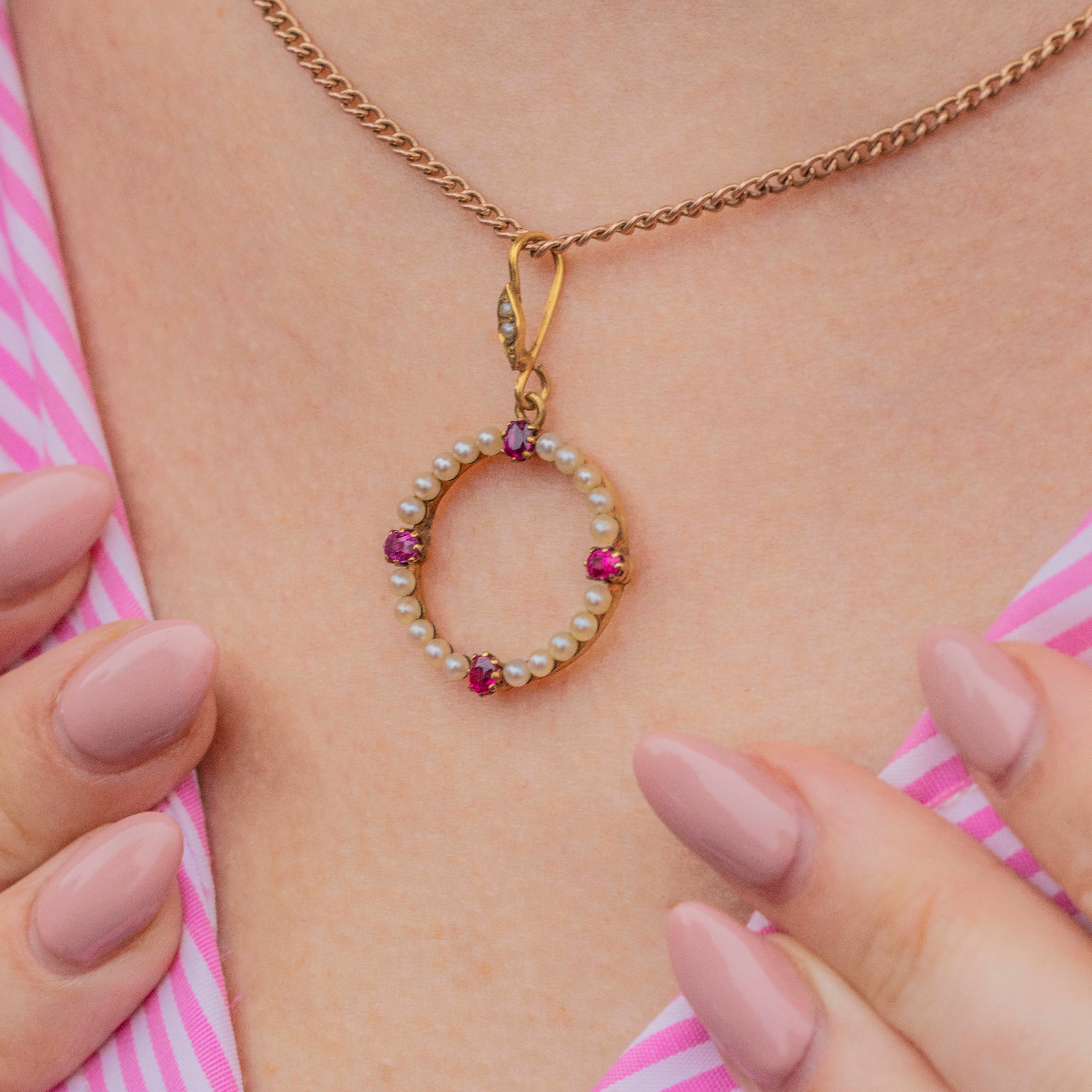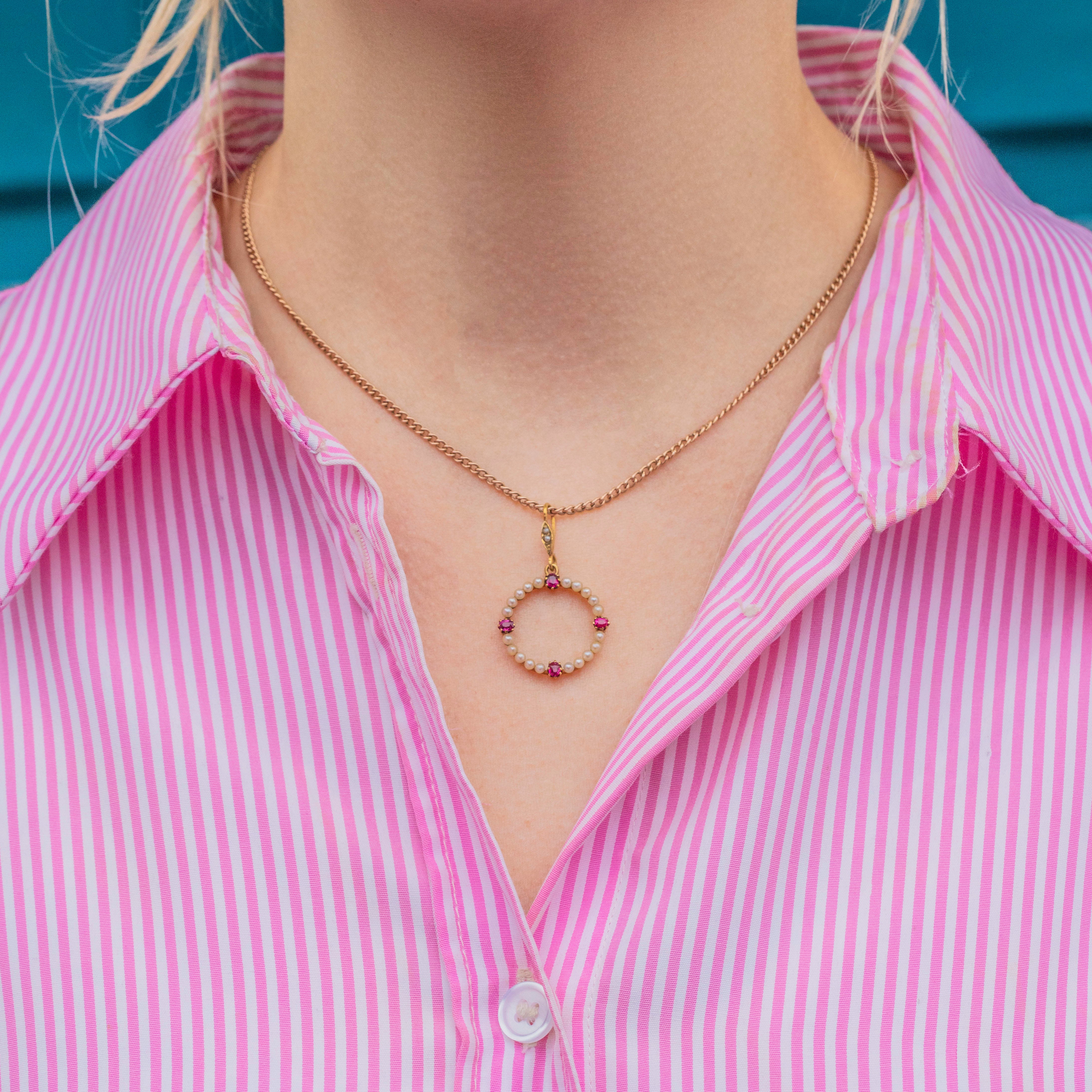 You won't be able to get enough of this Edwardian 9ct Gold pink Tourmaline Pearl pendant! Her endearing design is formed of a single circle of shimmering Pearls, intertwined with a fuchsia pink Tourmaline at every quarter.