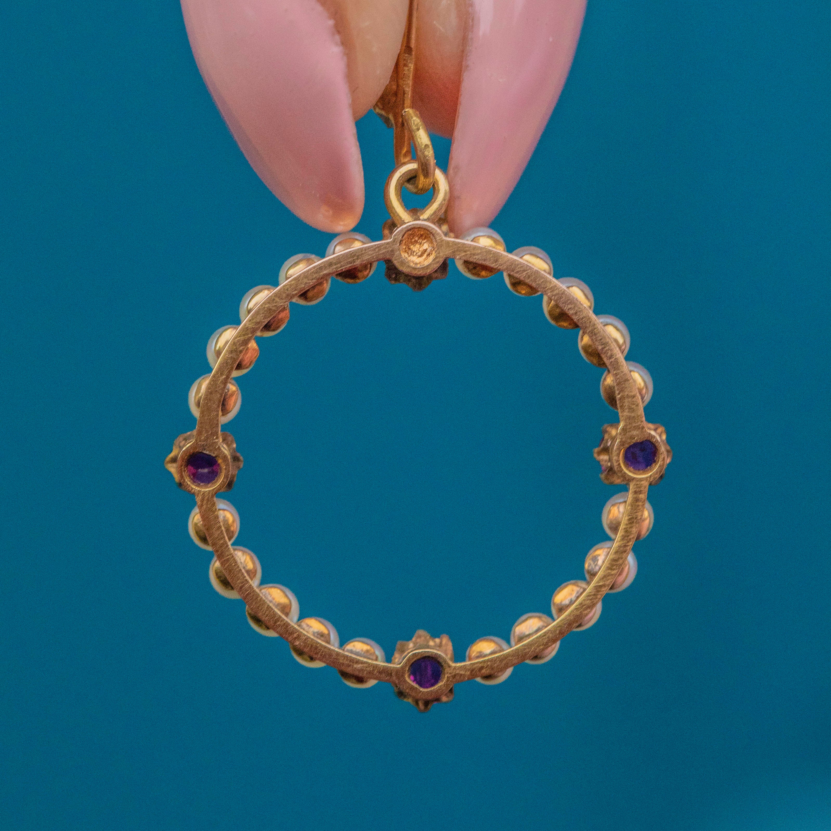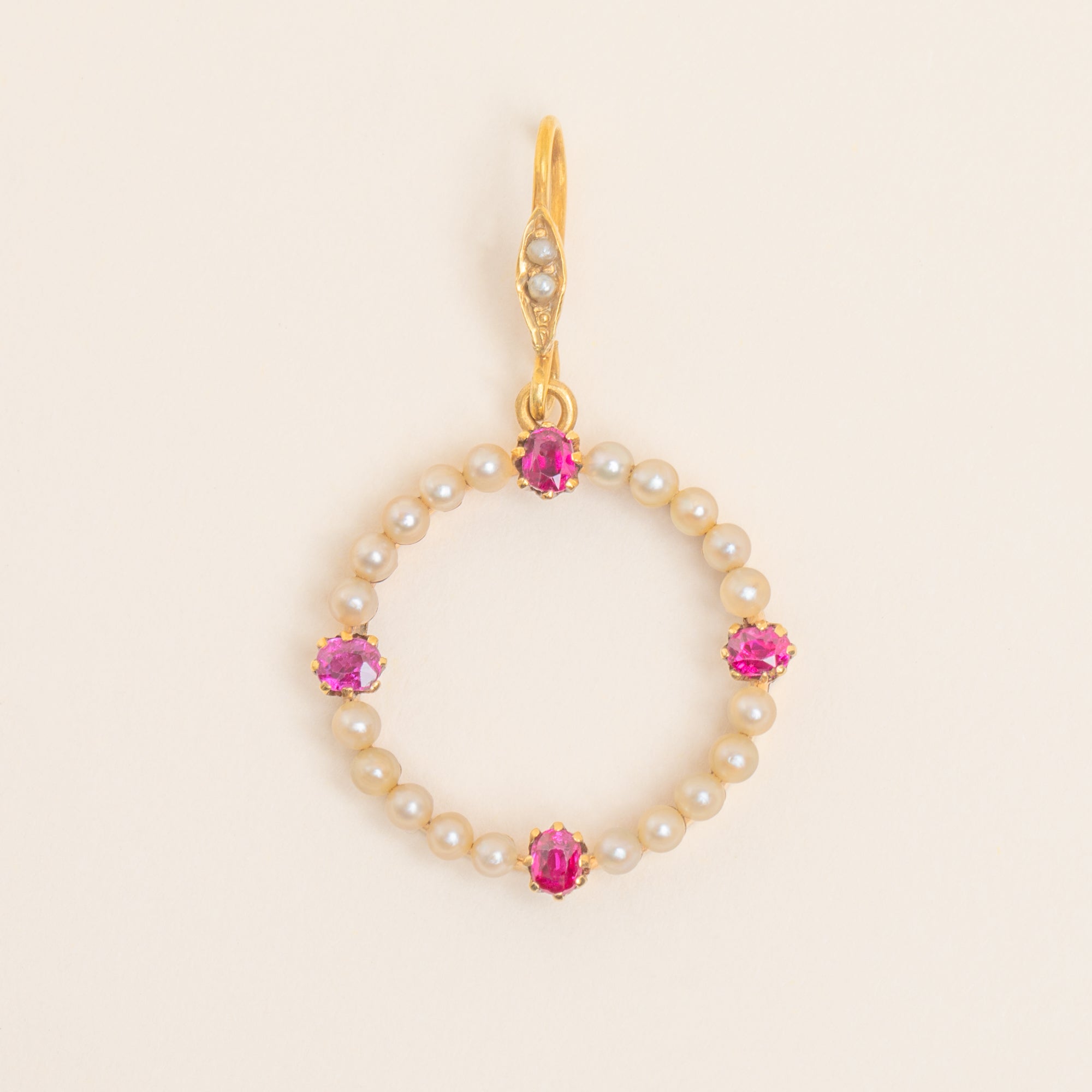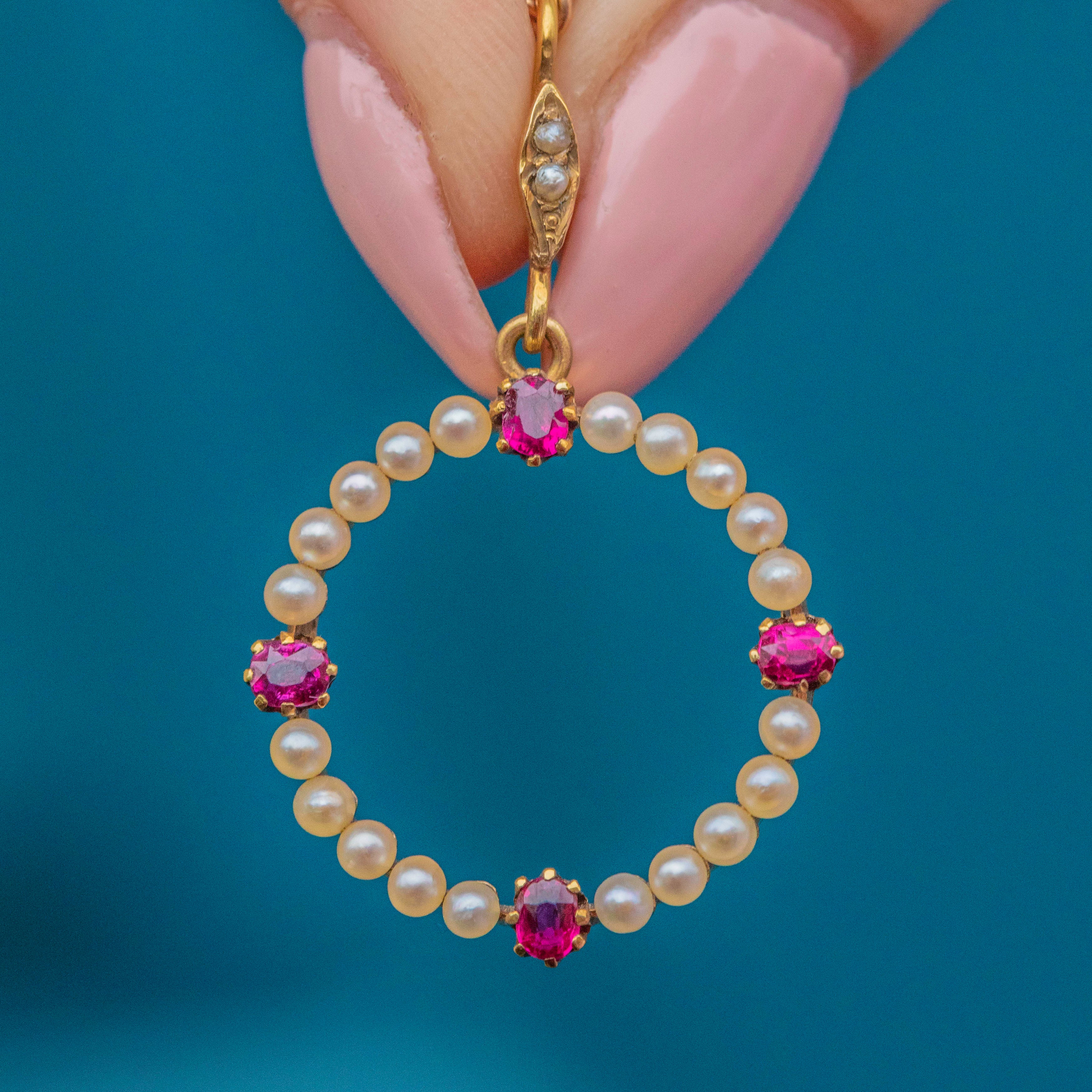 You won't be able to get enough of this Edwardian 9ct Gold pink Tourmaline Pearl pendant! Her endearing design is formed of a single circle of shimmering Pearls, intertwined with a fuchsia pink Tourmaline at every quarter.