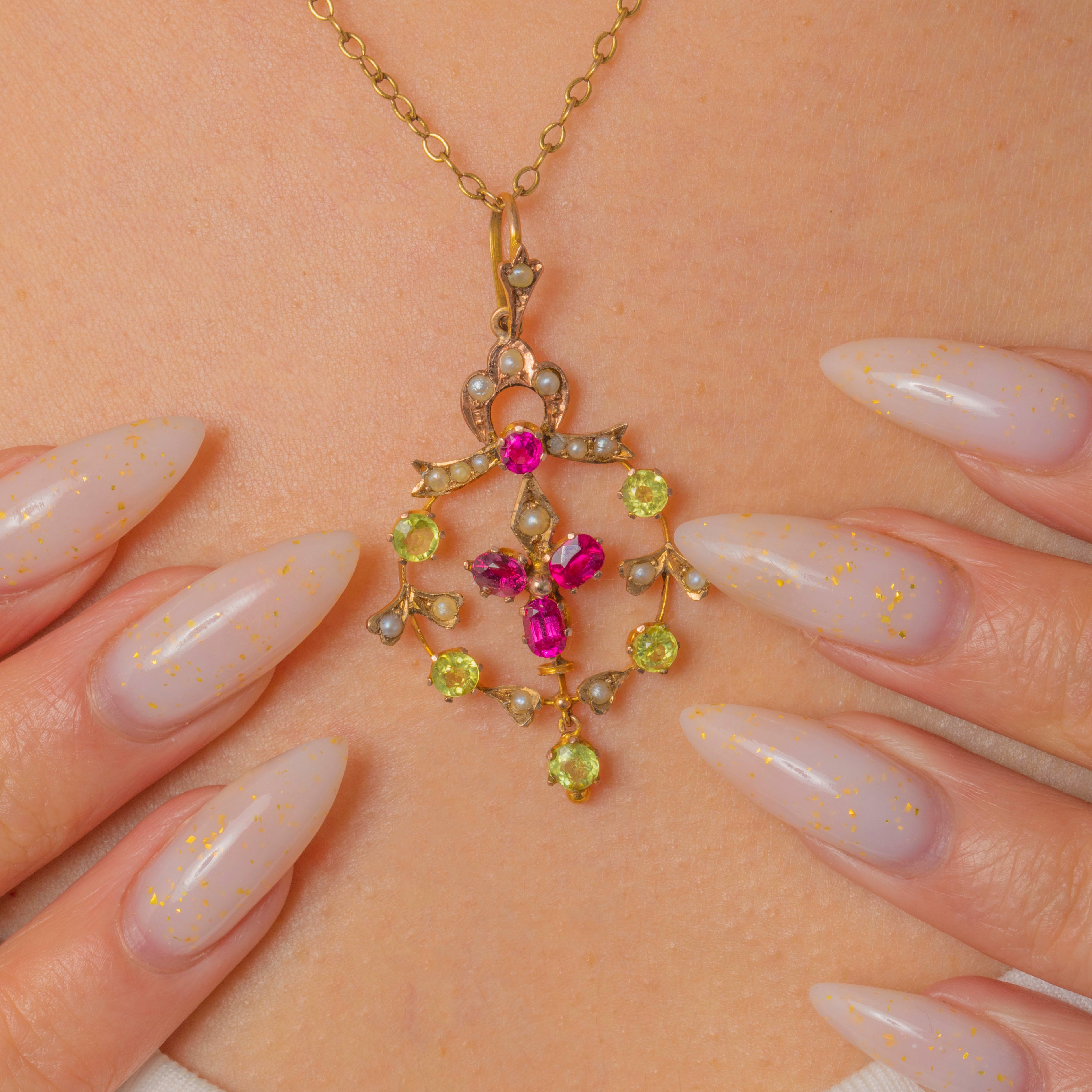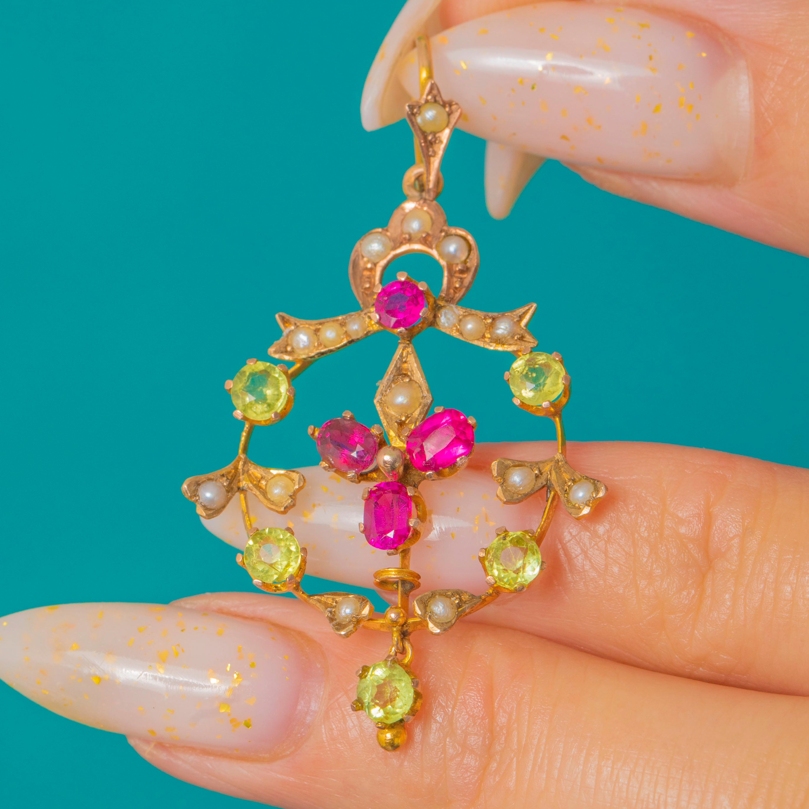 Graceful and romantic, this Edwardian pendant unfurls in sinuous foliate openwork, its warm 15ct Gold lending a soft antique glow. A lively arrangement of Synthetic Rubies and a bright Peridot is accented with delicate Pearls, while the articulated drop adds a flutter of movement with every step.