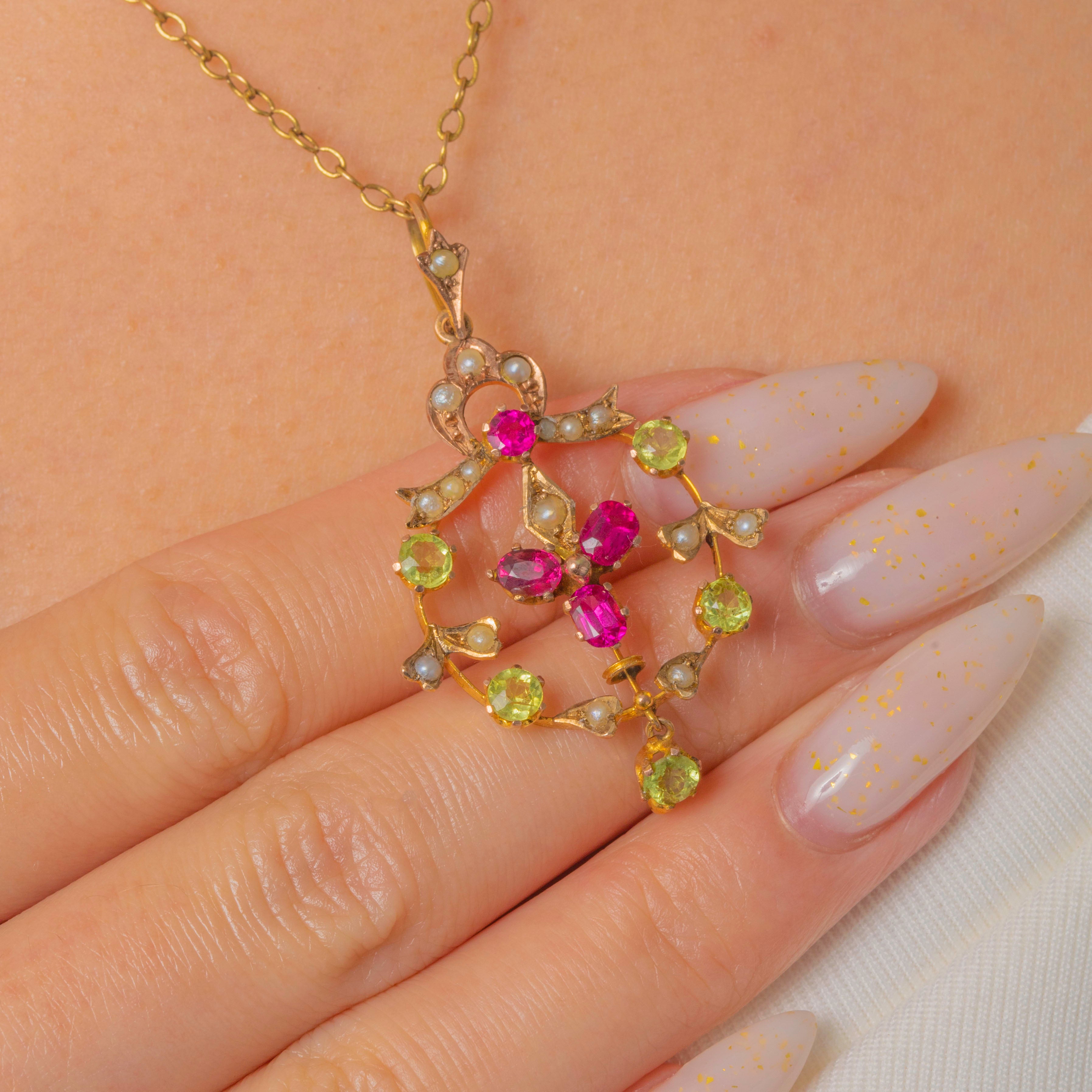Edwardian 9ct Gold Ruby Peridot Pearl Garland Pendant