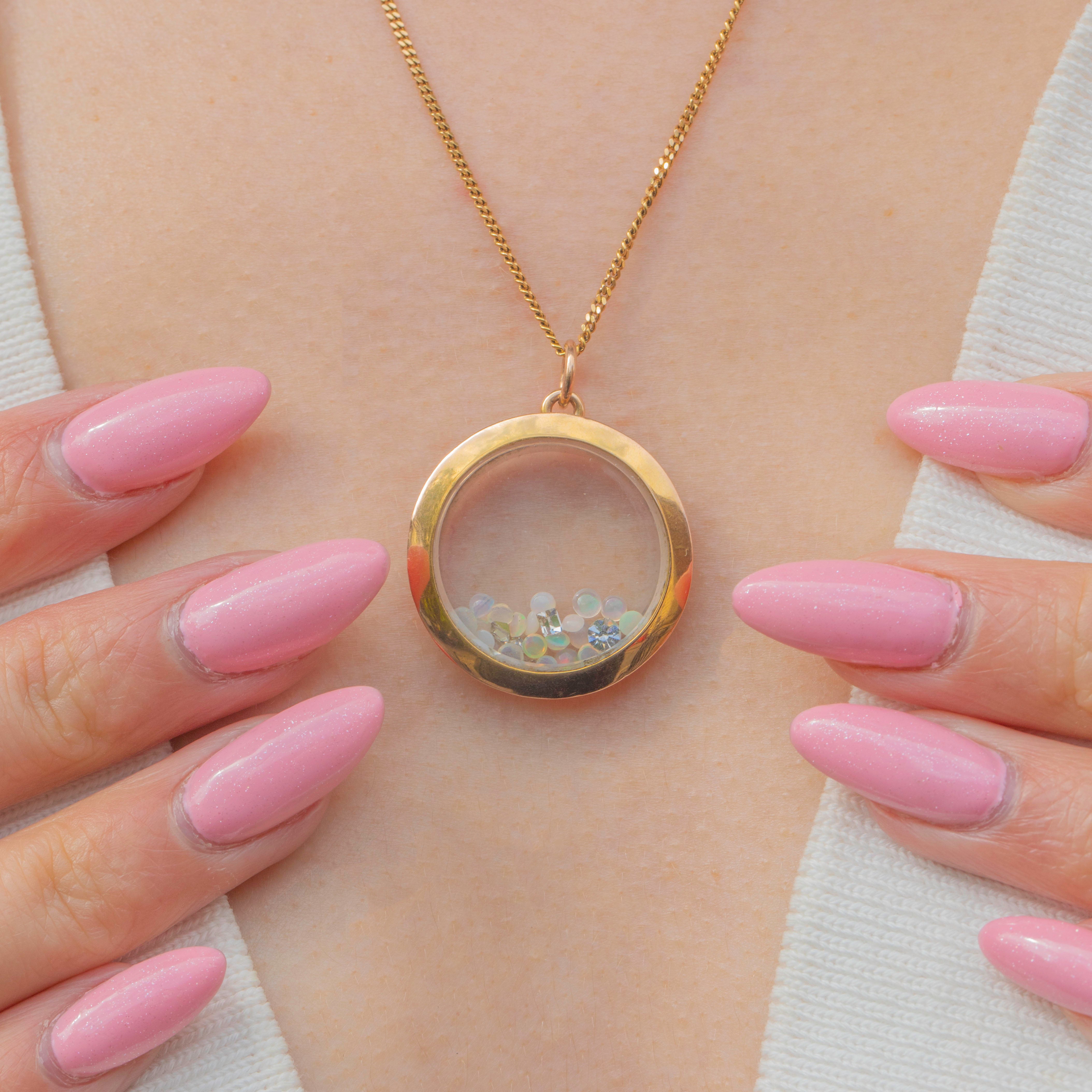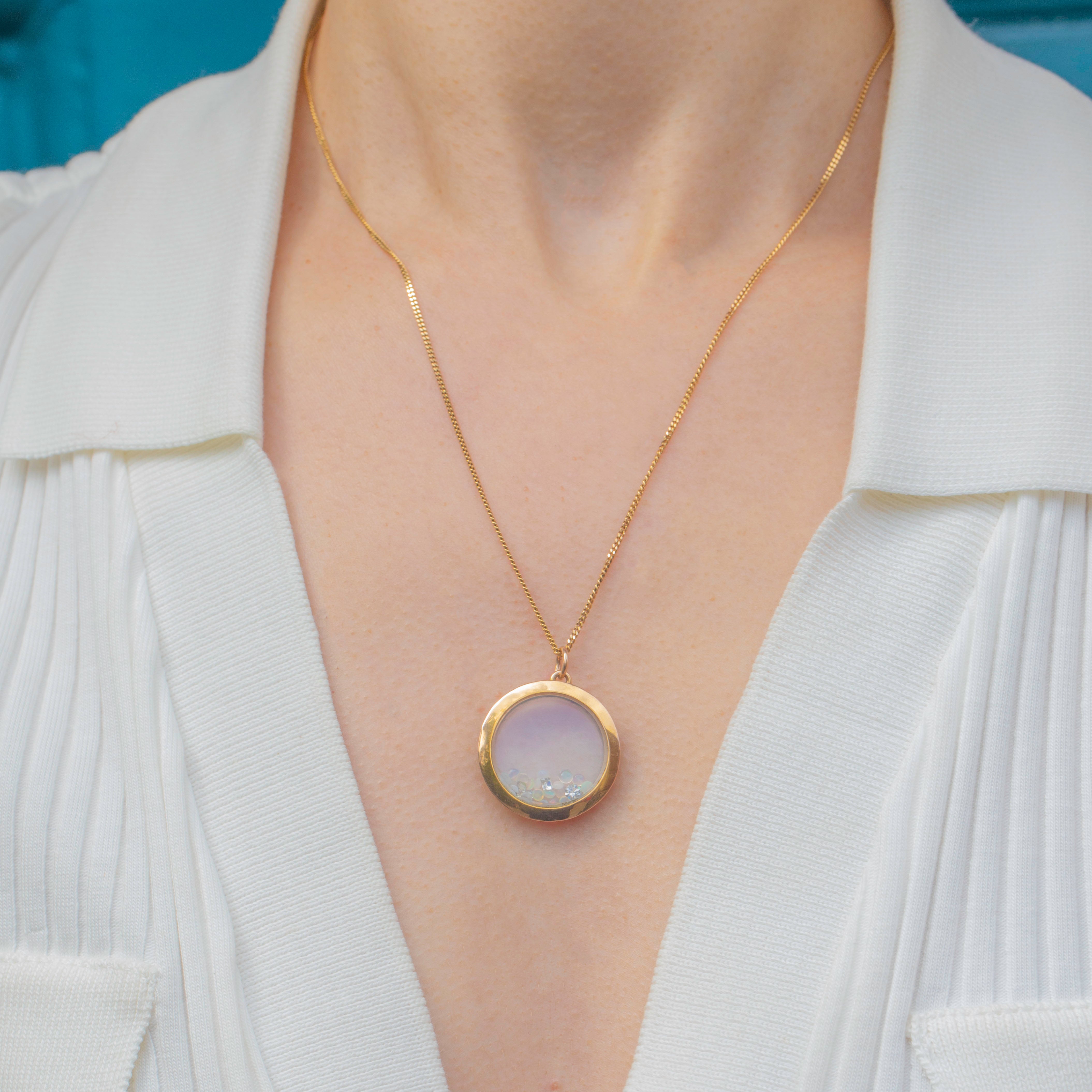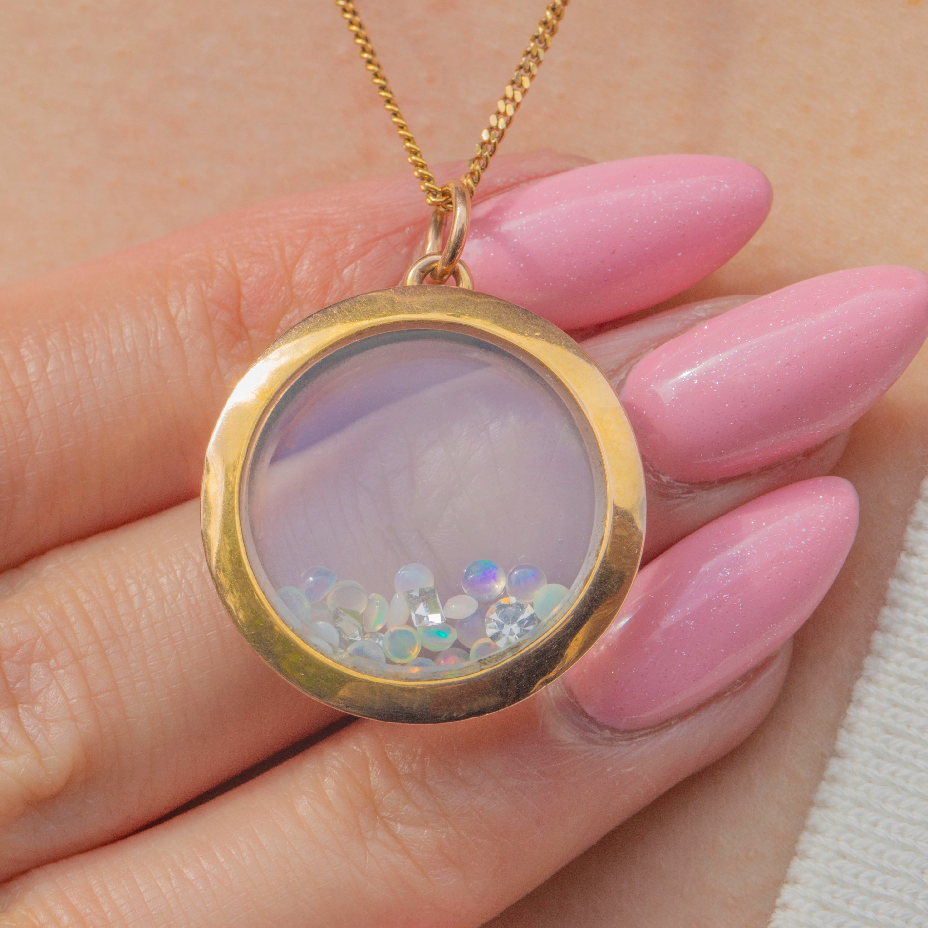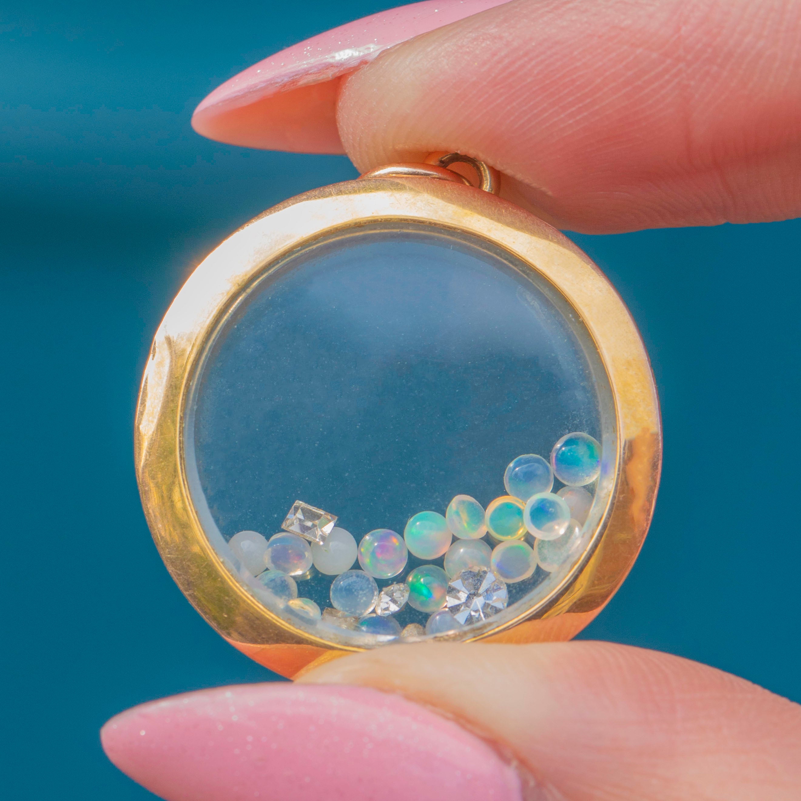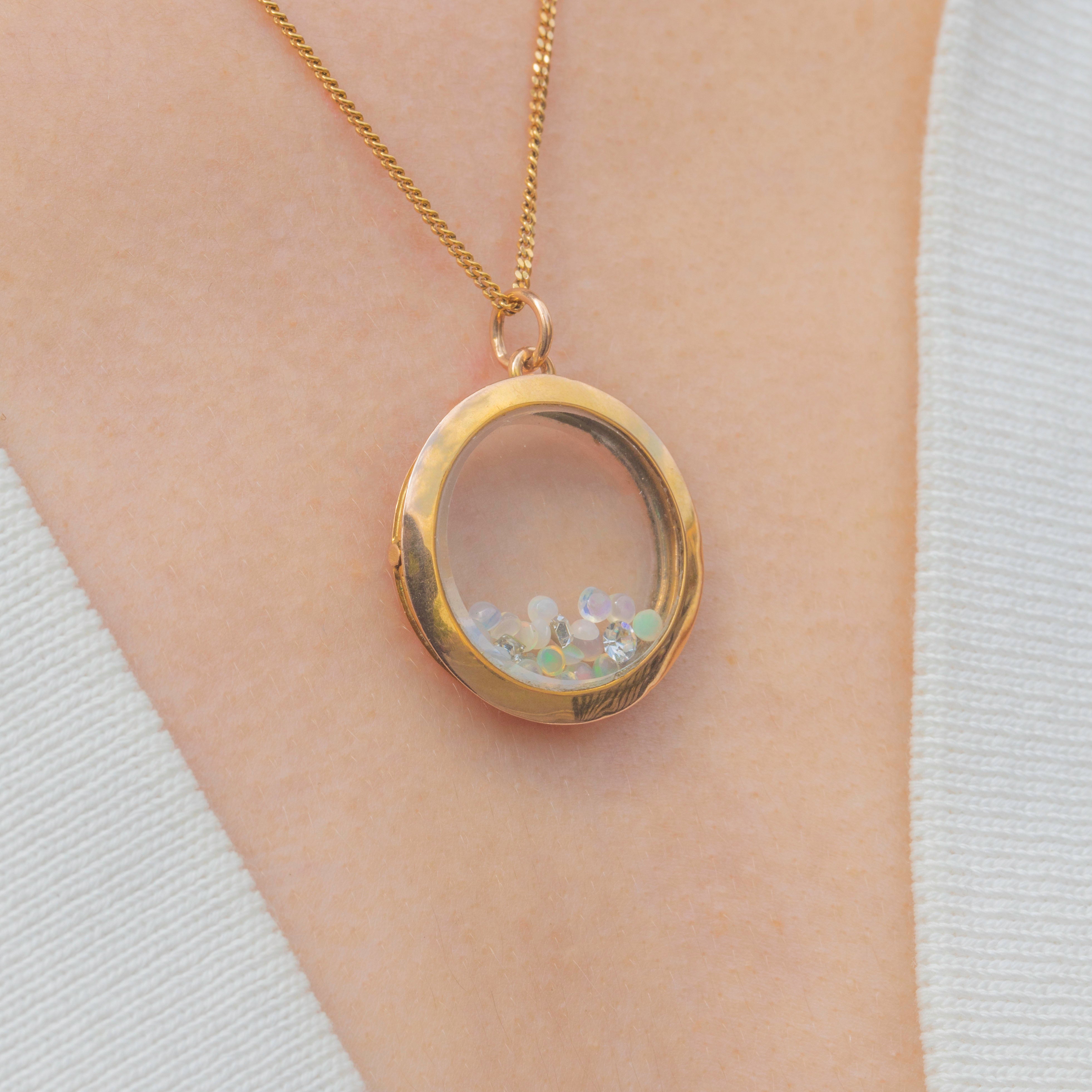 This Edwardian 9ct Gold shaker locket will provide you with endless wearing pleasure! The satisfying, buttery 9ct Gold frame surrounds a glass compartment, filled with a generous helping of loose Opals and Diamond Paste that shimmy effortlessly with every movement.