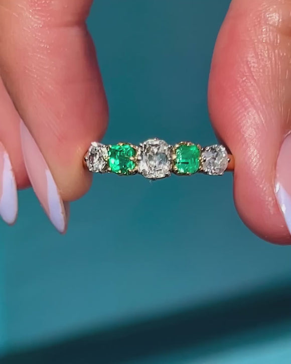 This antique French 18ct Gold Emerald Diamond five stone ring is a feast for the eyes! An impressive example of Edwardian craftsmanship, this ring has been set with two vibrant Emeralds and 0.65cts of dazzling Old-Mine and Old-European cut Diamonds to create a striking five stone display.