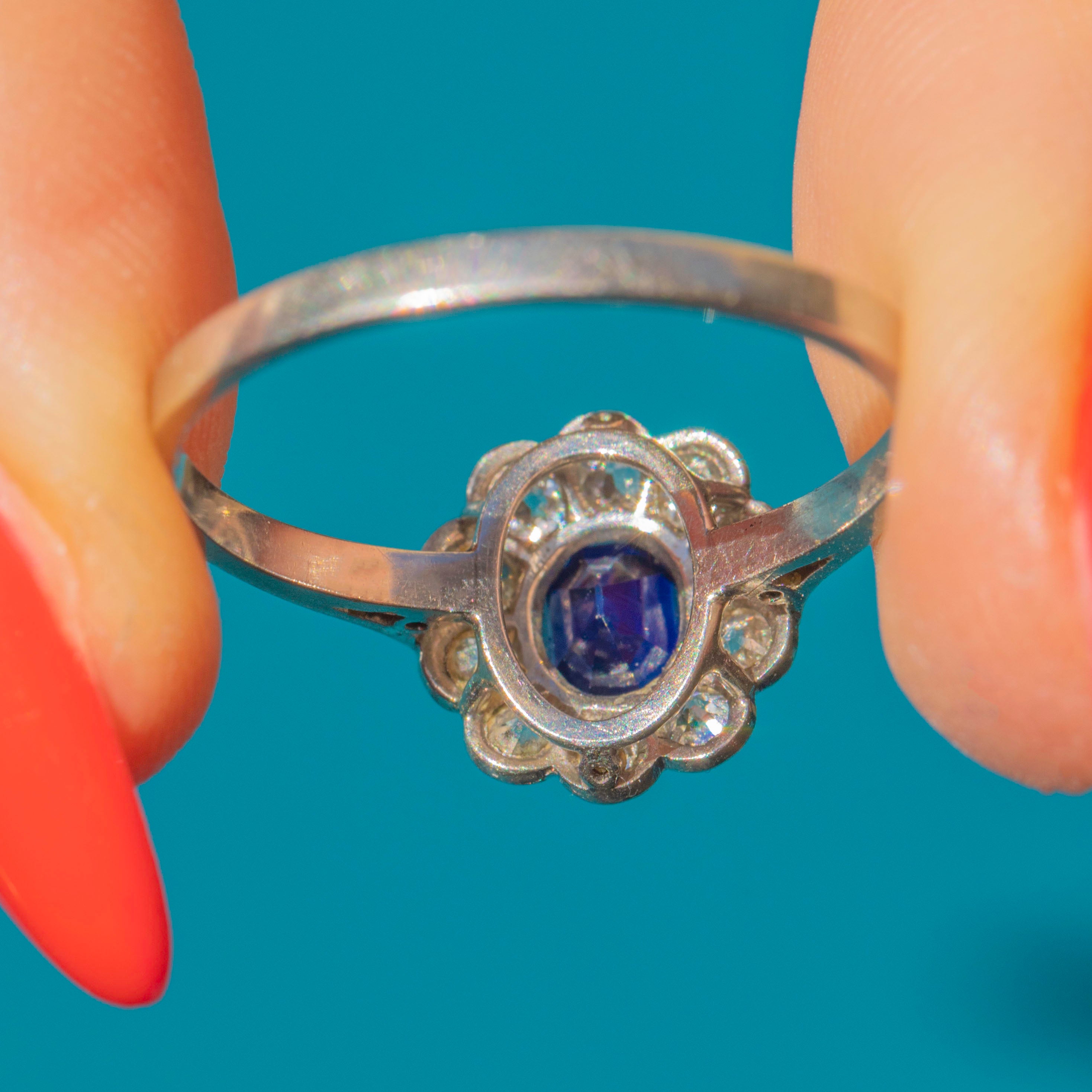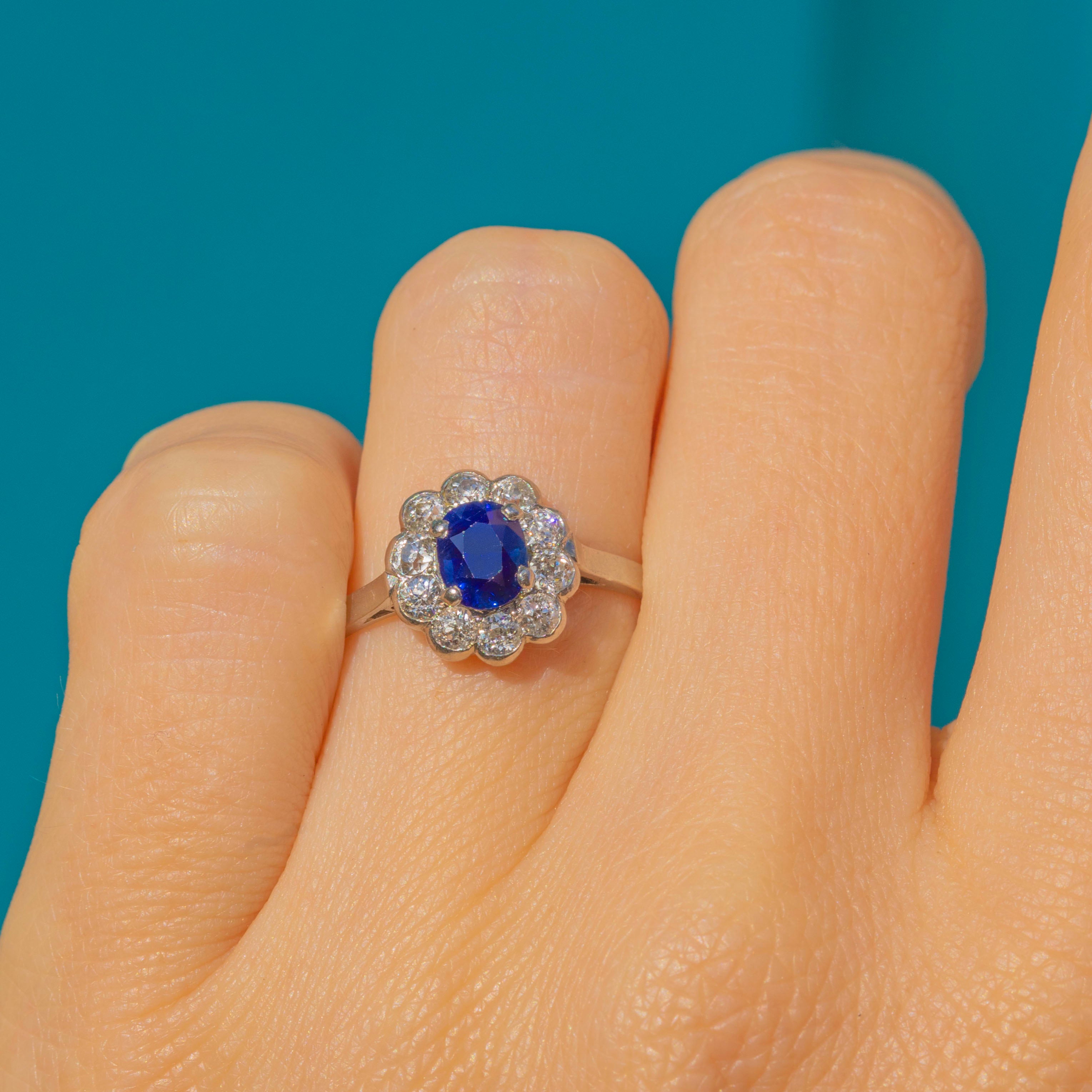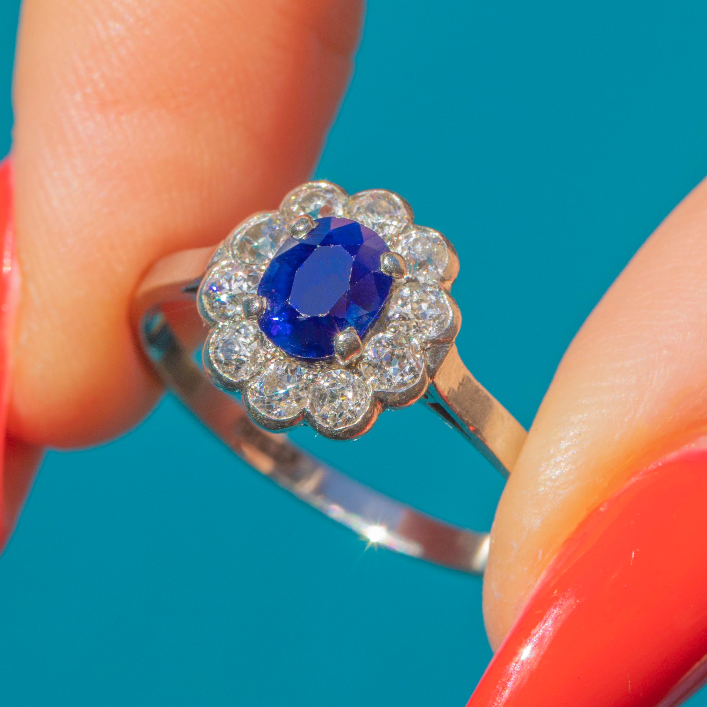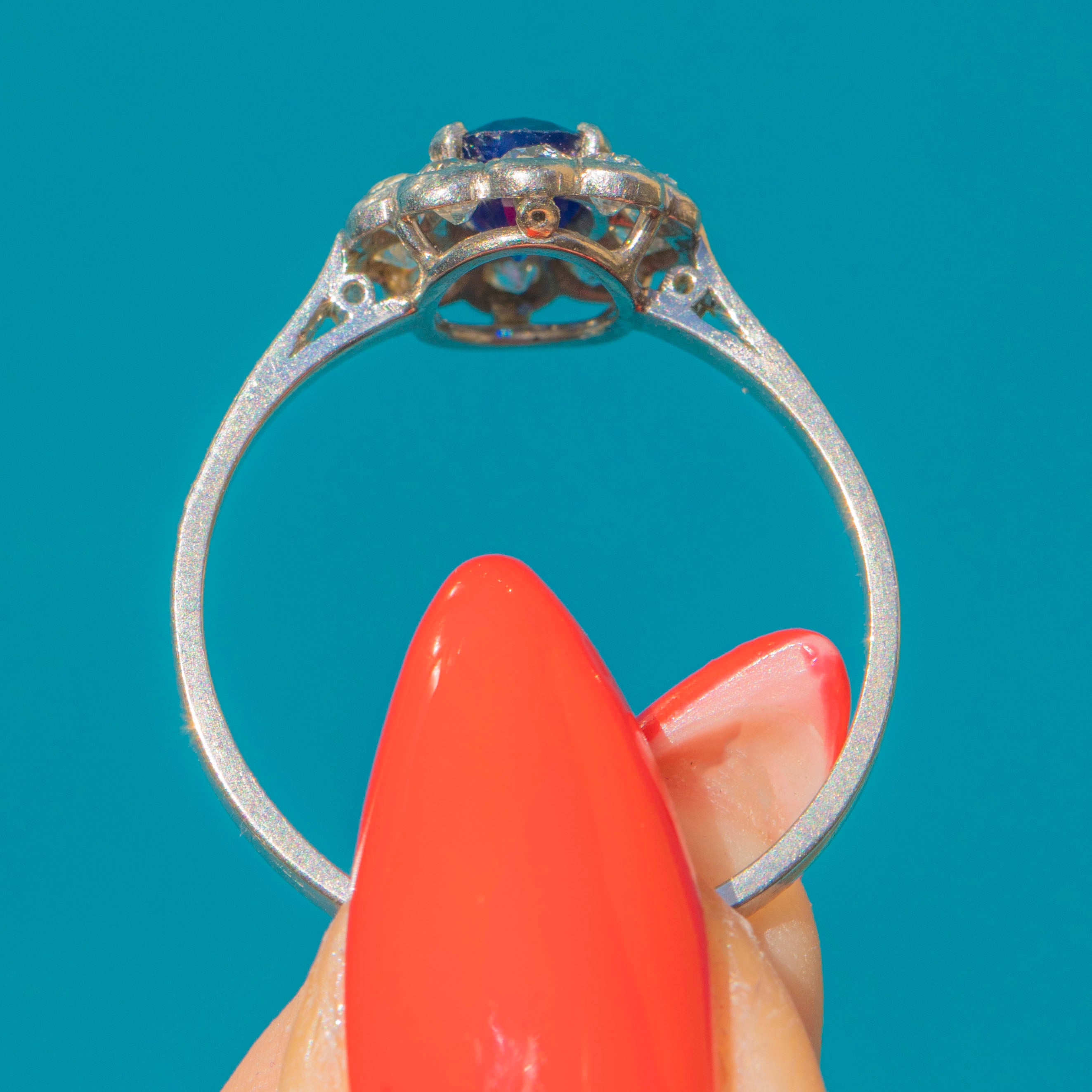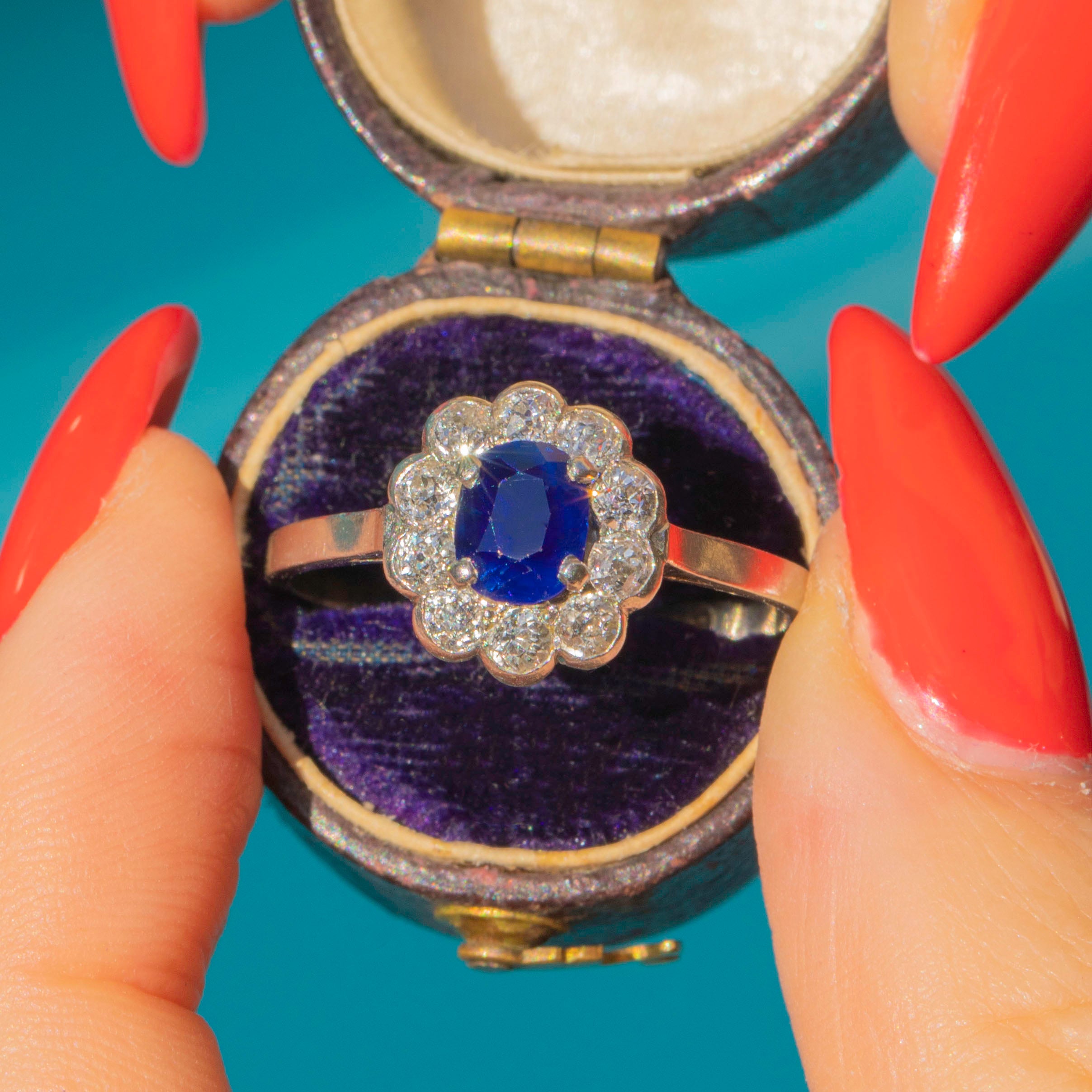 At the centre of the impressive cluster lies a royal blue 0.32ct Natural Sapphire, haloed by ten incredibly charming and bright antique Diamonds.  She is a style classic! Regal, majestic, and would be a superb choice for a unique engagement ring.