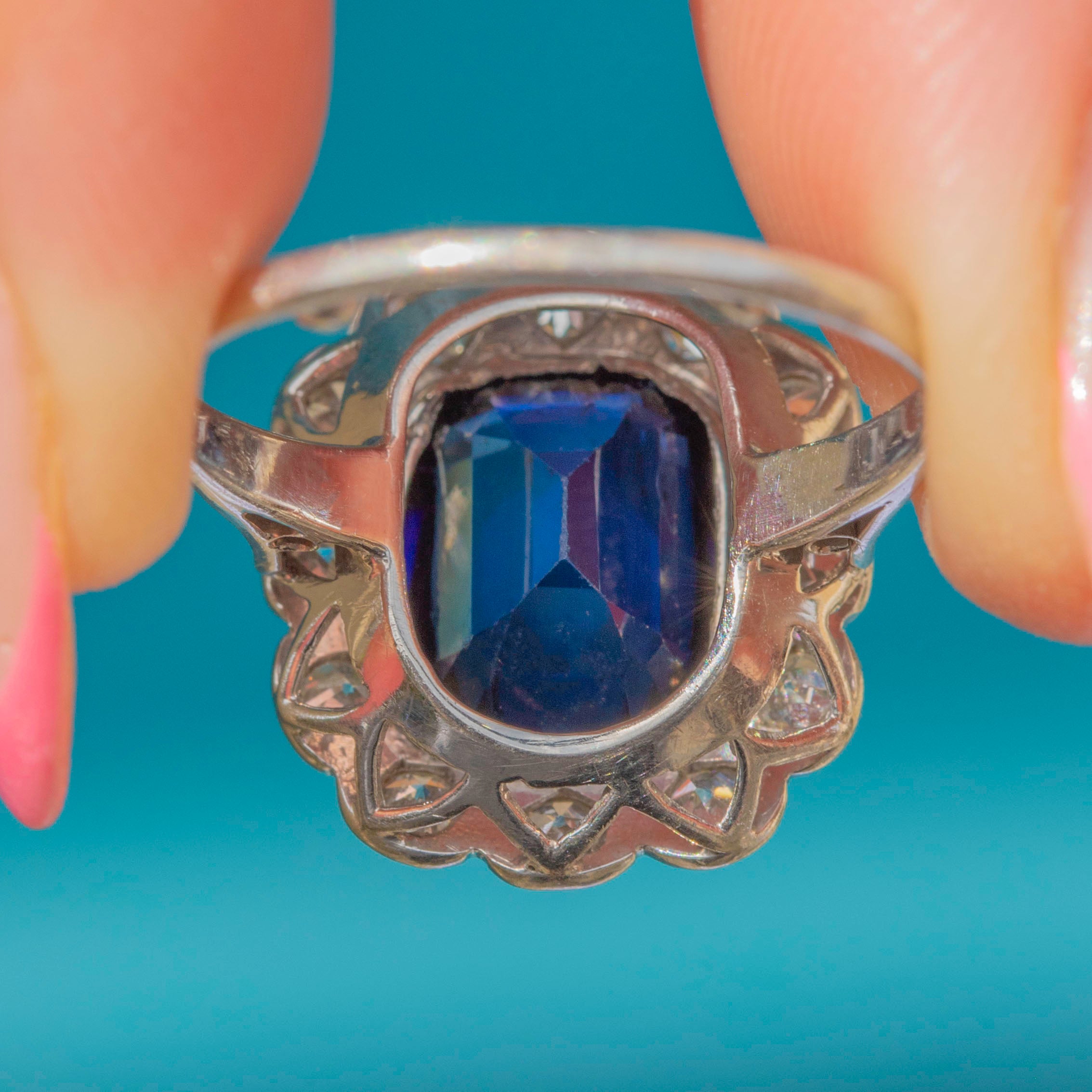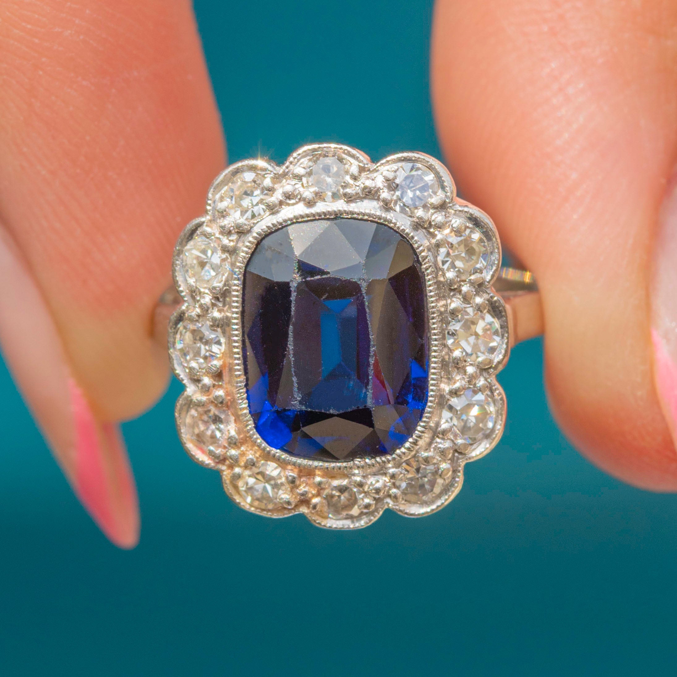 The sizable 2.70ct Sapphire is one of the early synthetic Sapphires created during the turn of the century, a technique called flame fusion created by Auguste Verneuil in 1902. The Sapphire will instantly enchant you with its mesmerising deep Royal blue hue, haloed by twelve scintillating old-cut Diamonds, creating a spectacular display of sparkles under the light. This timeless Edwardian cluster ring is a fine investment piece, guaranteed to be treasured for generations to come!