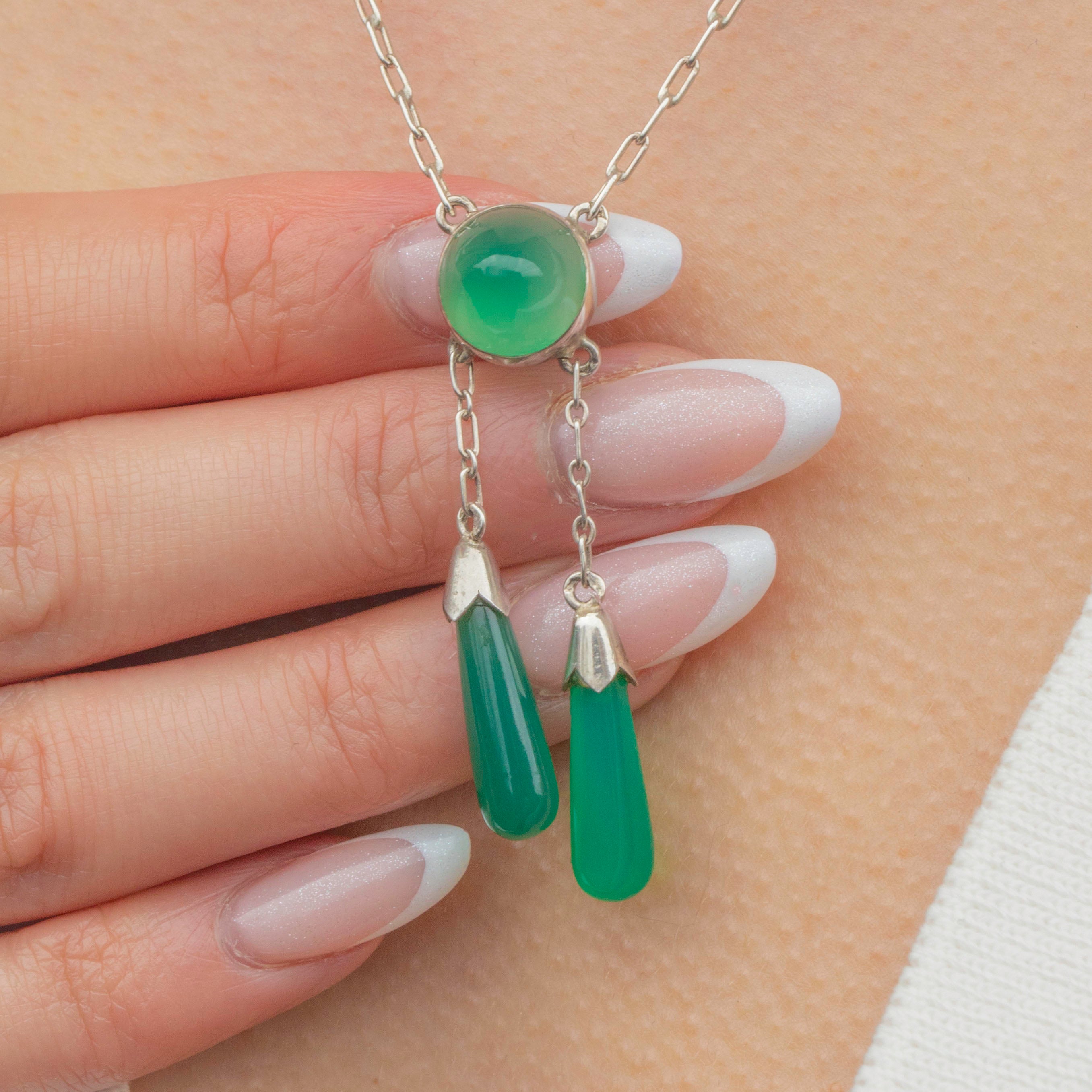 VERY GOOD-EXCELLENT: This Edwardian Silver Chrysoprase negligee necklace is in lovely condition. The Chrysoprase is perfectly smooth, with no chips or scuffs, and are secure within their settings. The Silver settings show some signs of age-related wear, which is noticeable under close inspection and does not impact the integrity of the piece. The links are robust and each component is securely affixed, allowing you to wear this antique Chrysoprase necklace with utmost confidence!