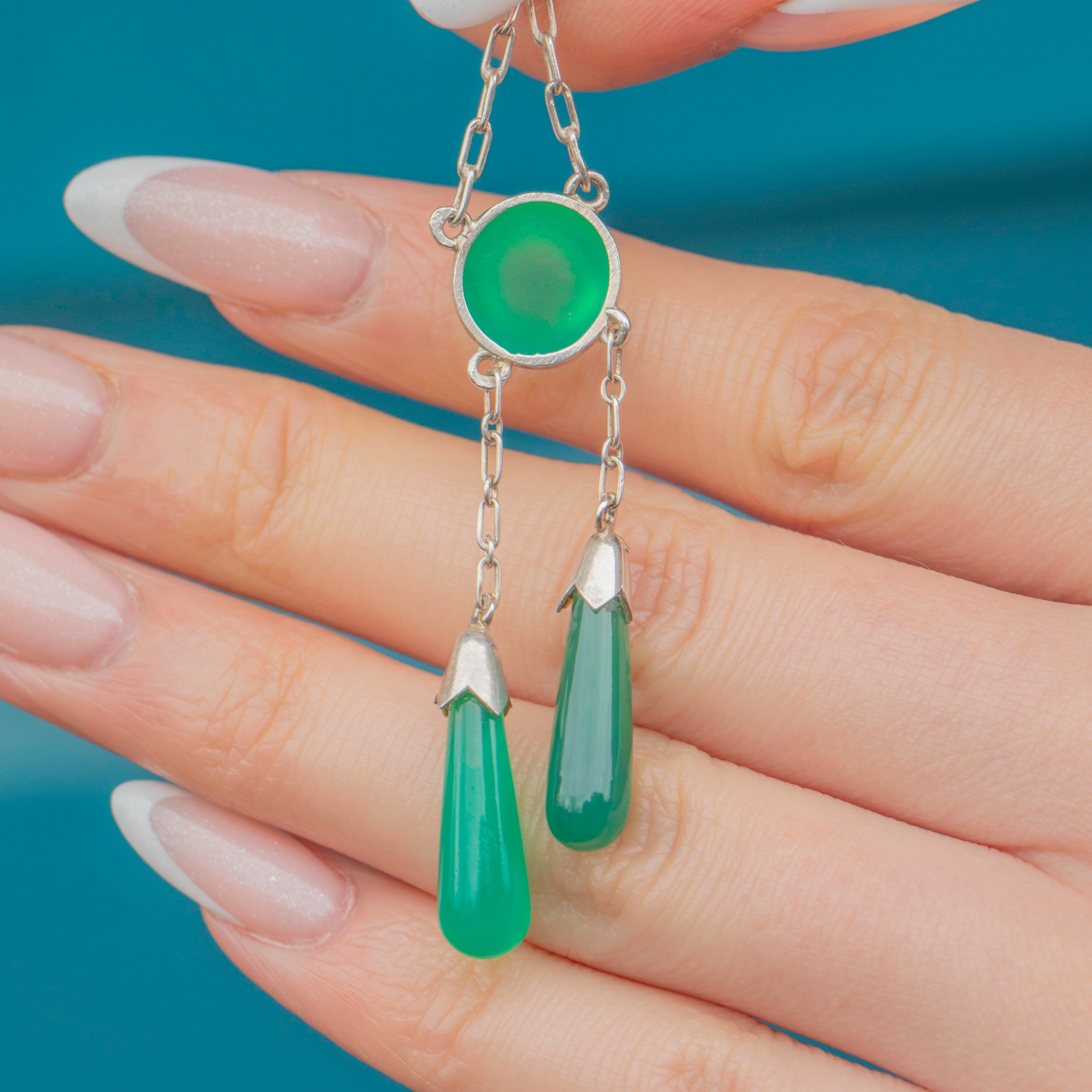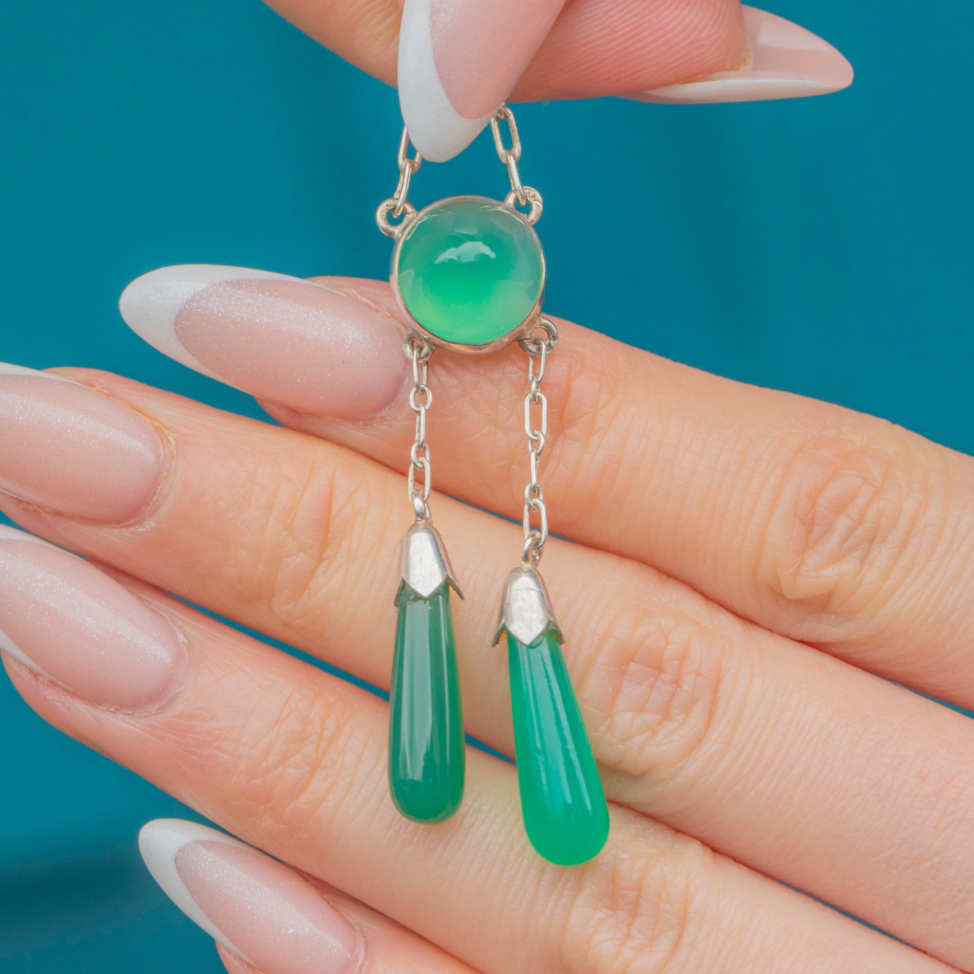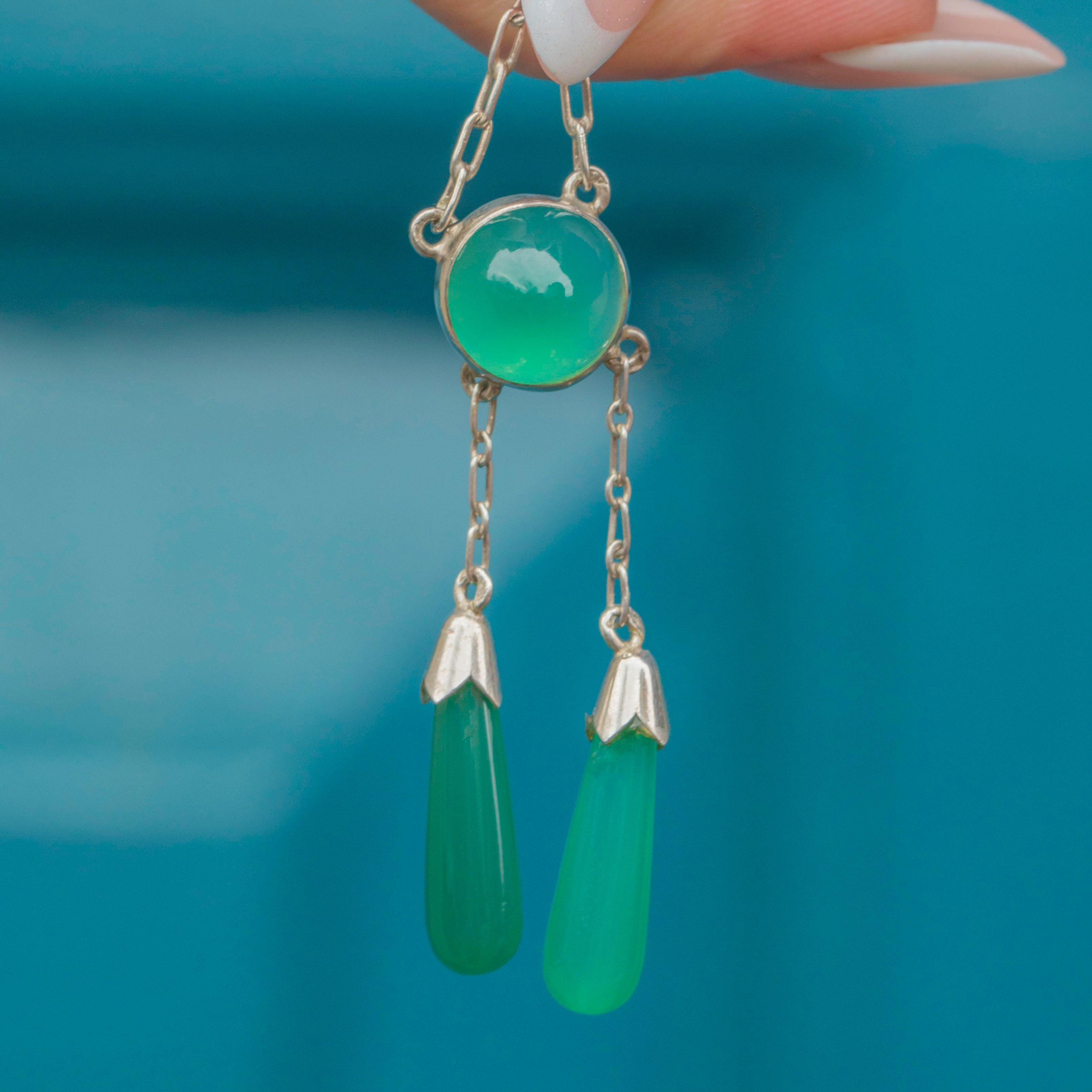 The high-domed Chrysoprase cabochon elegantly suspends two Chrysoprase torpedo drops in a classic negligee design, providing lovely movement and creating a striking silhouette that glows in the light!