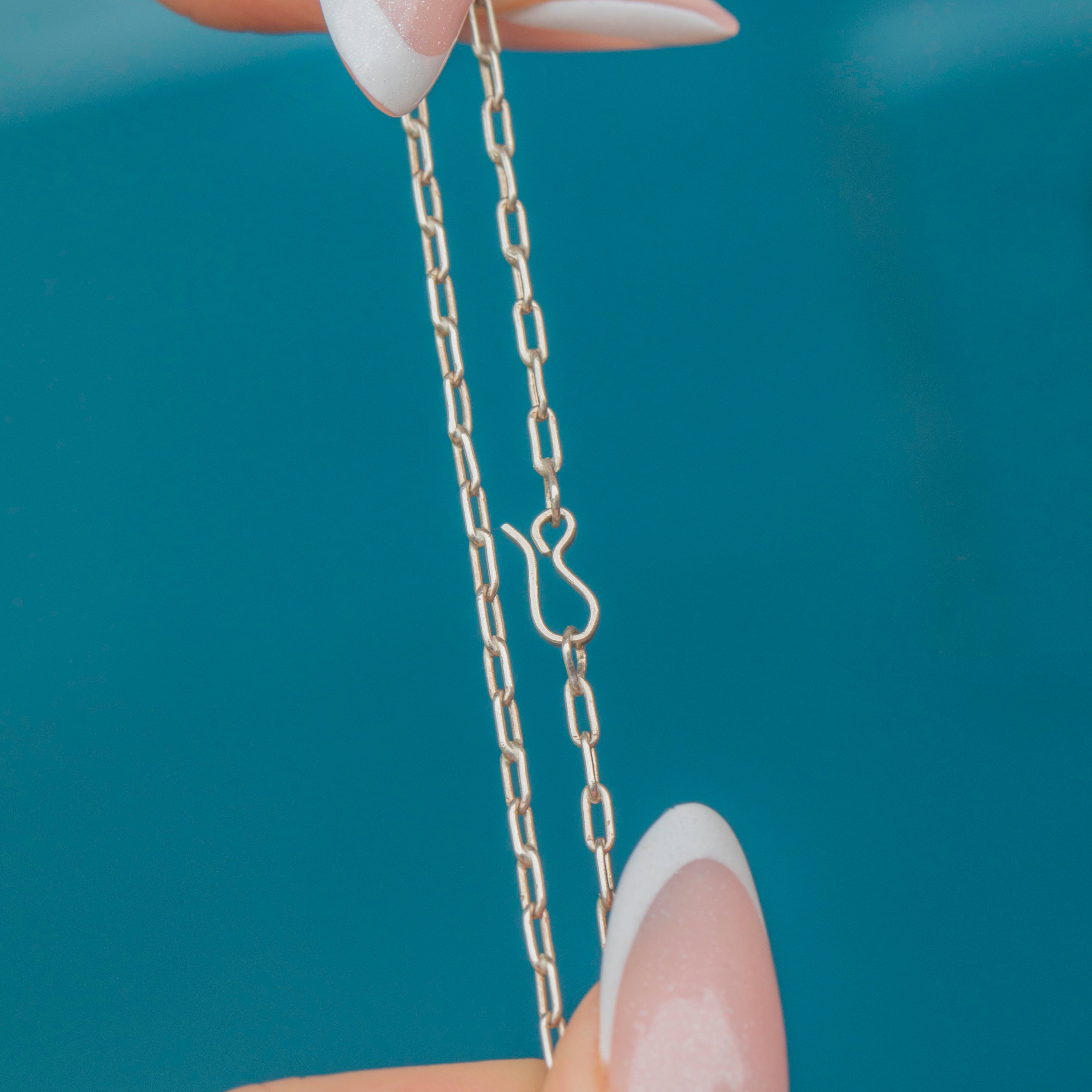 This Edwardian Silver Chrysoprase negligee necklace will bring a fresh pop of colour to your décolletage! The smoothly cut Chrysoprase radiates with minty green hues, perfectly complemented by the Silver settings and rectangular belcher links, giving this necklace a unique edge.