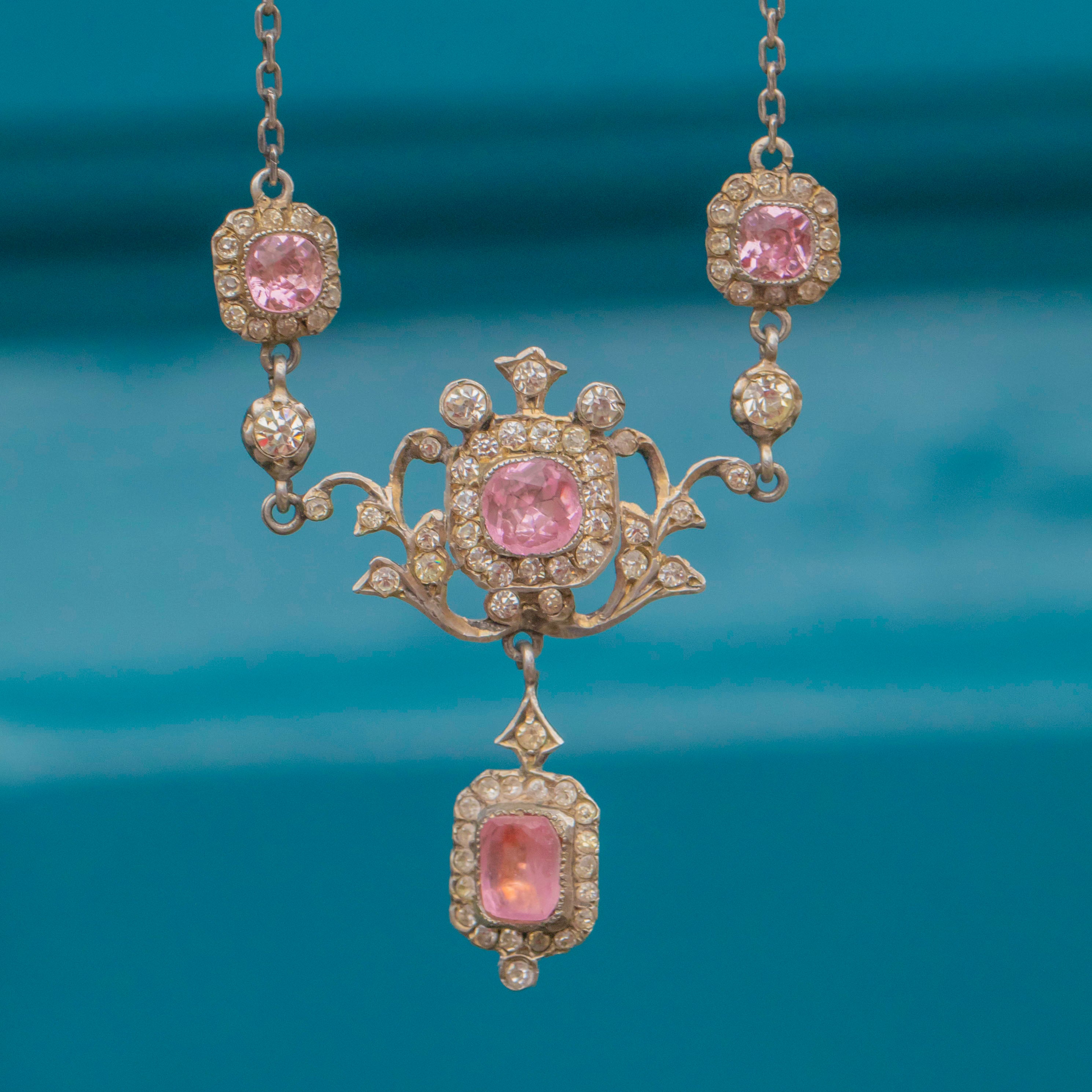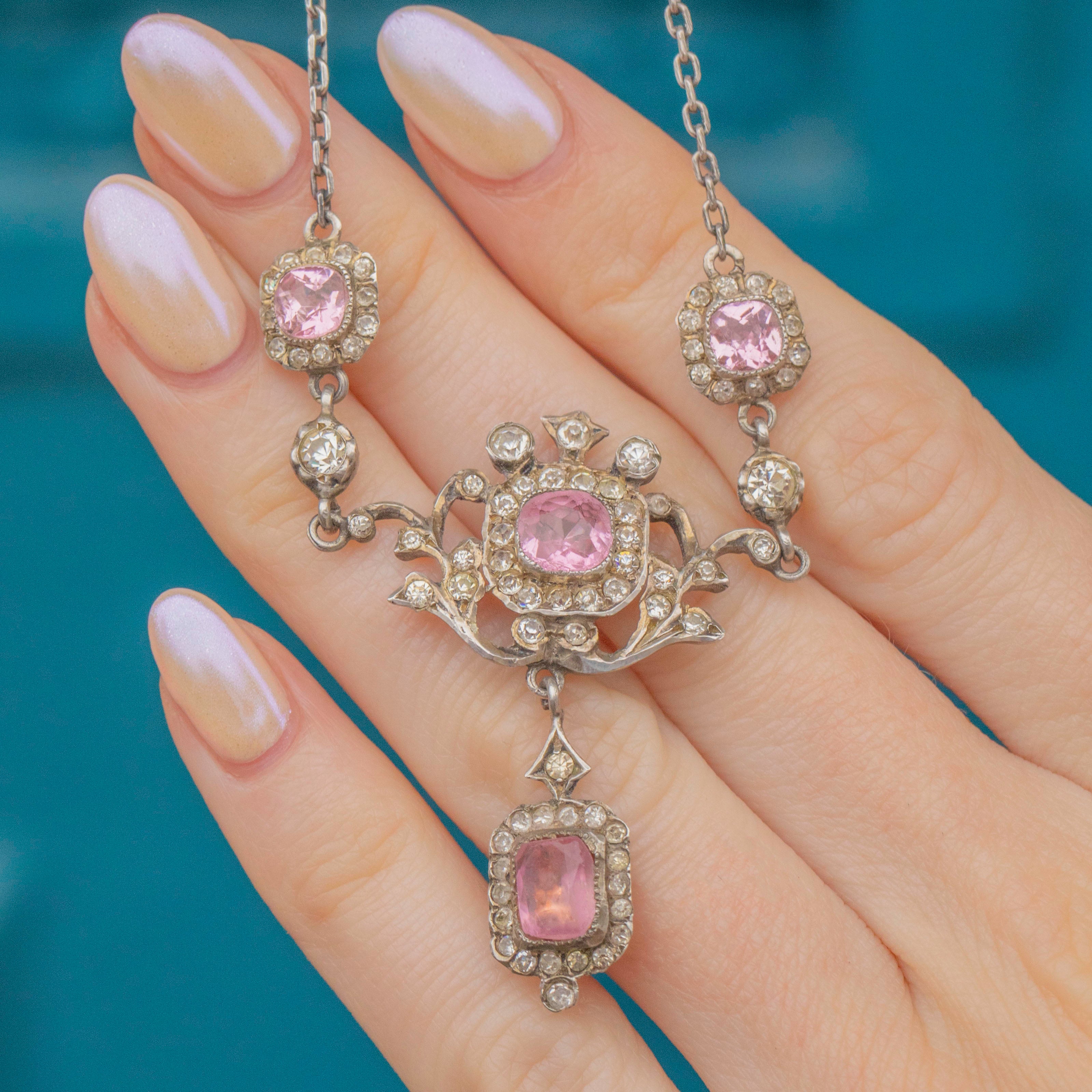 VERY GOOD: This Edwardian Silver pink Paste lavalier necklace is in very good condition. Her Pink Paste gemstones are bright with the most gorgeous baby pink hue. There is some discolouration to the White Paste, however, this is only truly noticeable under close inspection. The silver shows a natural patina, enhancing her Edwardian character, and the clasp is fully functional.