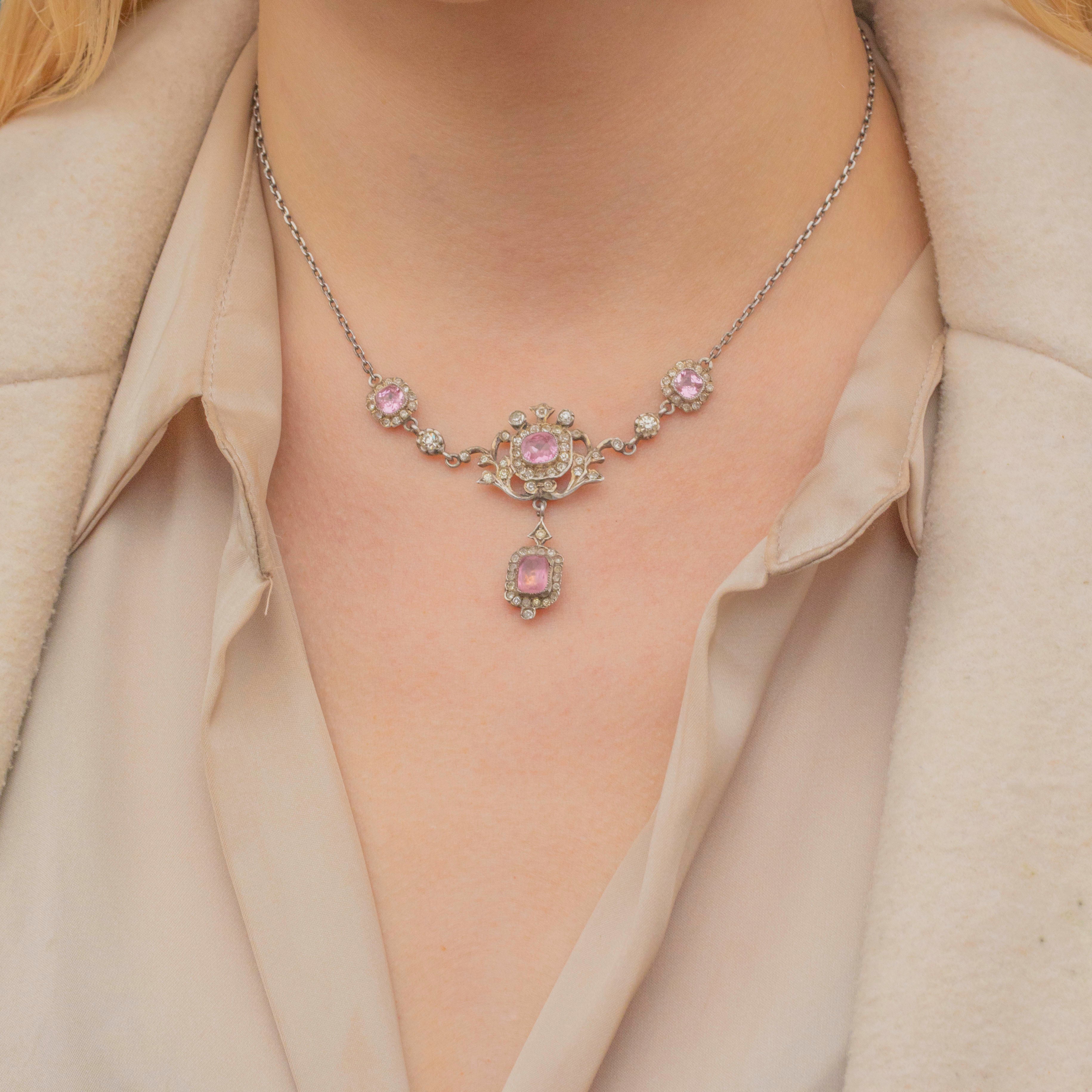 This exquisite Edwardian Silver pink Paste lavalier necklace features a captivating ornamental pendant, displaying vibrant pink Paste stones haloed by scintillating white Paste to create a radiant and timeless design.