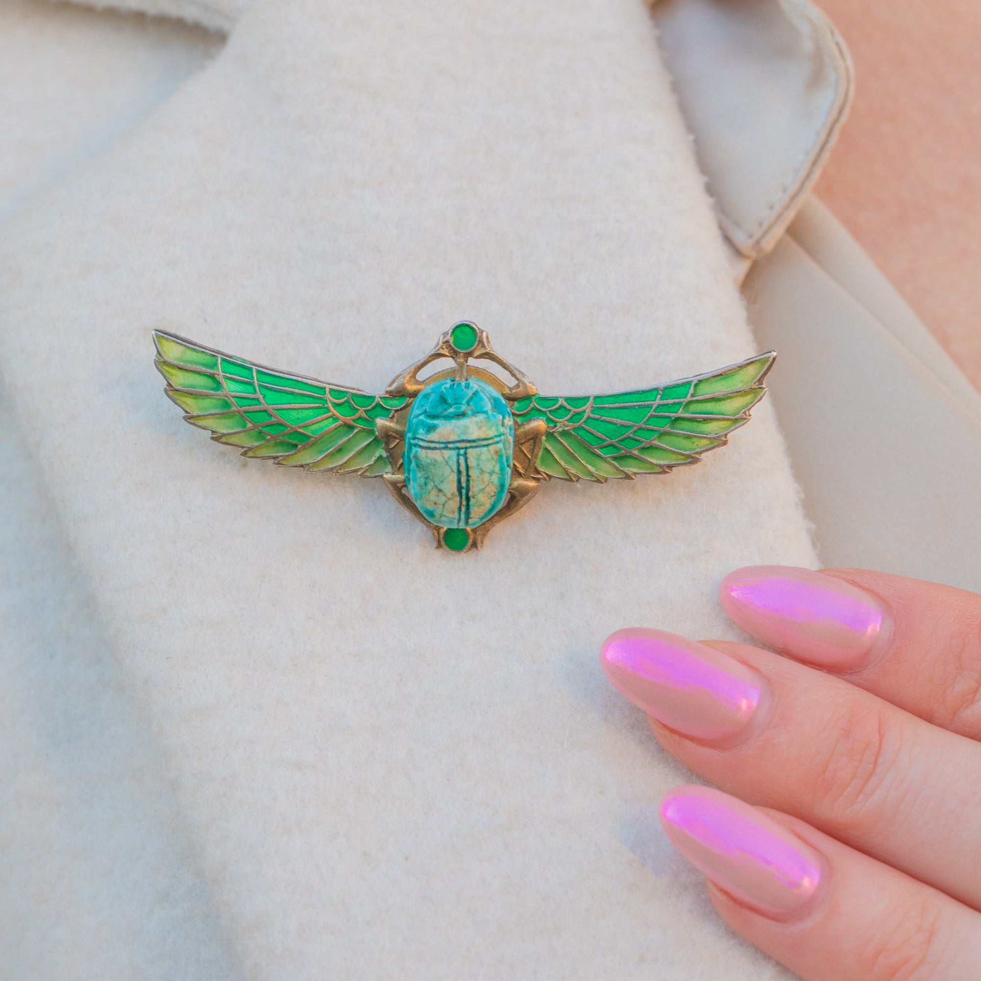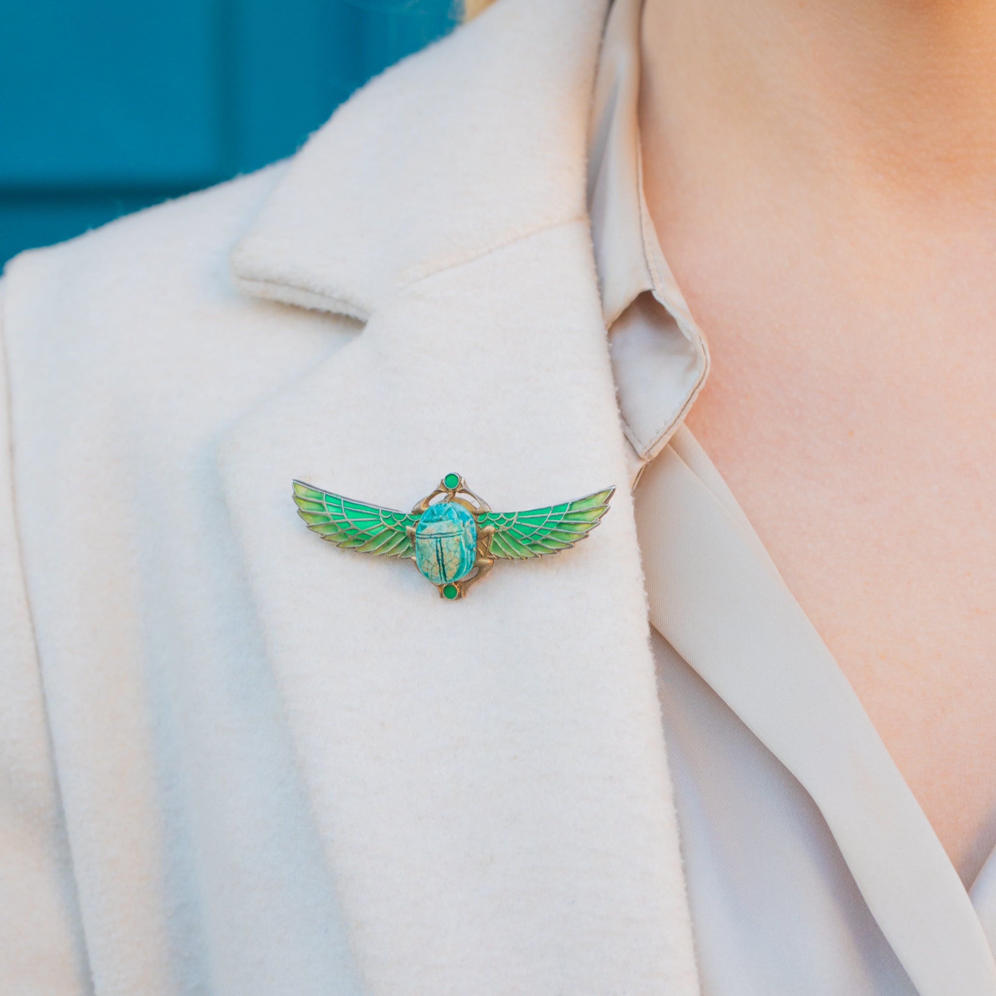 This Egyptian Revival Plique A Jour Scarab Brooch highlights the artistry of plique-à-jour enamel! Made in the 1920s, she reflects the renewed fascination with ancient Egypt sparked by archaeologist Howard Carter’s excavation of King Tutankhamun’s tomb.