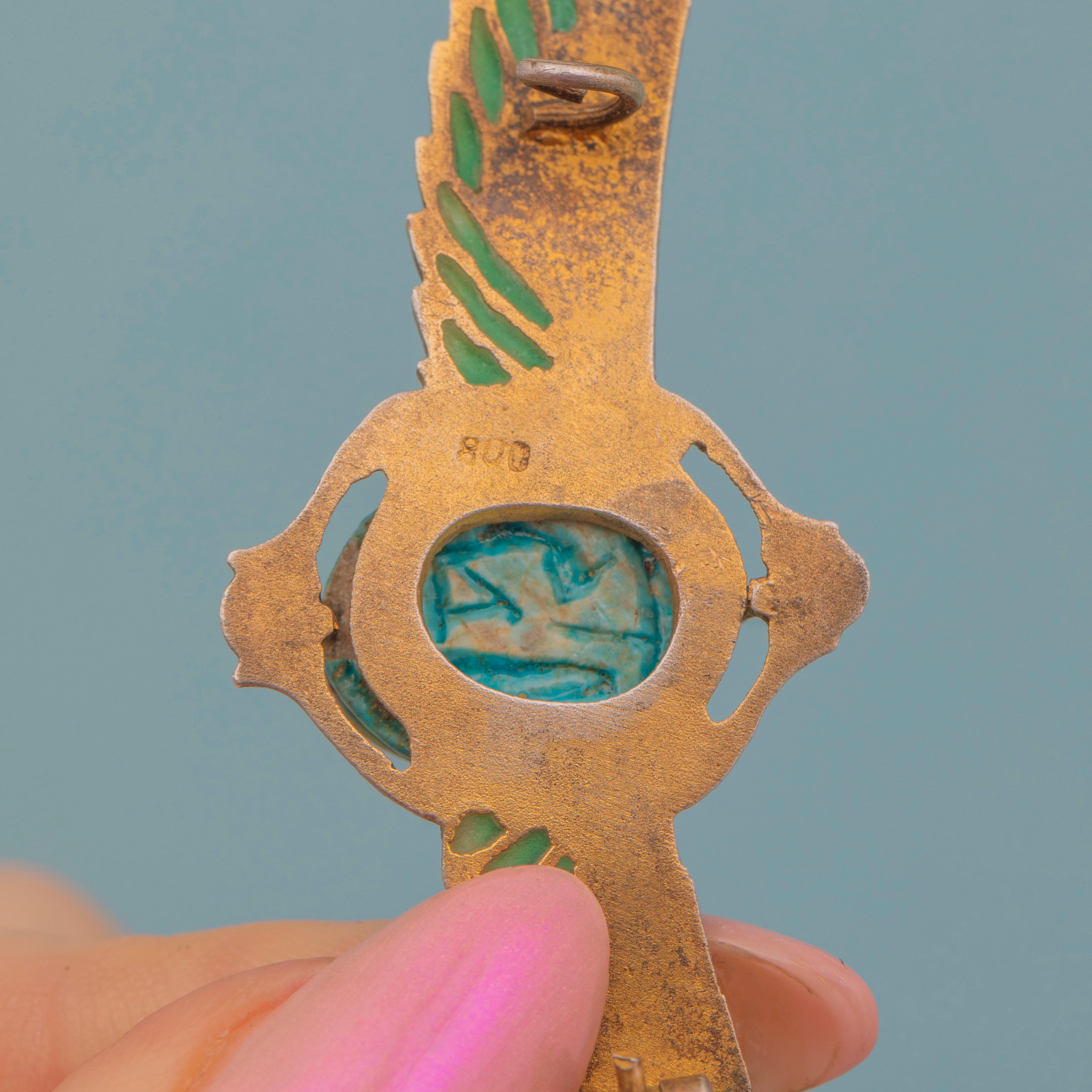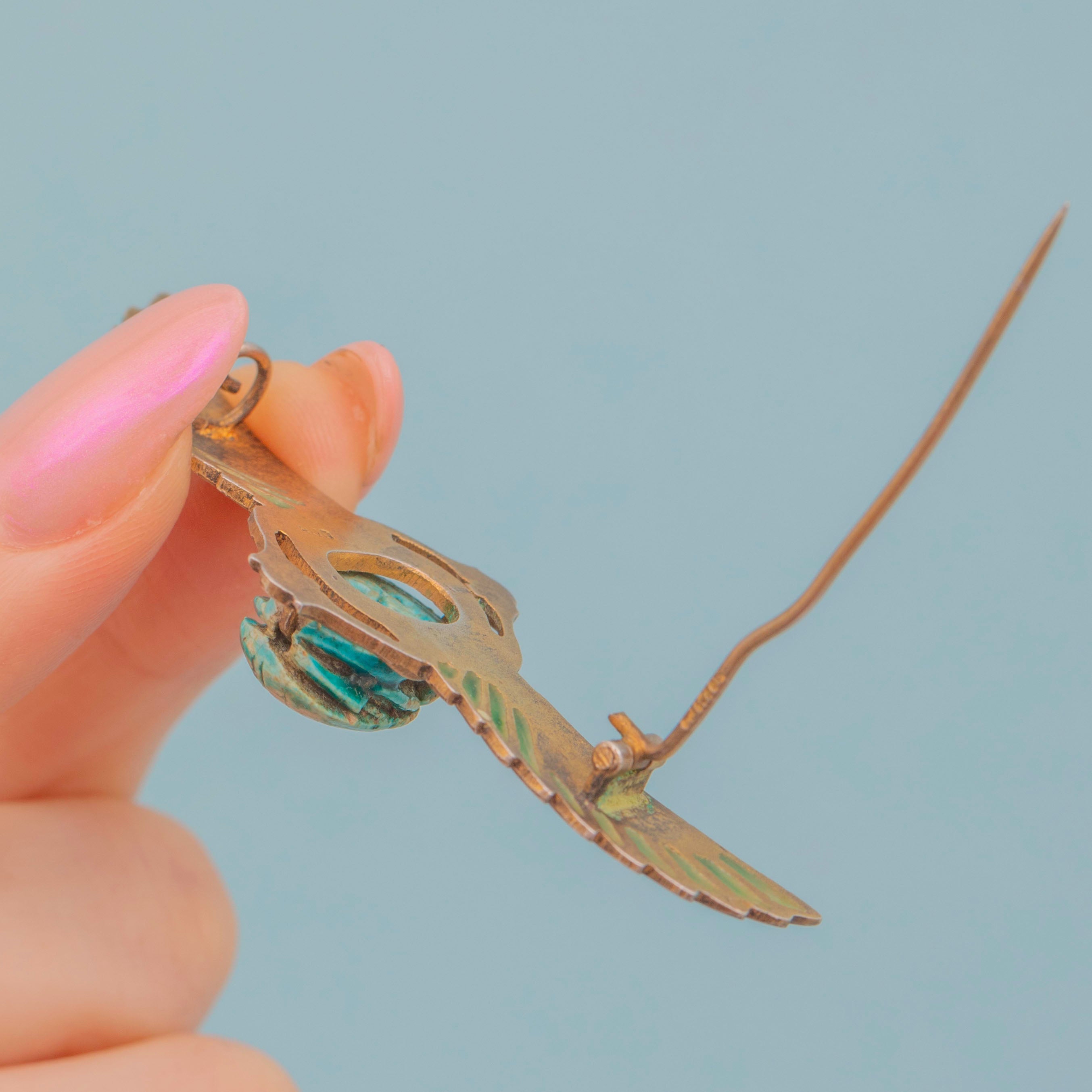 The plique-à-jour technique, reminiscent of stained glass, infuses the brooch with captivating blue and green tones. A quintessential piece of the Art Deco era, it’s ideal for enthusiasts of Egyptian-inspired design!