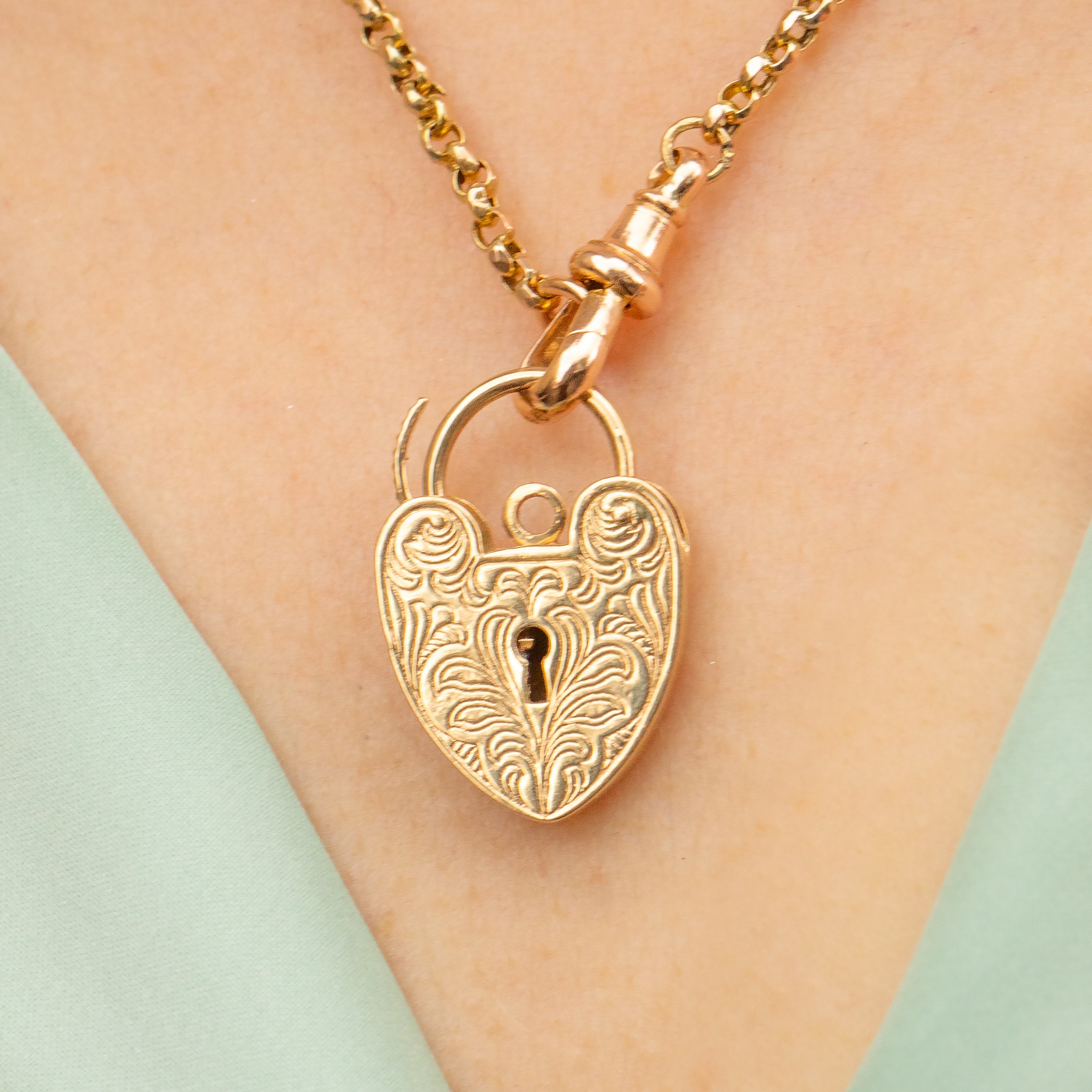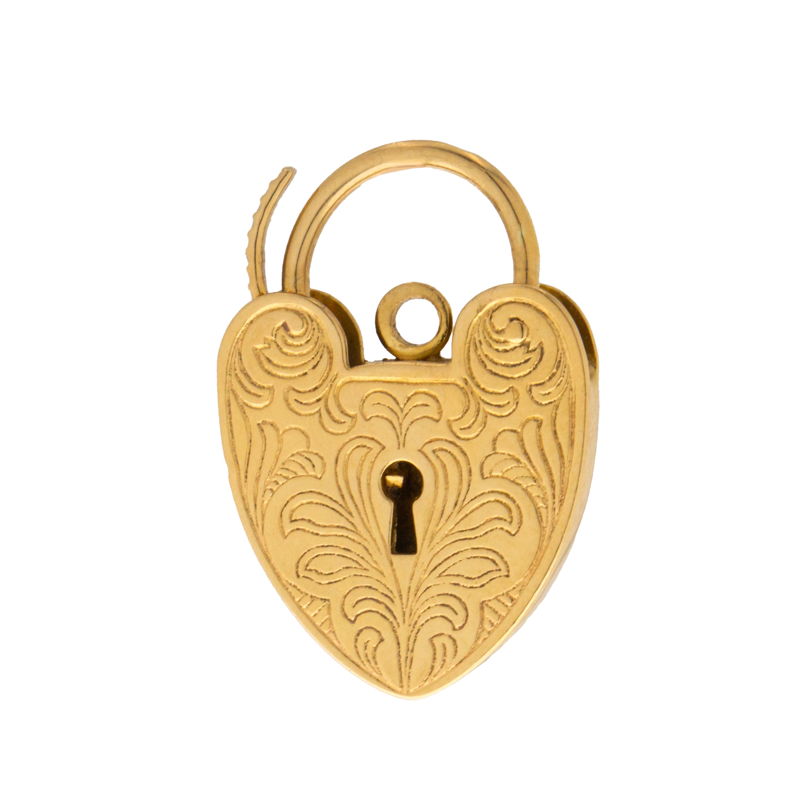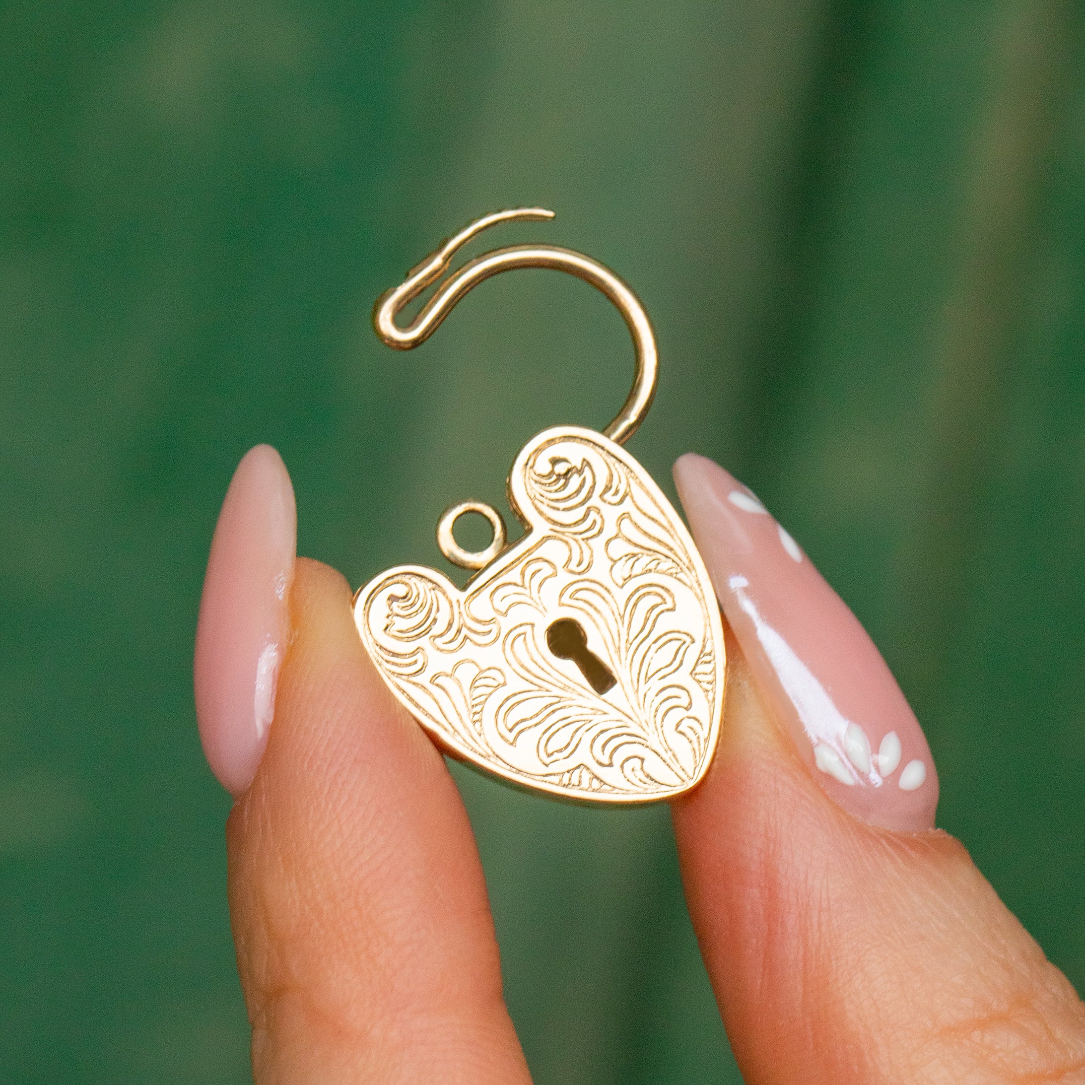 Historically rich in romantic symbolism, this Vintage padlock takes heavy inspiration from the Victorian period. Whether used to secure a bracelet around your wrist or suspended from a Gold chain, the beauty of this engraved heart padlock will look effortless.