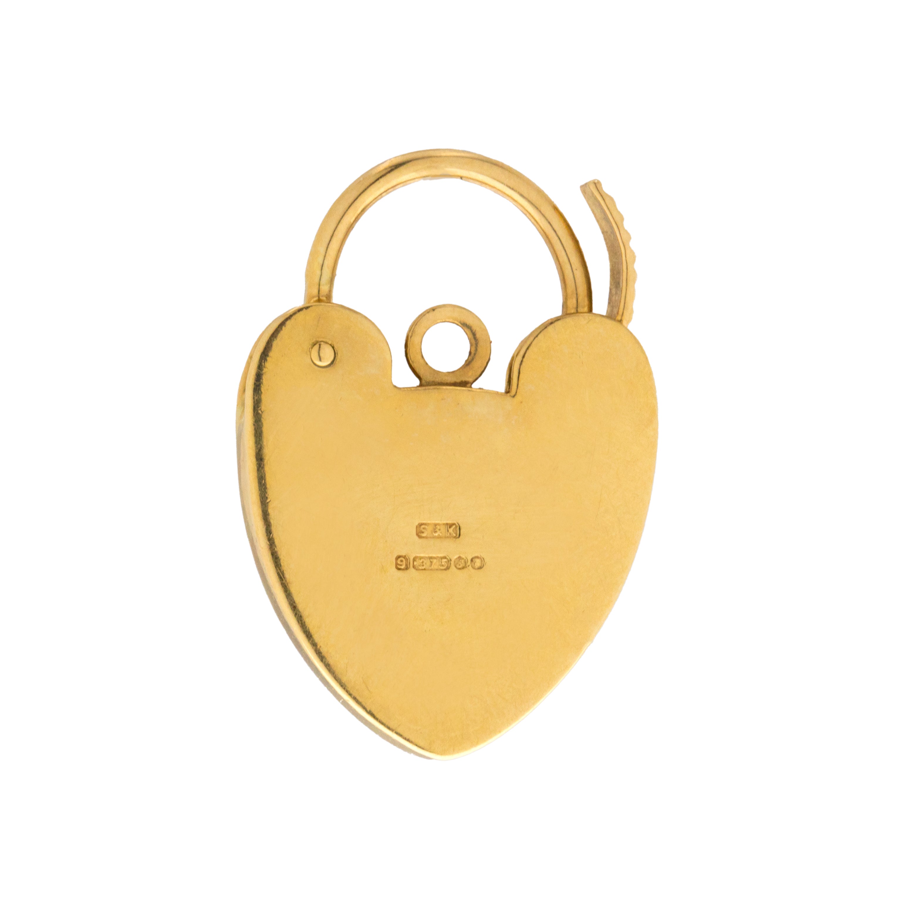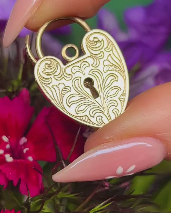 EXCELLENT. This engraved 9ct gold heart padlock is in excellent condition! The engravings are crisp and the Gold has a rich saturation throughout. The only thing to note is one small ding on the left side of the padlock, but this is only noticeable under close inspection. With the hinge and lock mechanism in perfect working order, you can wear this Gold pendant with confidence!