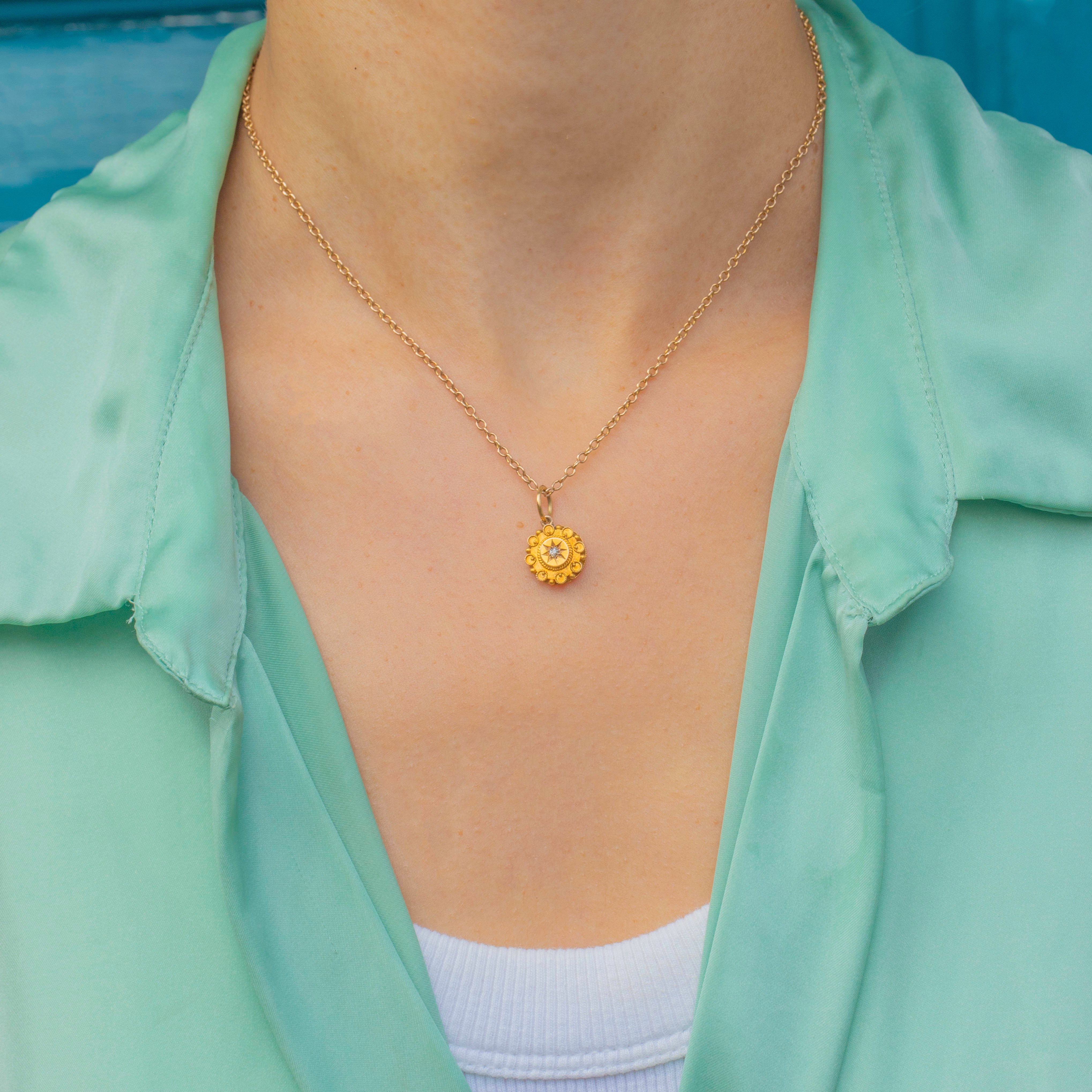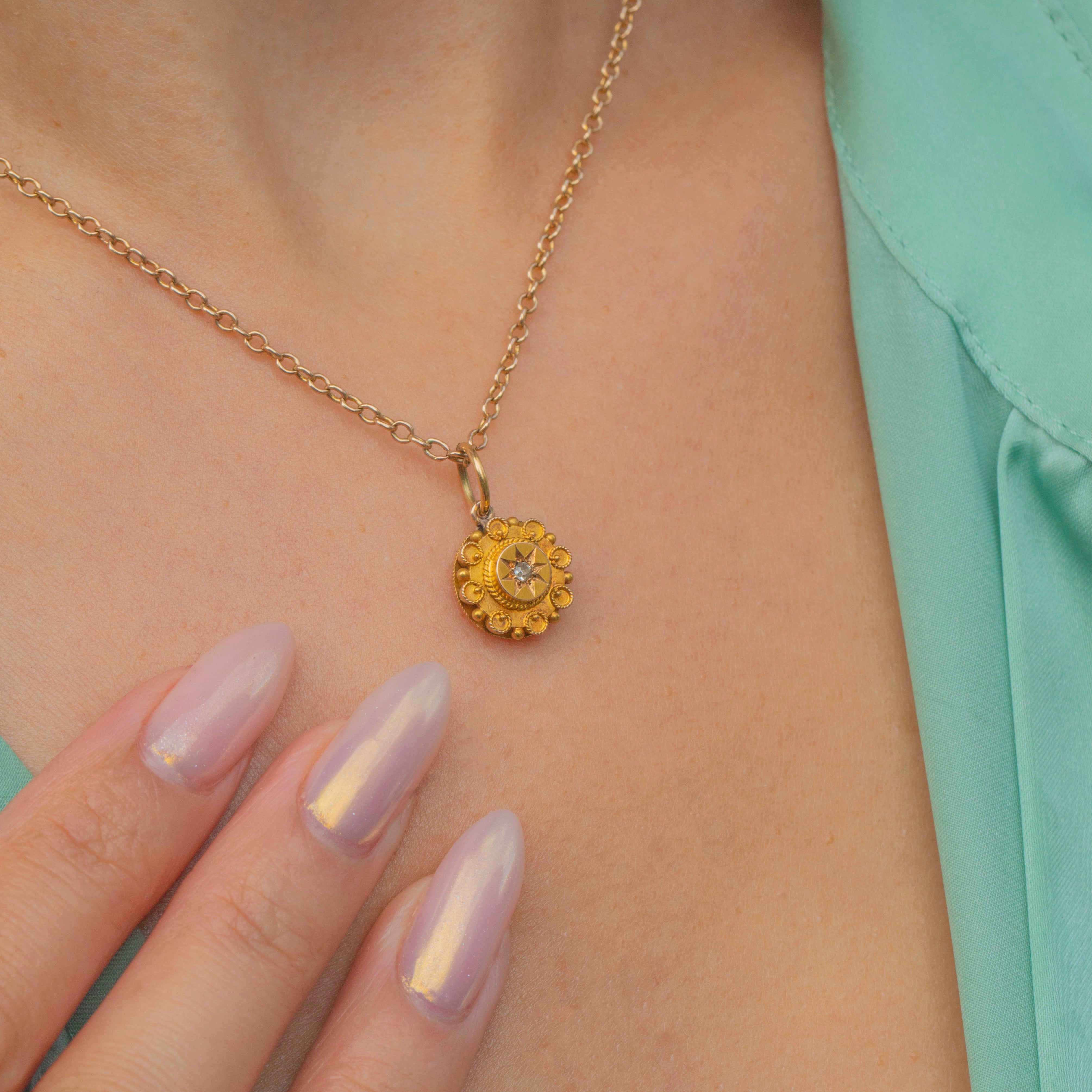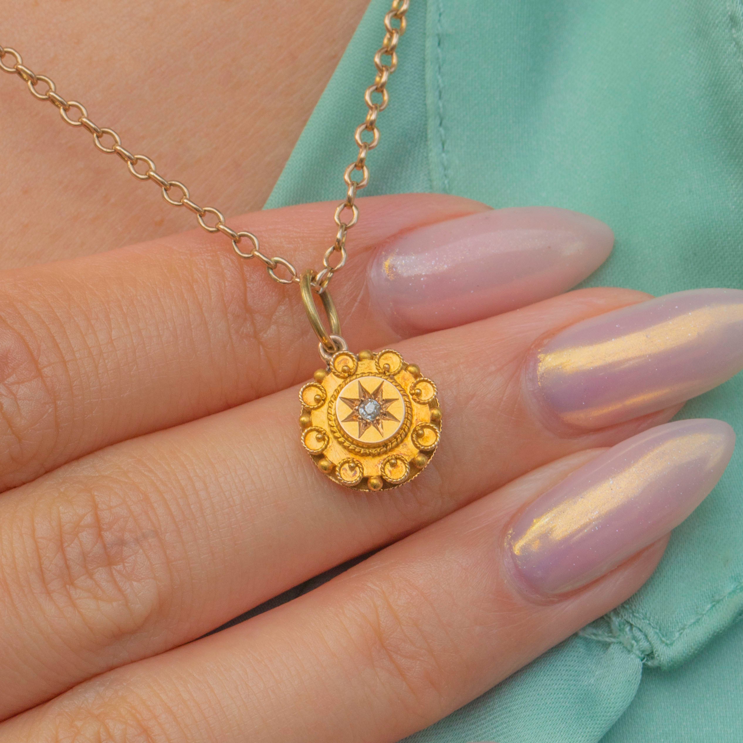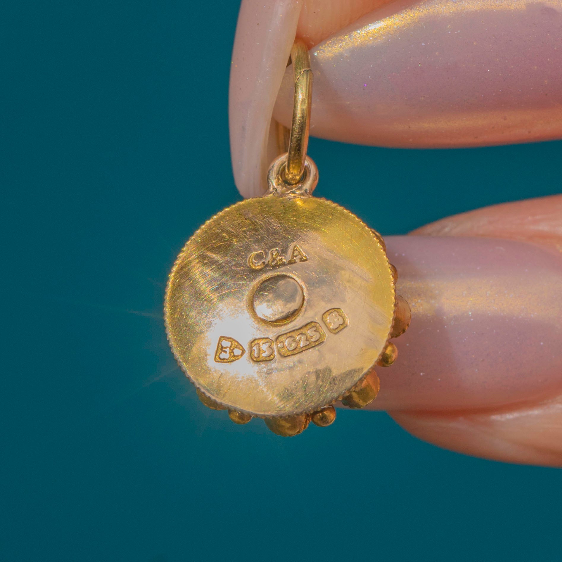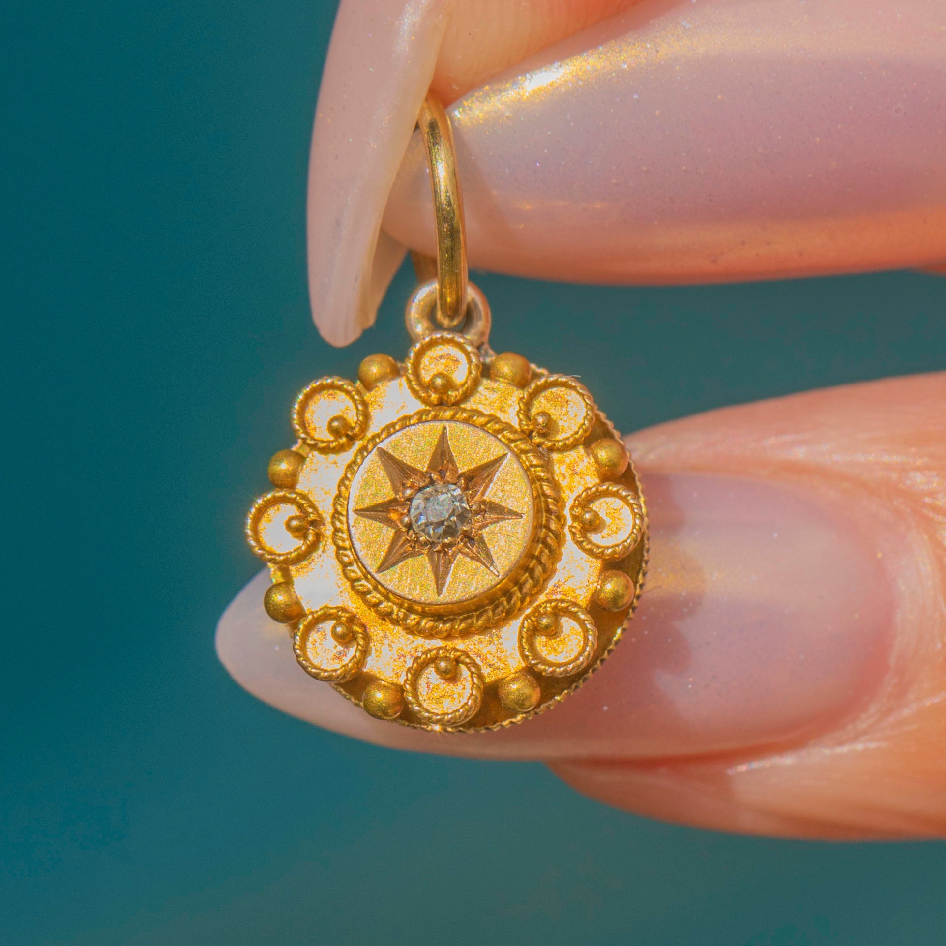 A gorgeous Edwardian pendant charm, crafted in solid 15ct Gold and hallmarked for Chester 1902. This piece showcases fine Etruscan Revival style, with delicate bead and filigree details surrounding a central Diamond. The warm tone of the 15ct Gold enhances its antique character, while the ornate workmanship adds a sense of luxury and rarity.