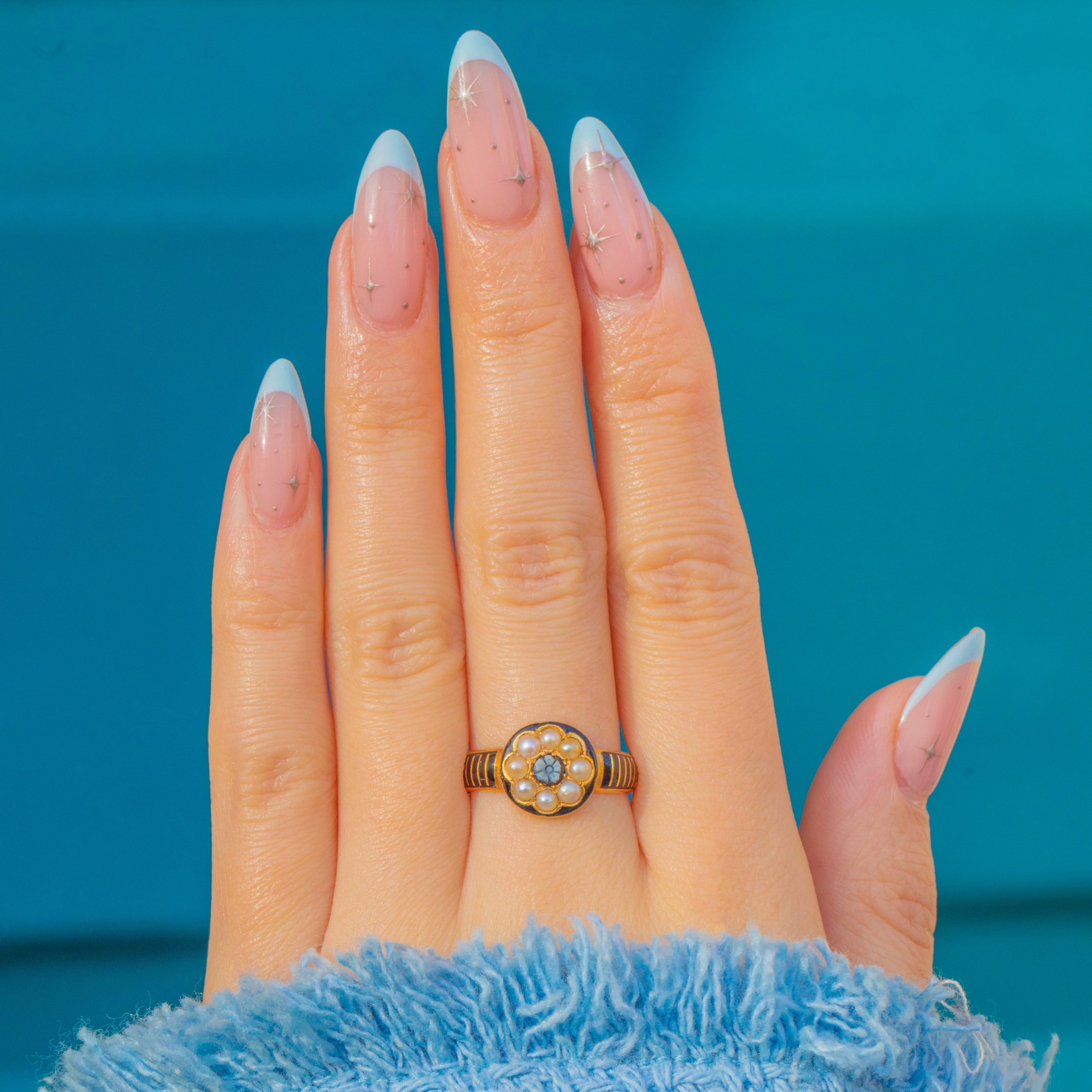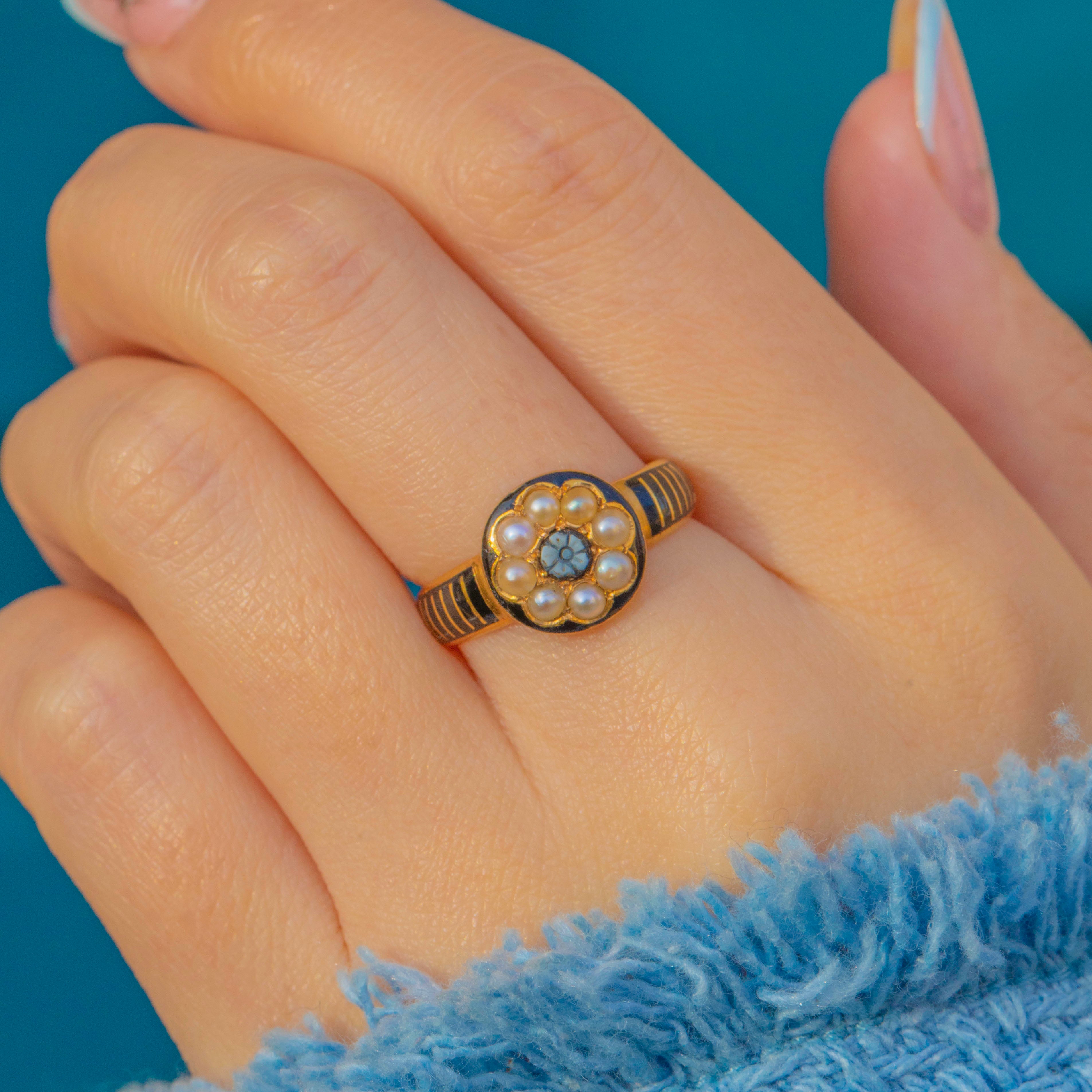 A striking find, this Victorian mourning ring is crafted in rich 18ct Gold with a delicate halo of creamy Seed Pearls encircling a central carved Agate forget‑me‑not. A glossy black Enamel border frames the cluster, lending beautiful contrast and a graphic, refined edge.