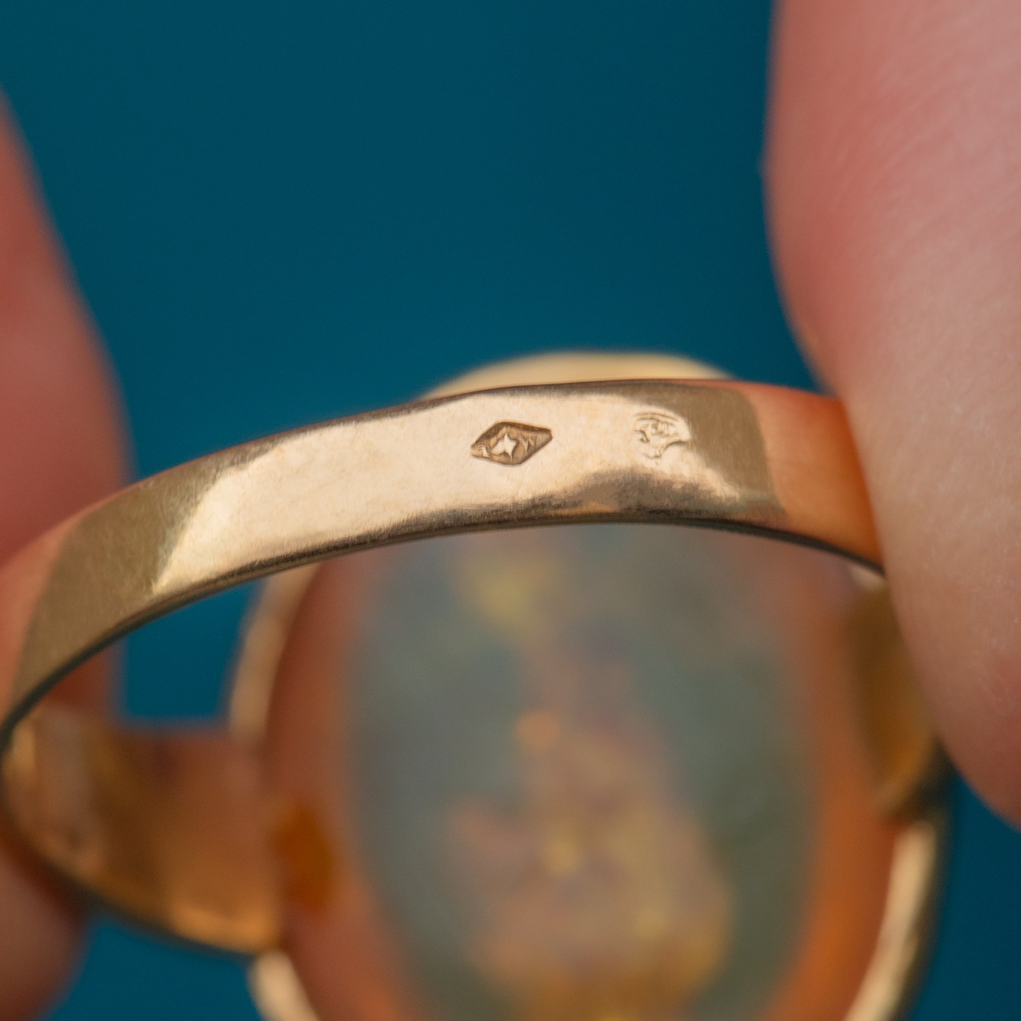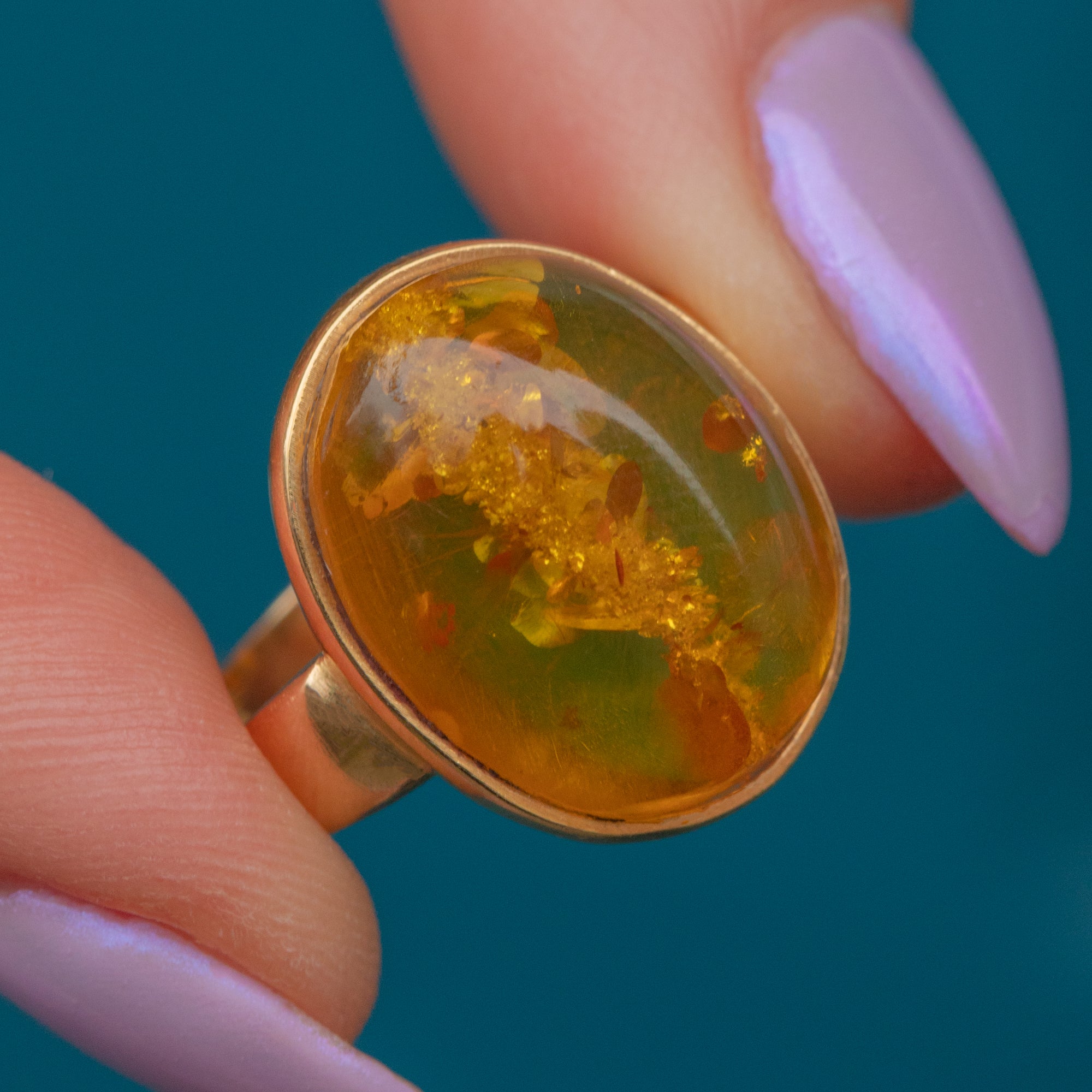 GOOD. This French 18ct Gold Baltic Amber cabochon ring is in good condition. The Amber is smoothly domed, the Gold is luxurious and stamped with a French Eagles head to certify it as 18ct Gold. The Amber is held within a bezel, but it has had glue added to keep it secure, which is visible up close. When you look at the back of the Amber, there are some chips to the top of the stone and another just to the side, but you can't see or feel this when you wear the ring!