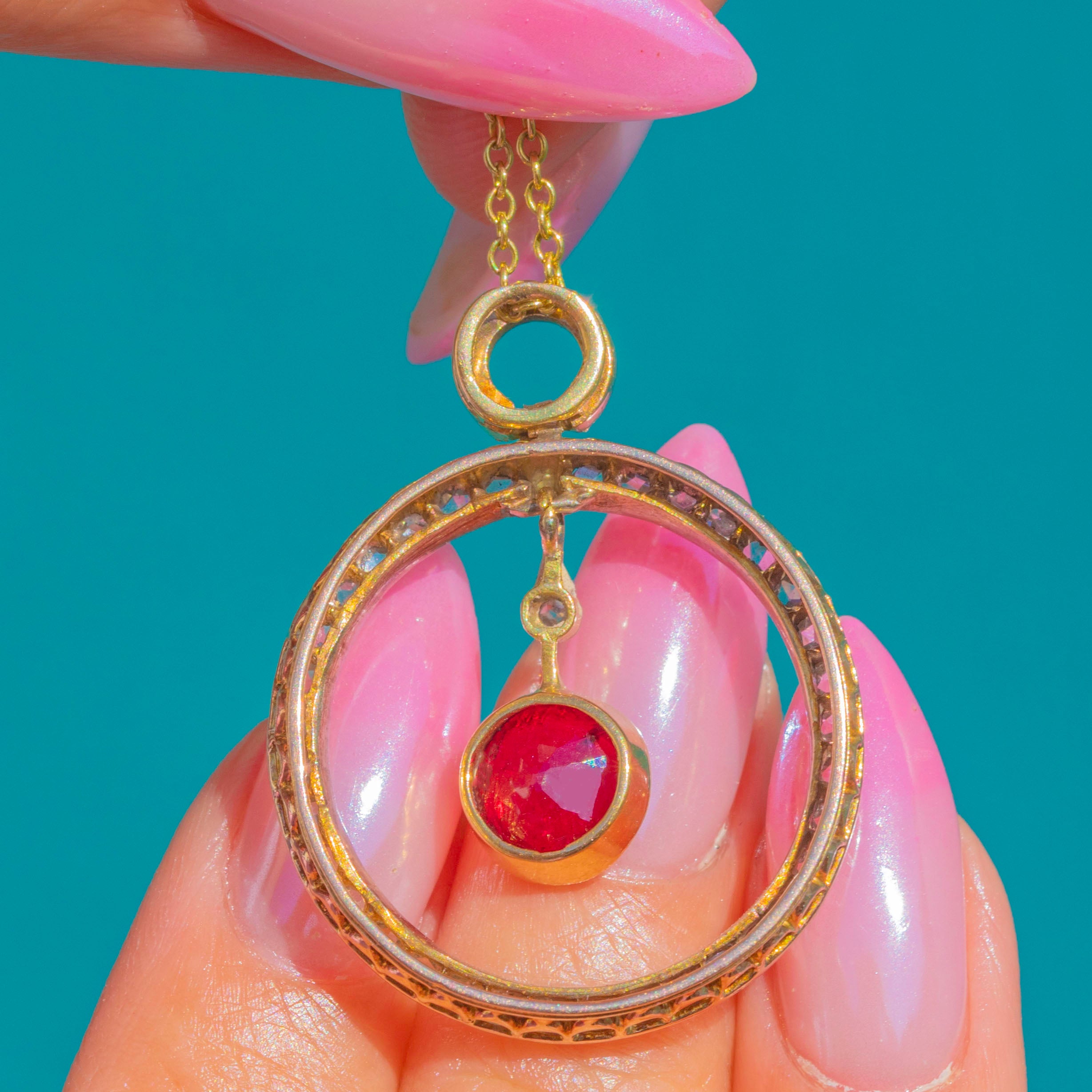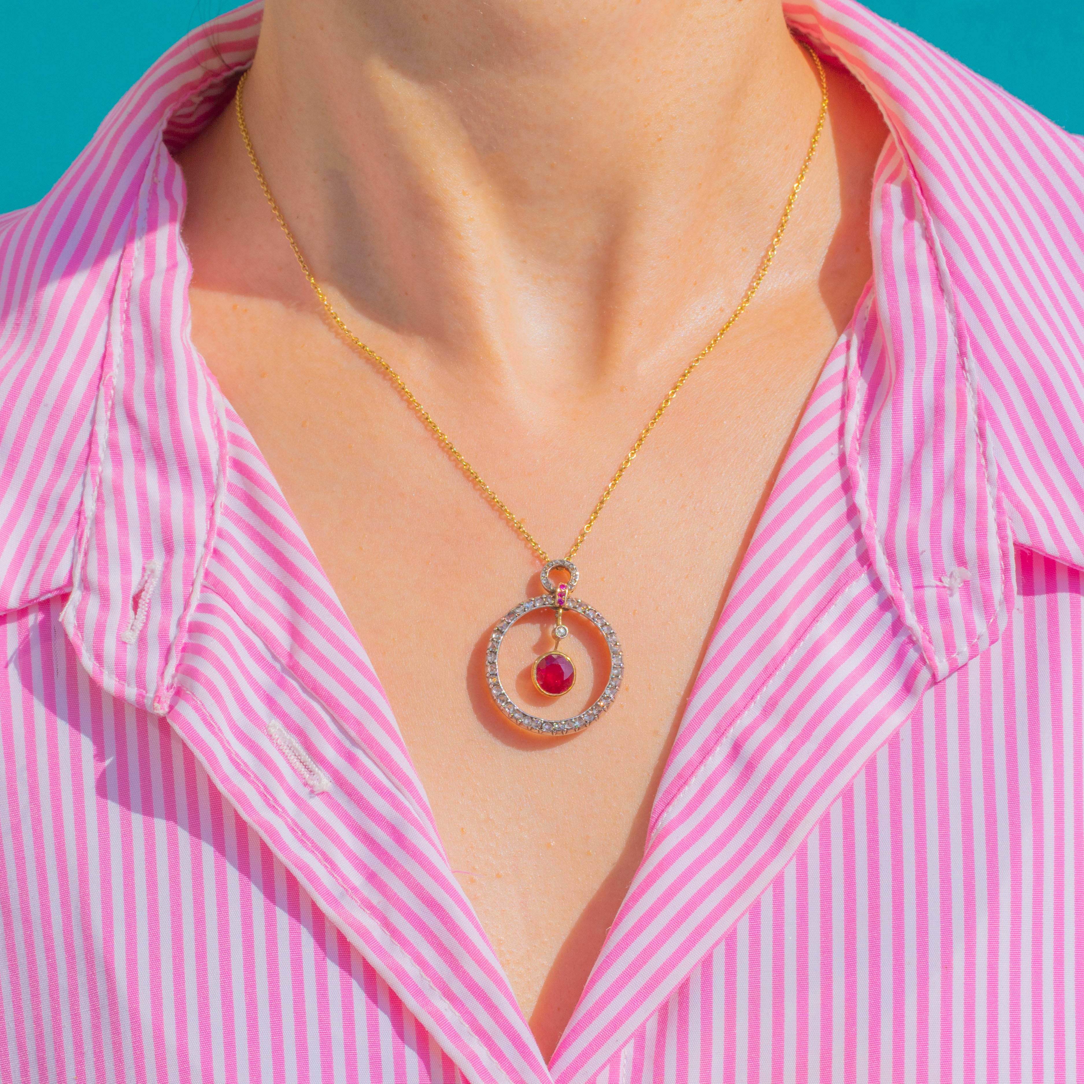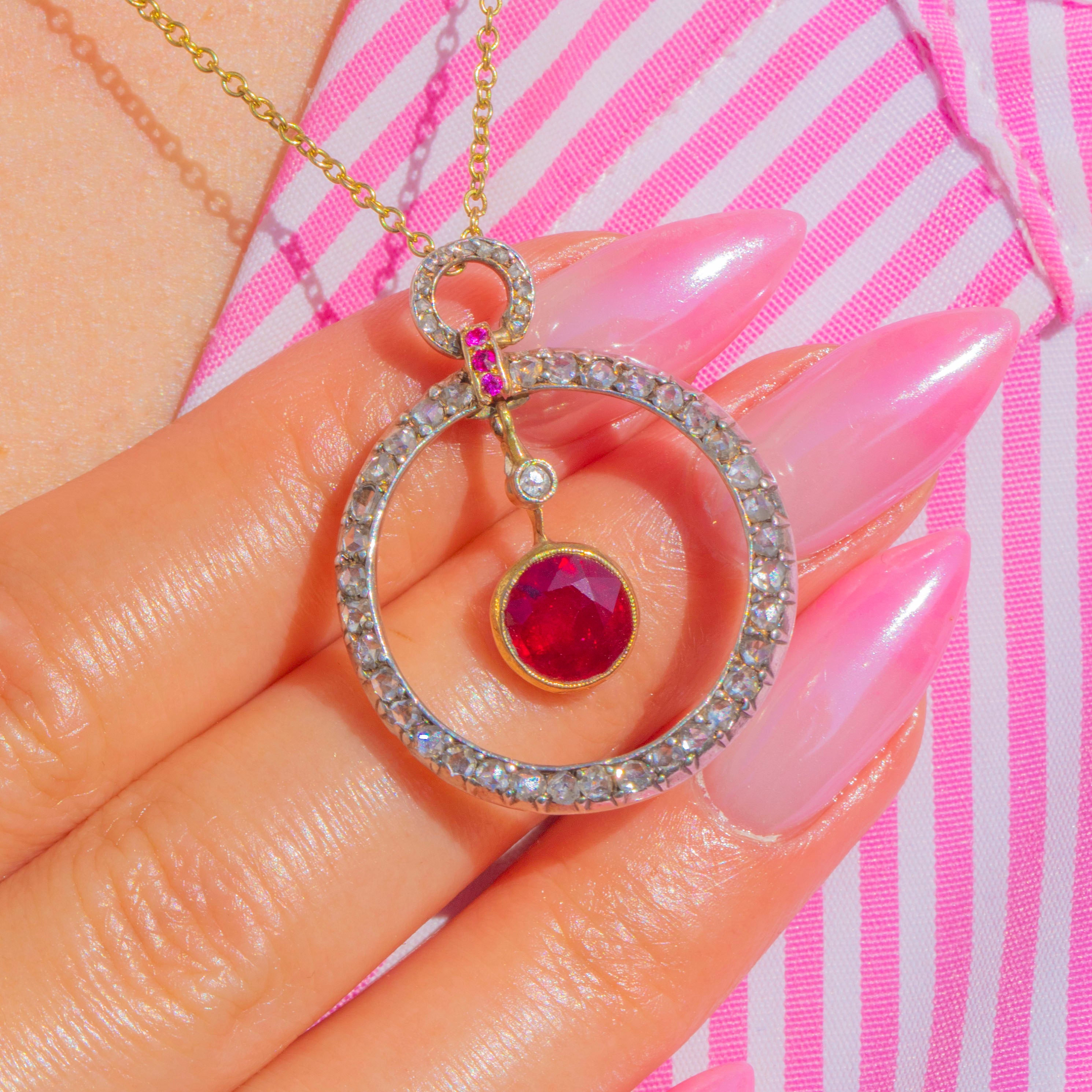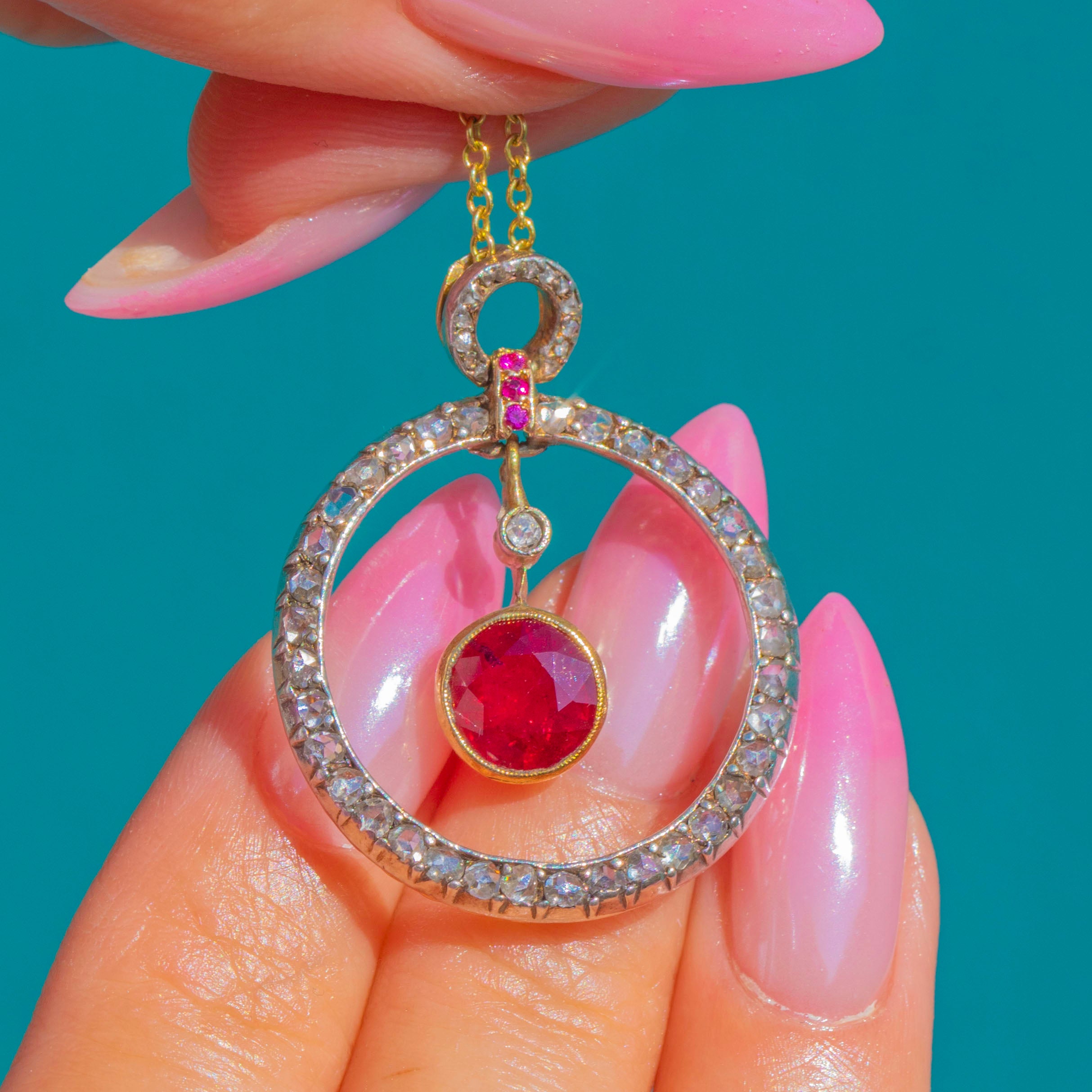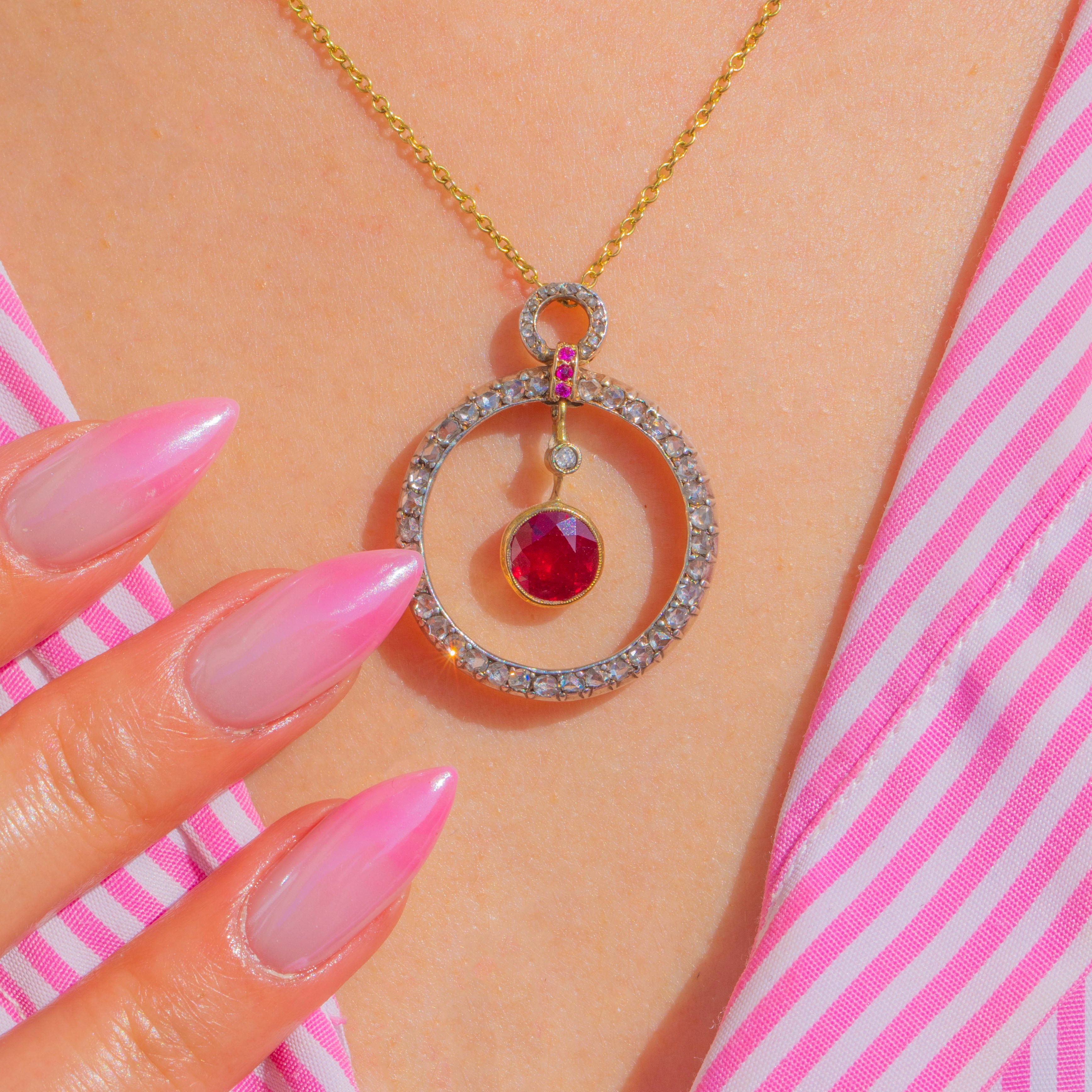 A luminous Belle Époque treasure, this articulated pendant is crafted in 18ct Gold and set with a sumptuous Natural Ruby of approximately 2.00ct. Framed by a halo of glittering Diamonds and finished with dainty ruby accents at the bale, the design dances with light thanks to its multi-part construction and graceful inner drop. It’s an elegant, romantic jewel with that delectable turn-of-the-century poise.