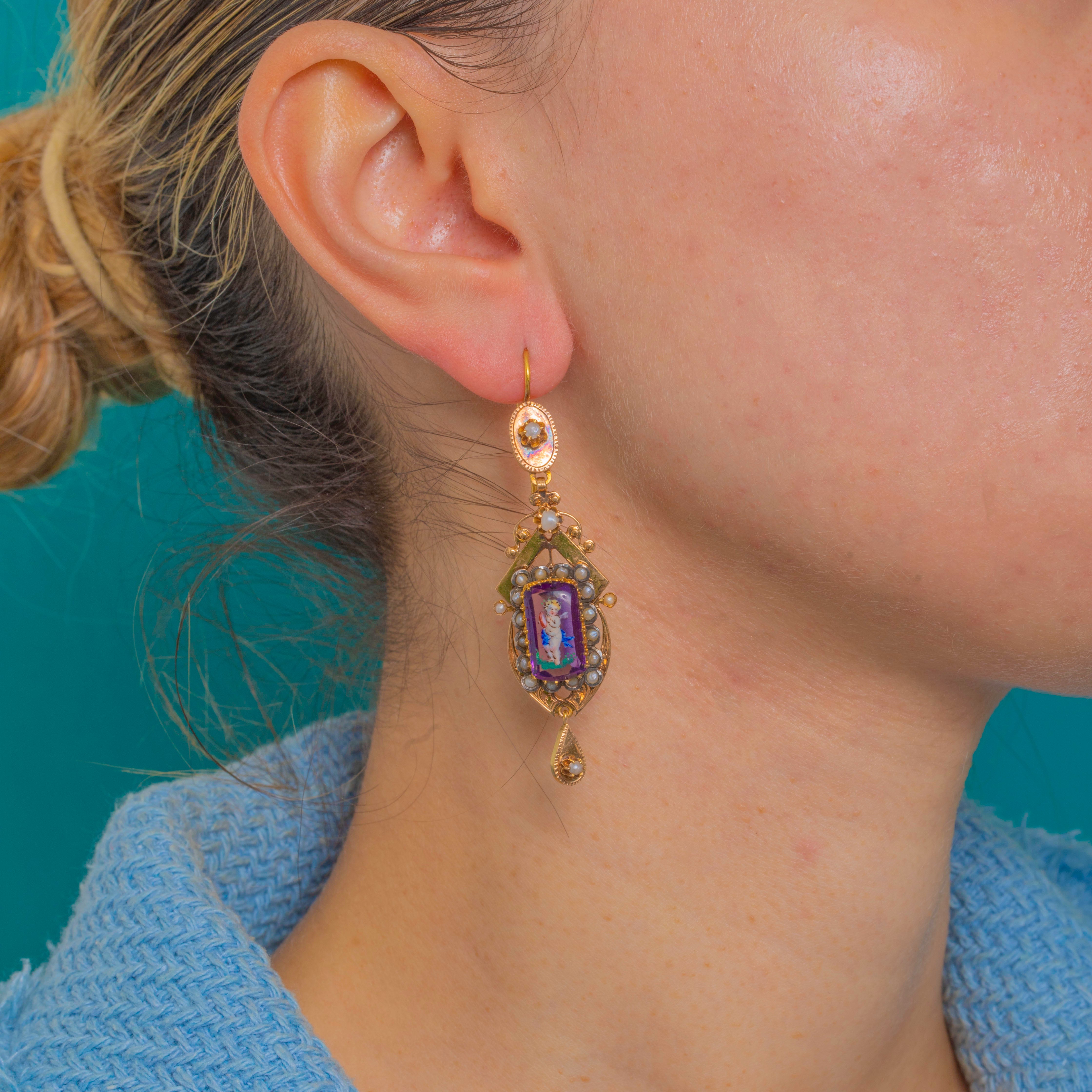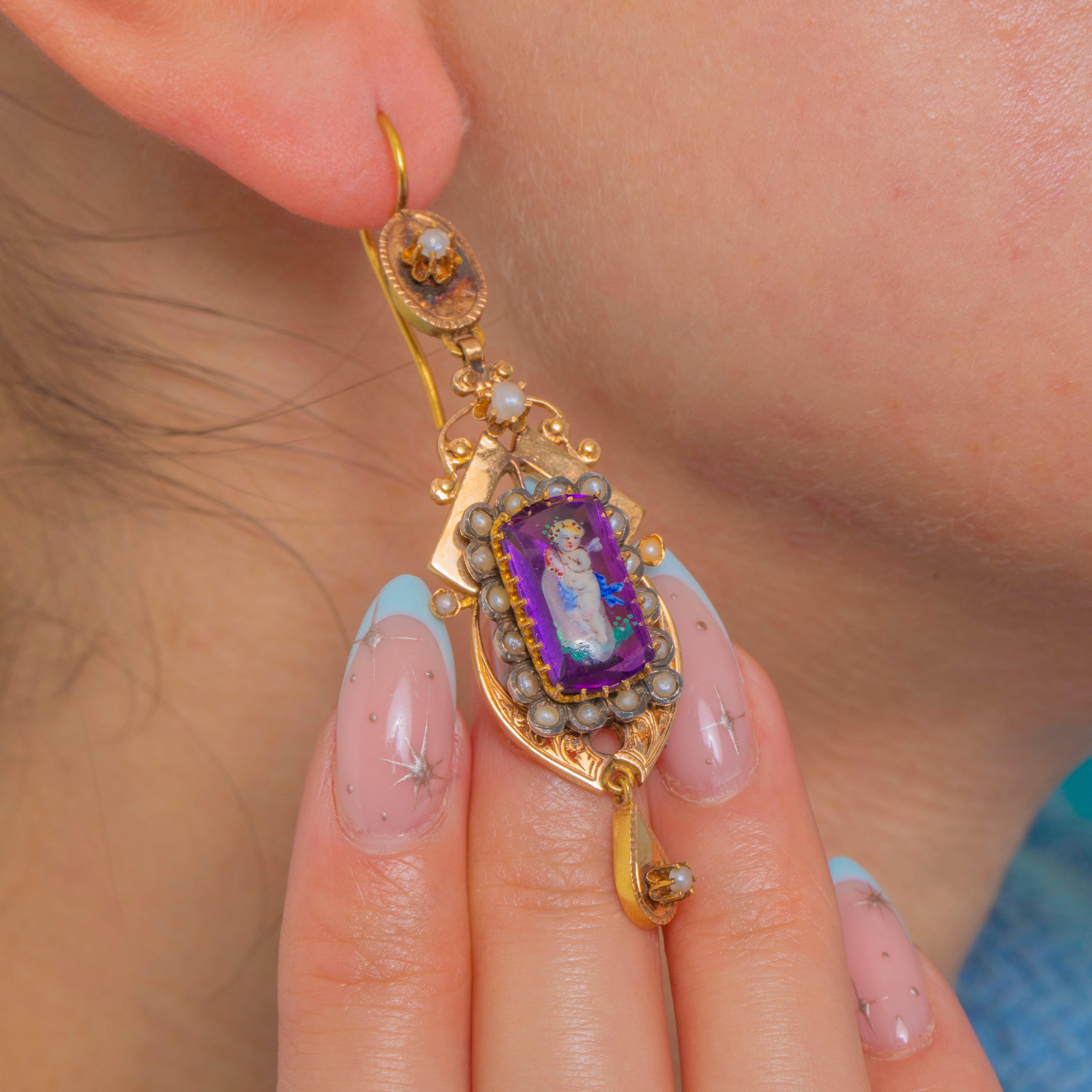Sumptuous and romantic, these French Victorian 18ct Gold earrings showcase exquisitely painted cherub miniatures on a vivid purple glass ground. The elongated, articulated silhouette is richly adorned with applied bead-and-wire detail in the Etruscan Revival taste, delivering graceful movement and an opulent, shoulder-grazing presence.