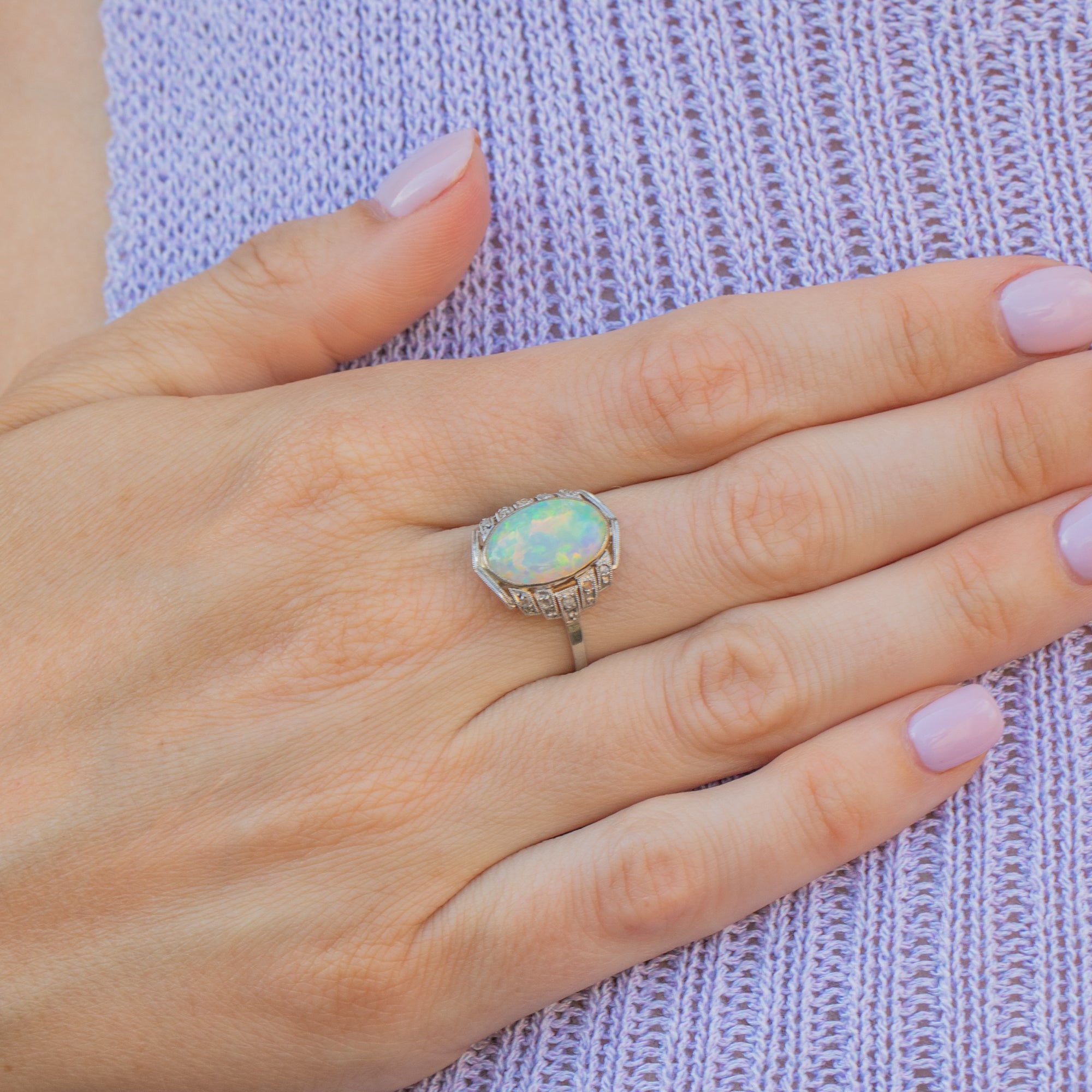 MATERIALS: Tests as 18ct white Gold shank, Platinum settings, Opal (1.20ct natural, solid Opal), Diamonds (0.10ct).