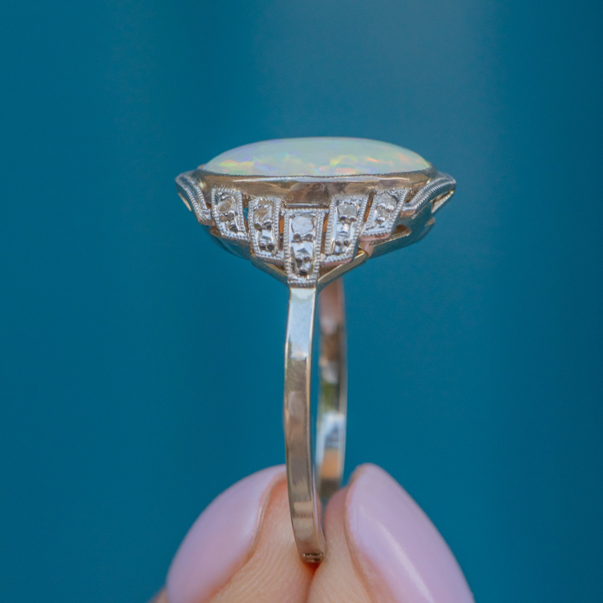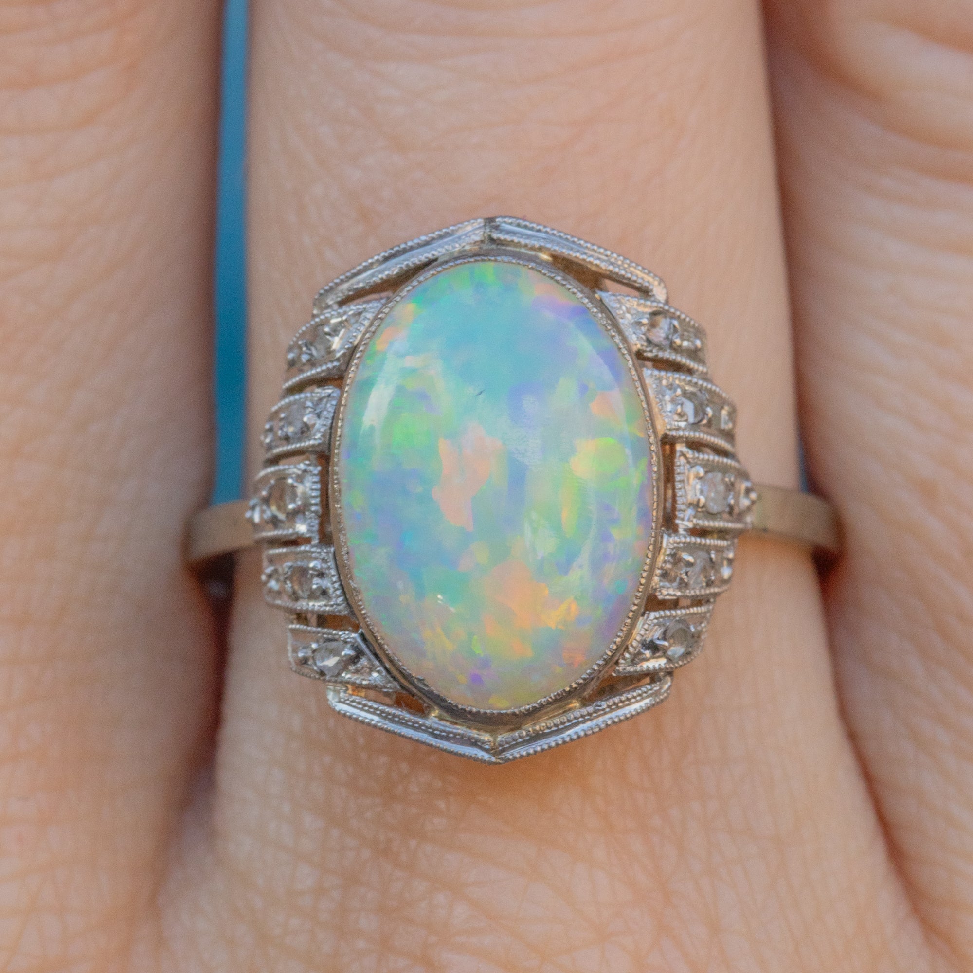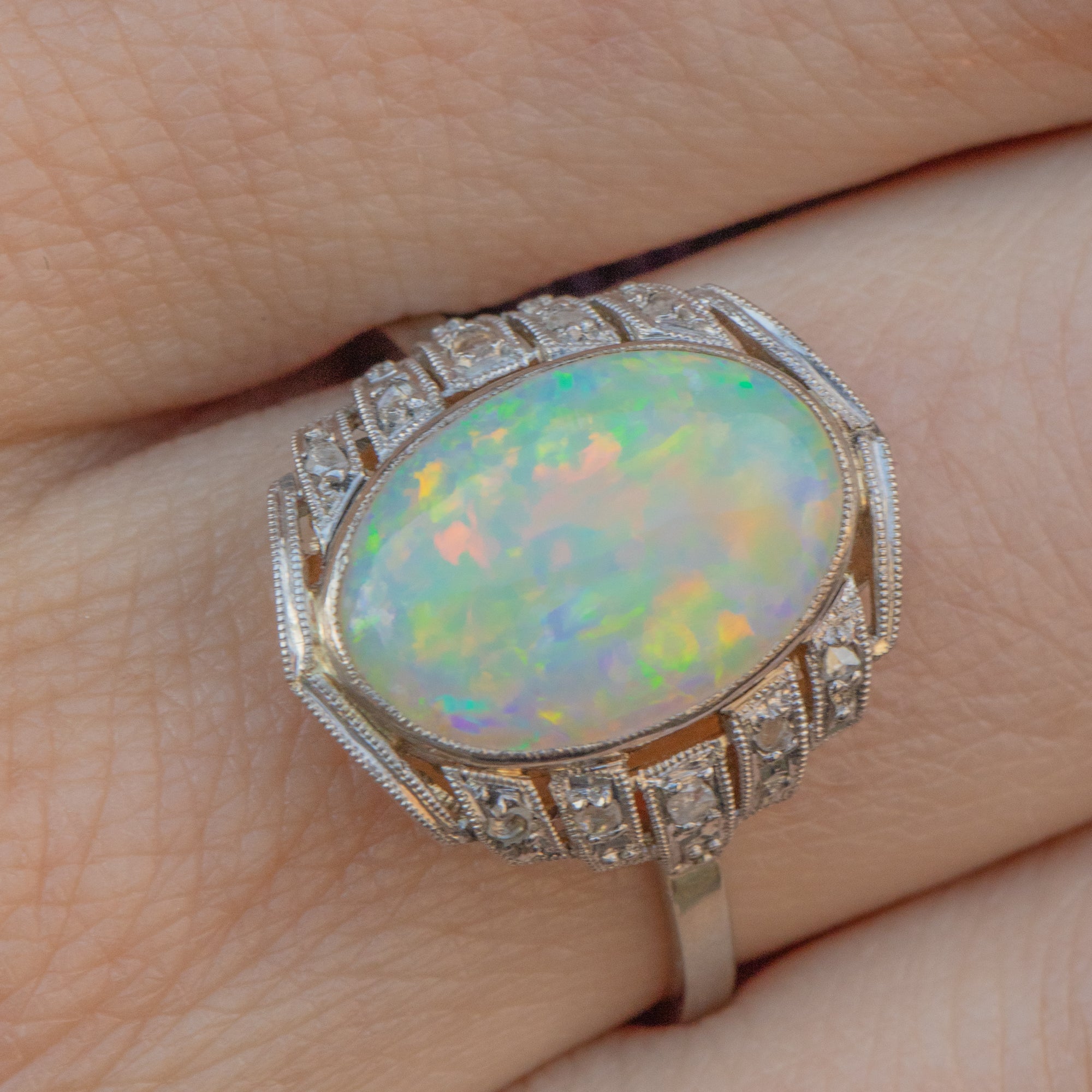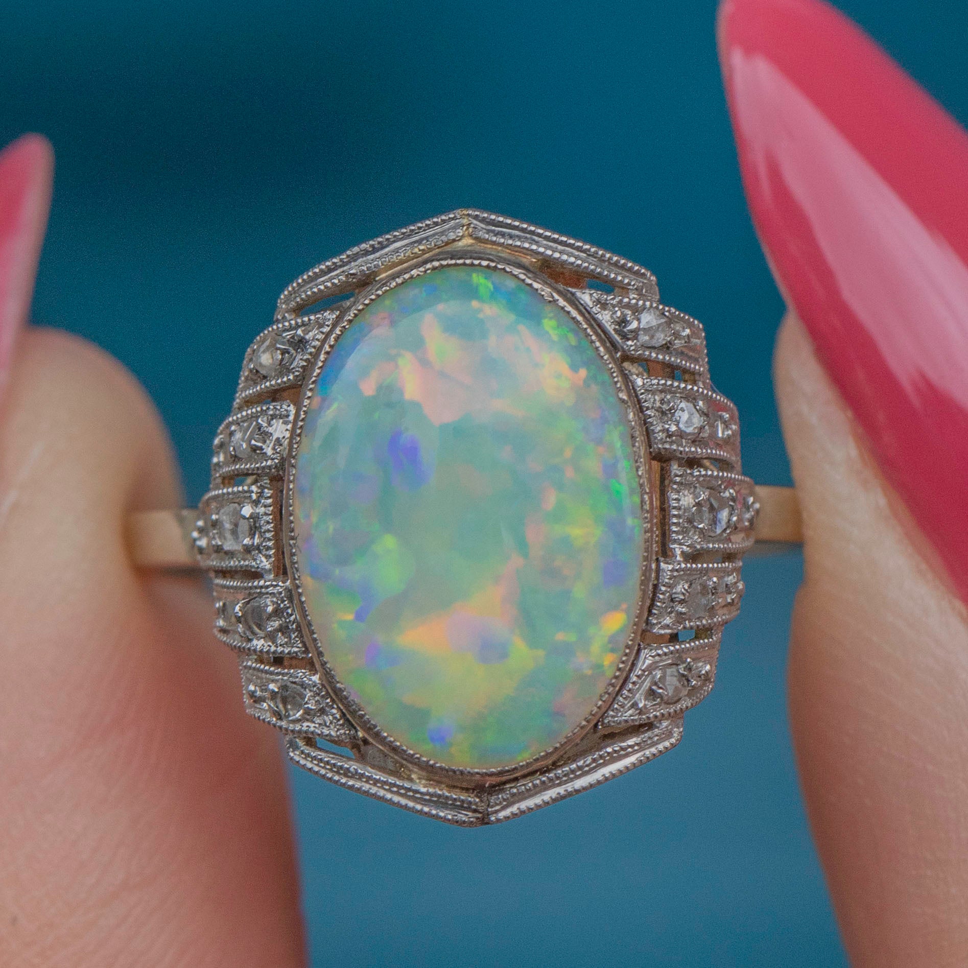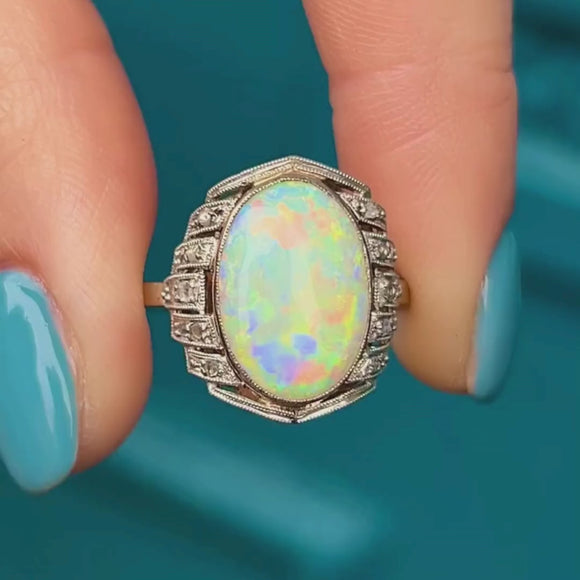 We love the geometric form of this French Art Deco Opal Diamond cluster ring! Flaunting a 1.20ct Opal with mouthwatering iridescent flashes across a smooth milky core, she is haloed by scintillating Diamonds in geometric settings, all set into sturdy Platinum.