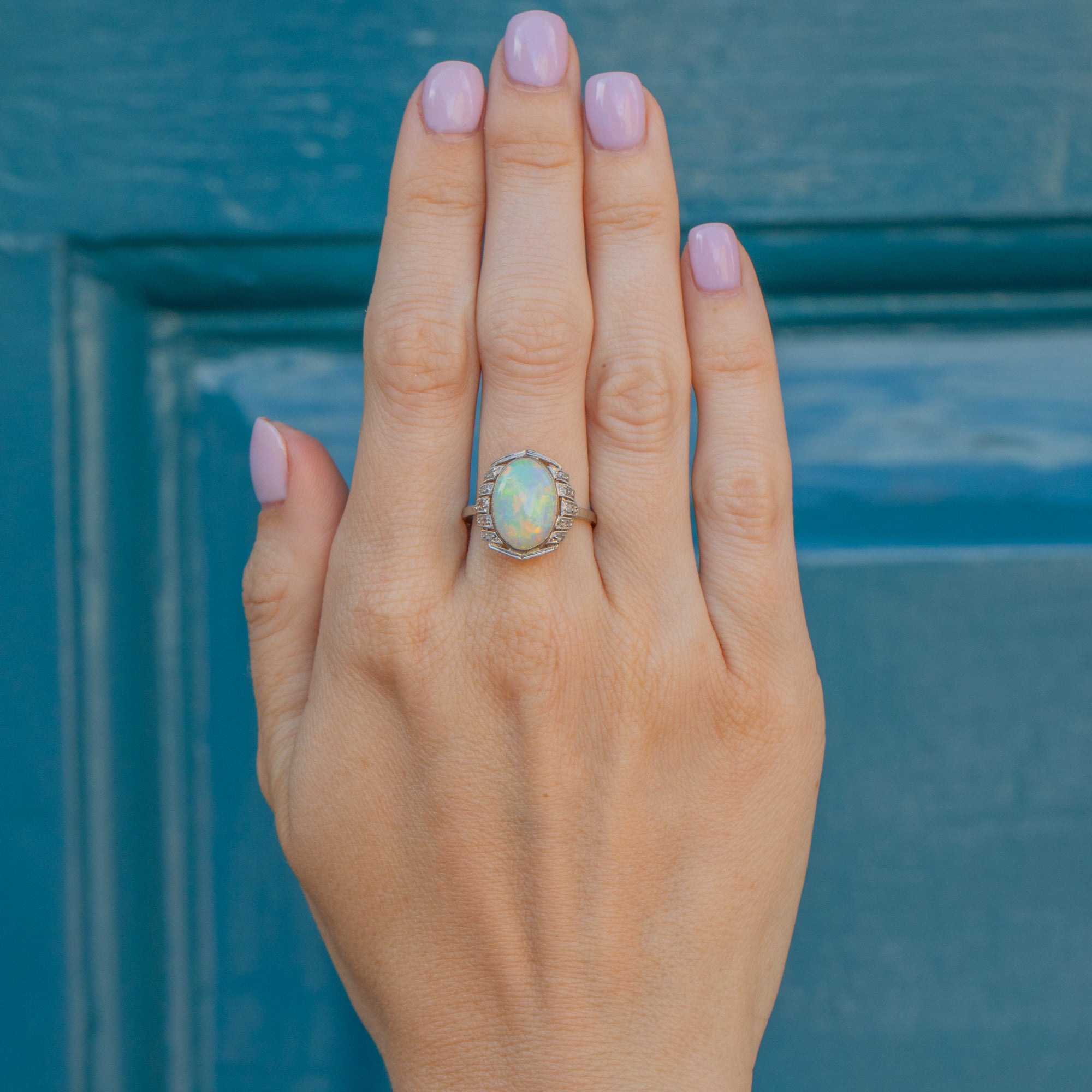 French 18ct White Gold Art Deco Opal Diamond Cluster Ring, 1.20ct Opal