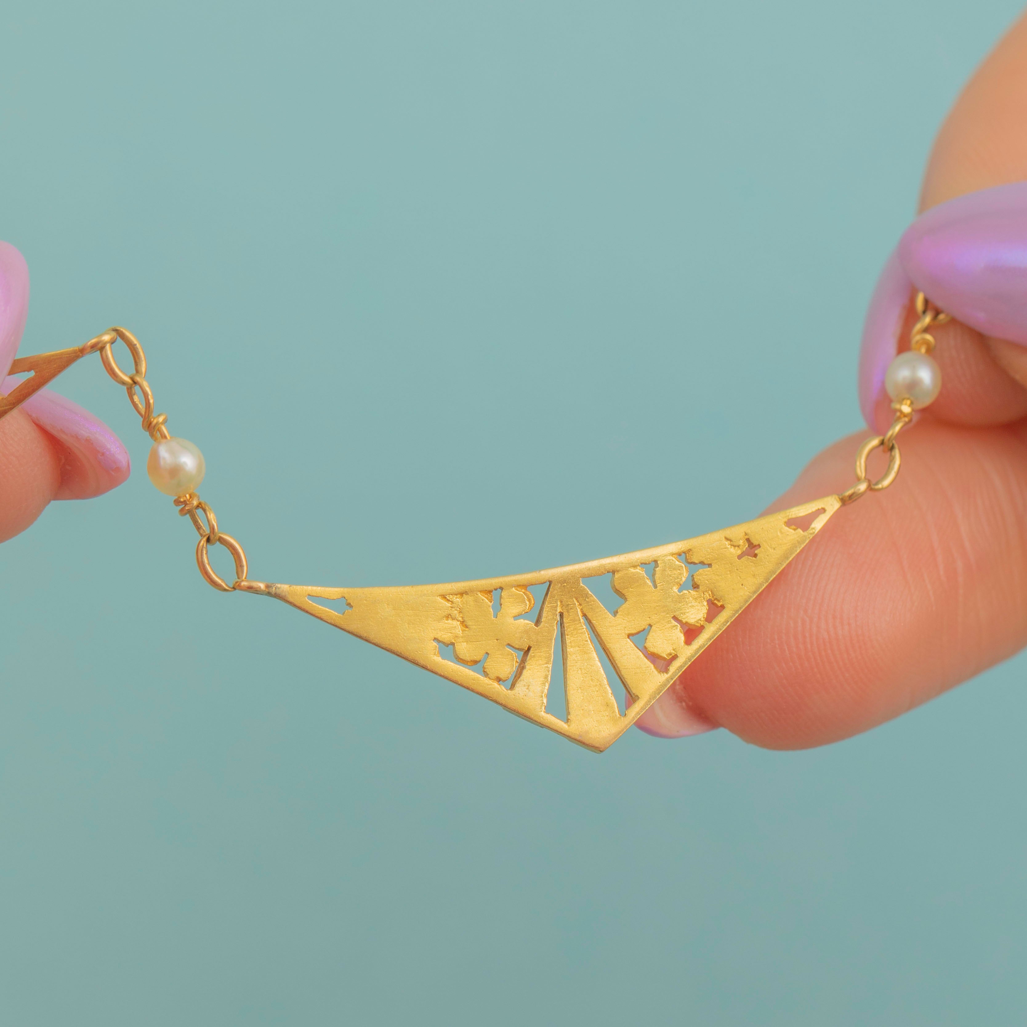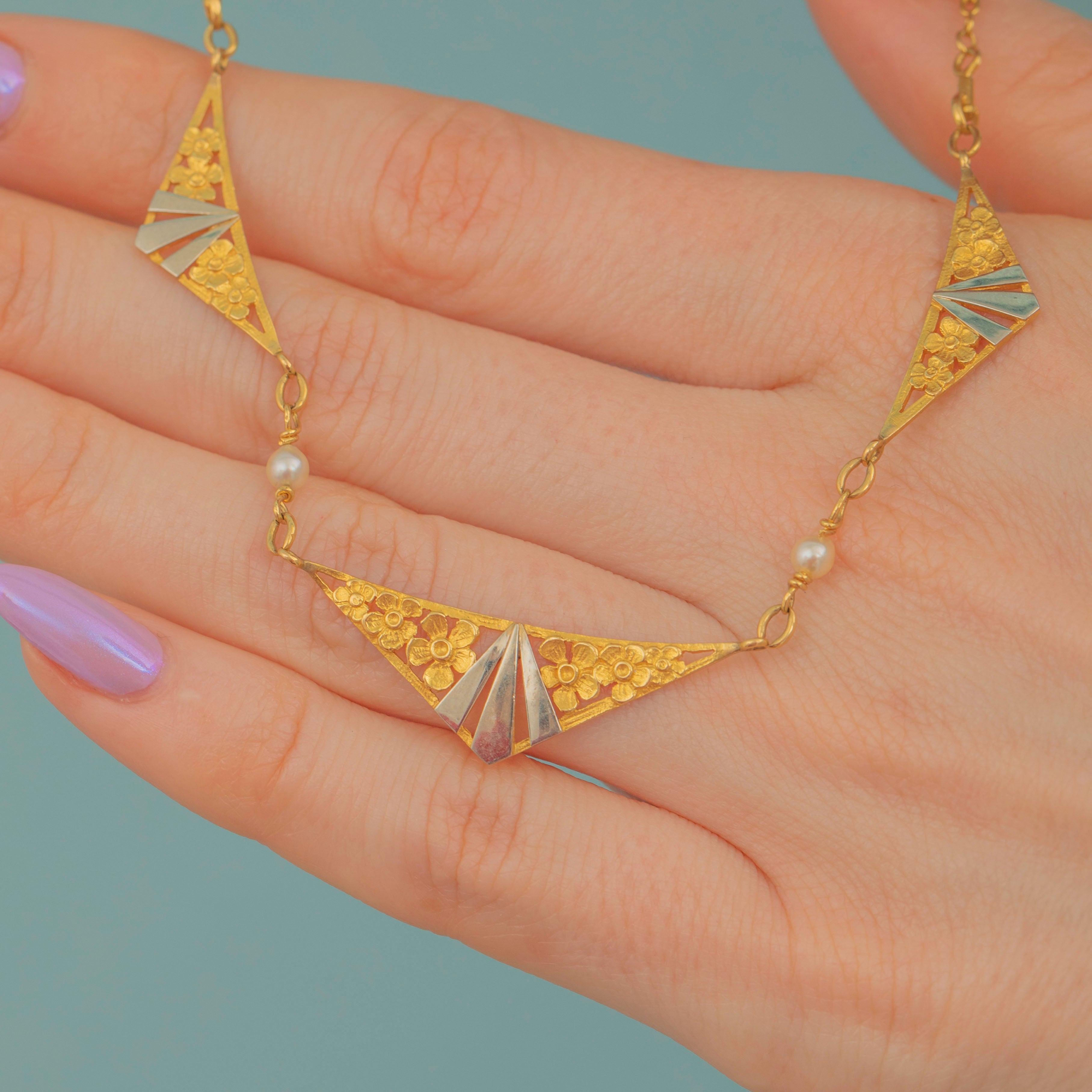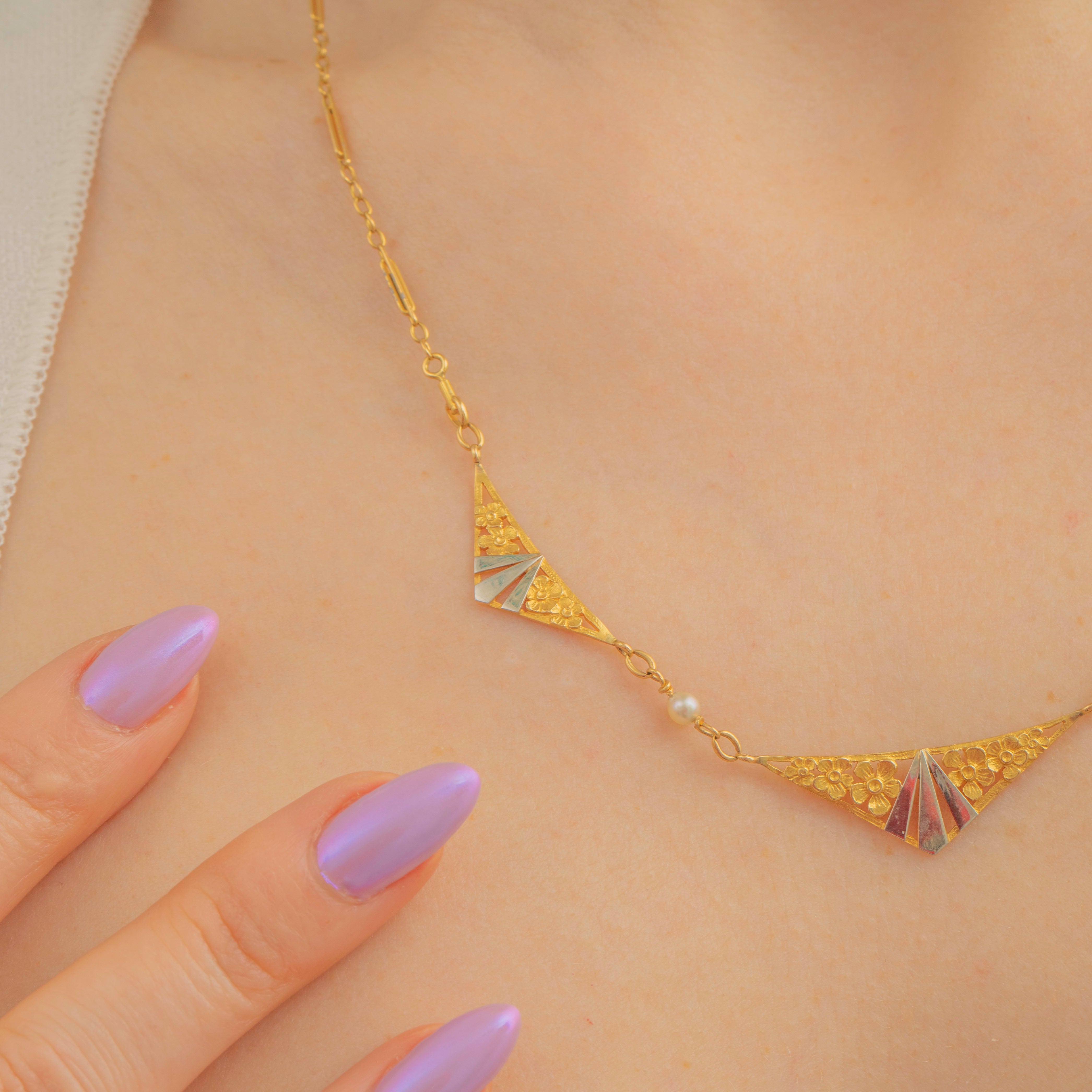 You will get lost in the exquisite details of this French antique 18ct Gold Pearl floral lozenge necklace! Beautifully formed from buttery 18ct Gold and studded with iridescent Pearls, this Art Deco necklace perfectly captures the superb craftsmanship of the era.