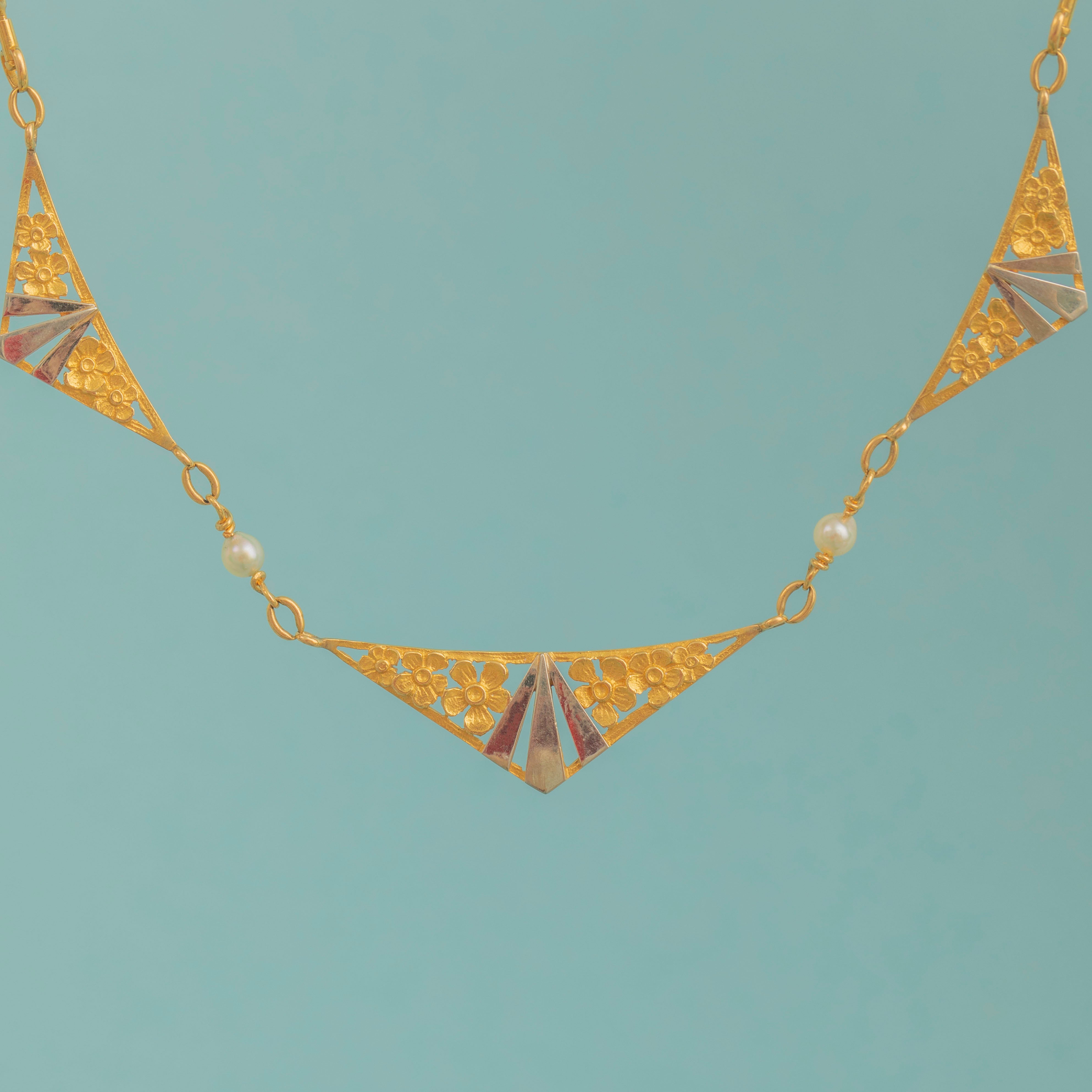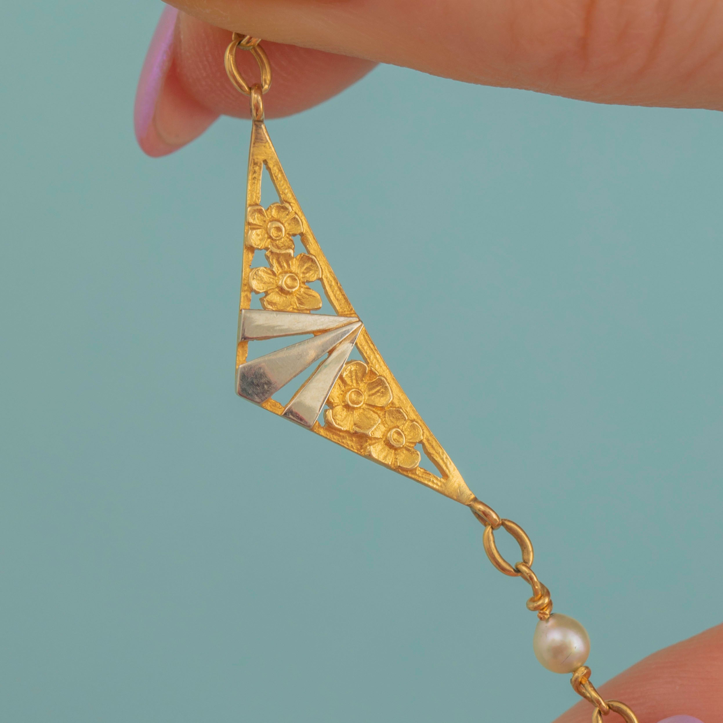 French Antique 18ct Gold Pearl Floral Lozenge Necklace, c.1920