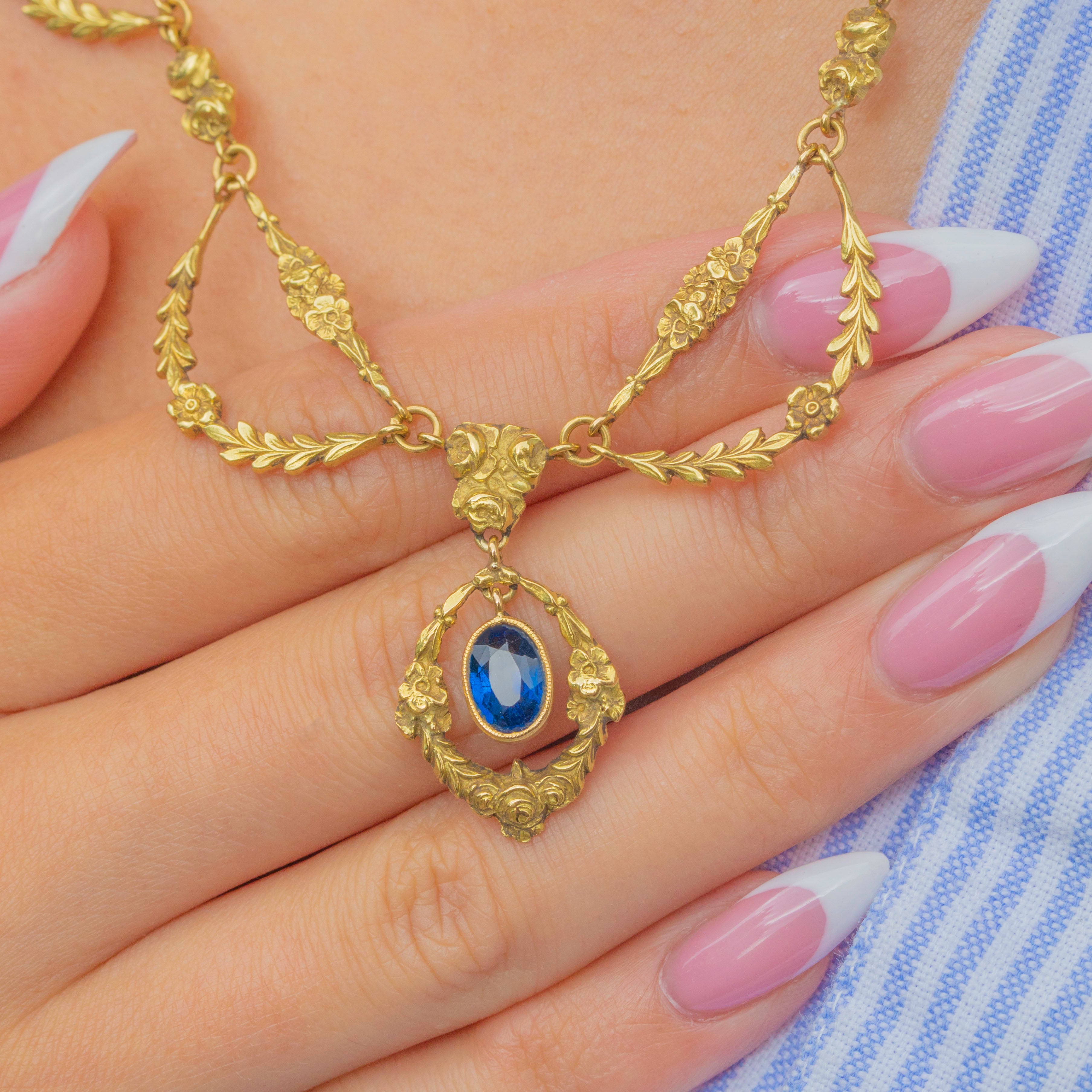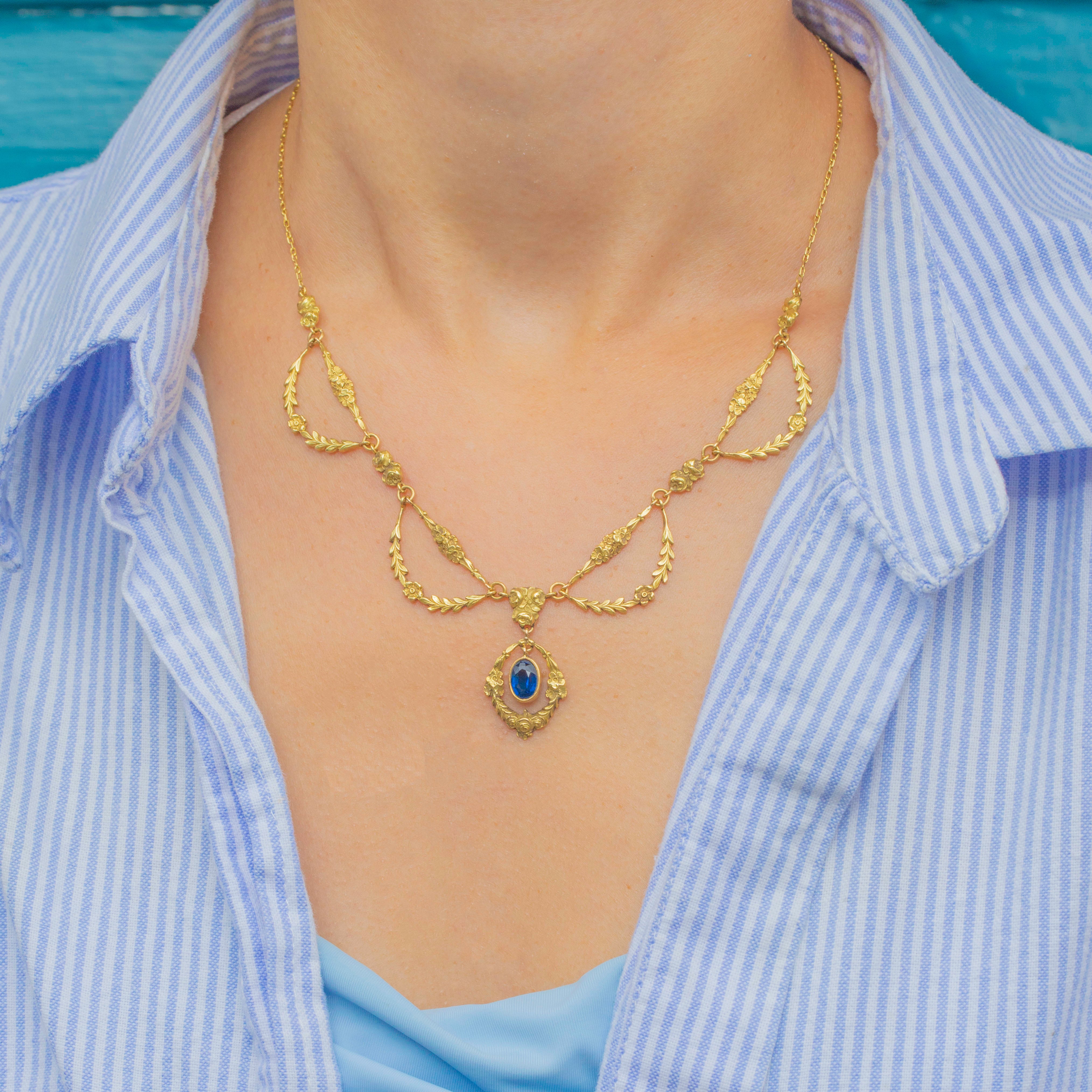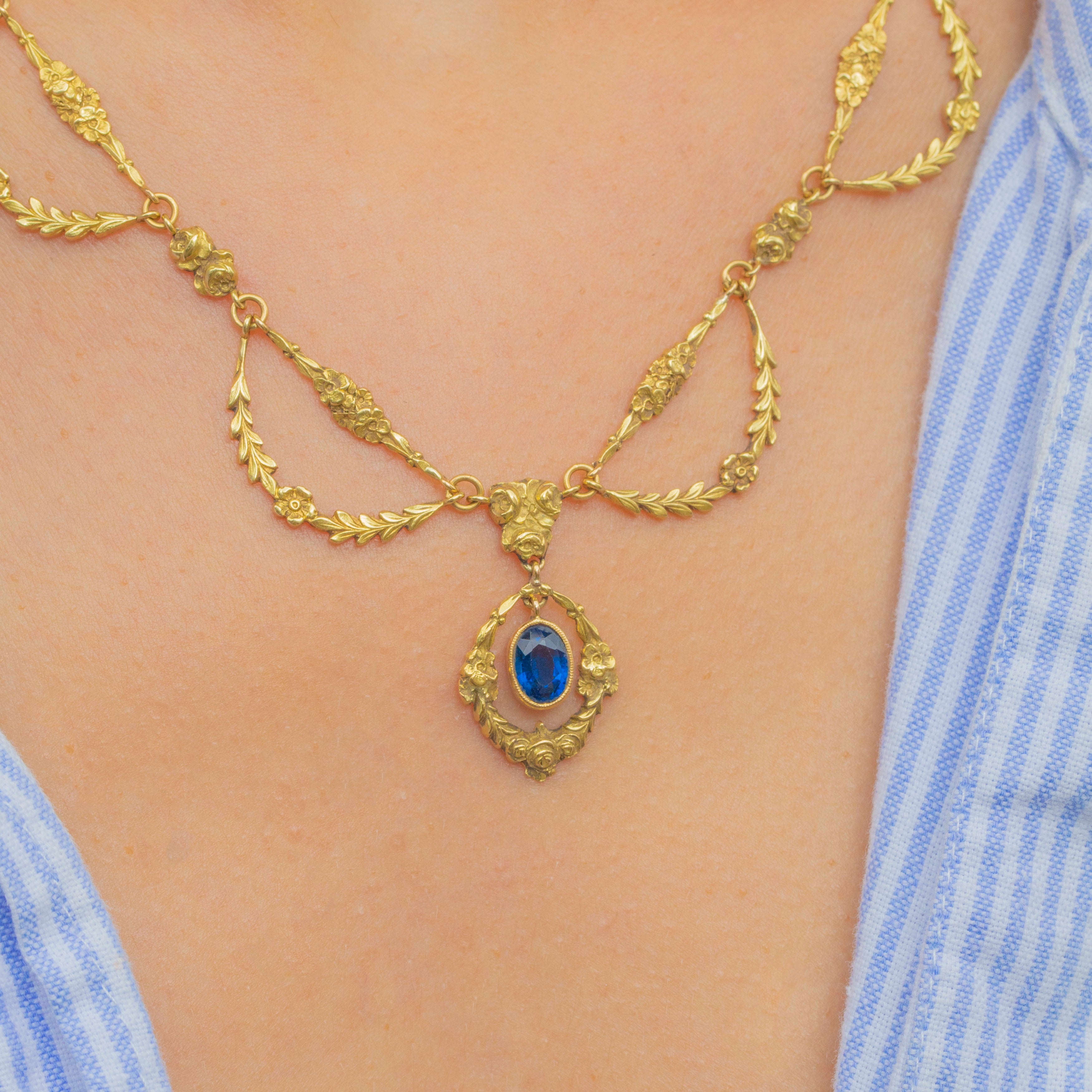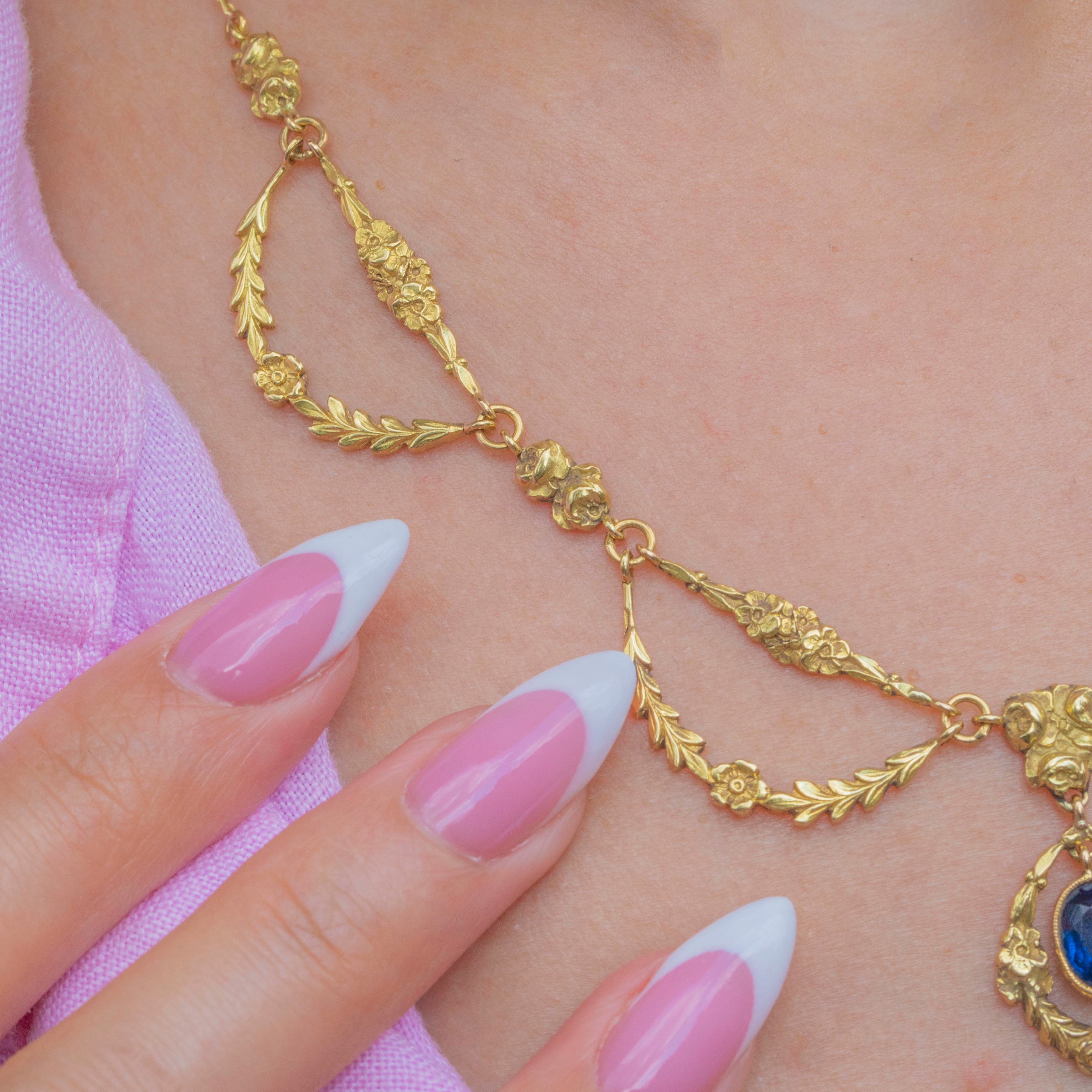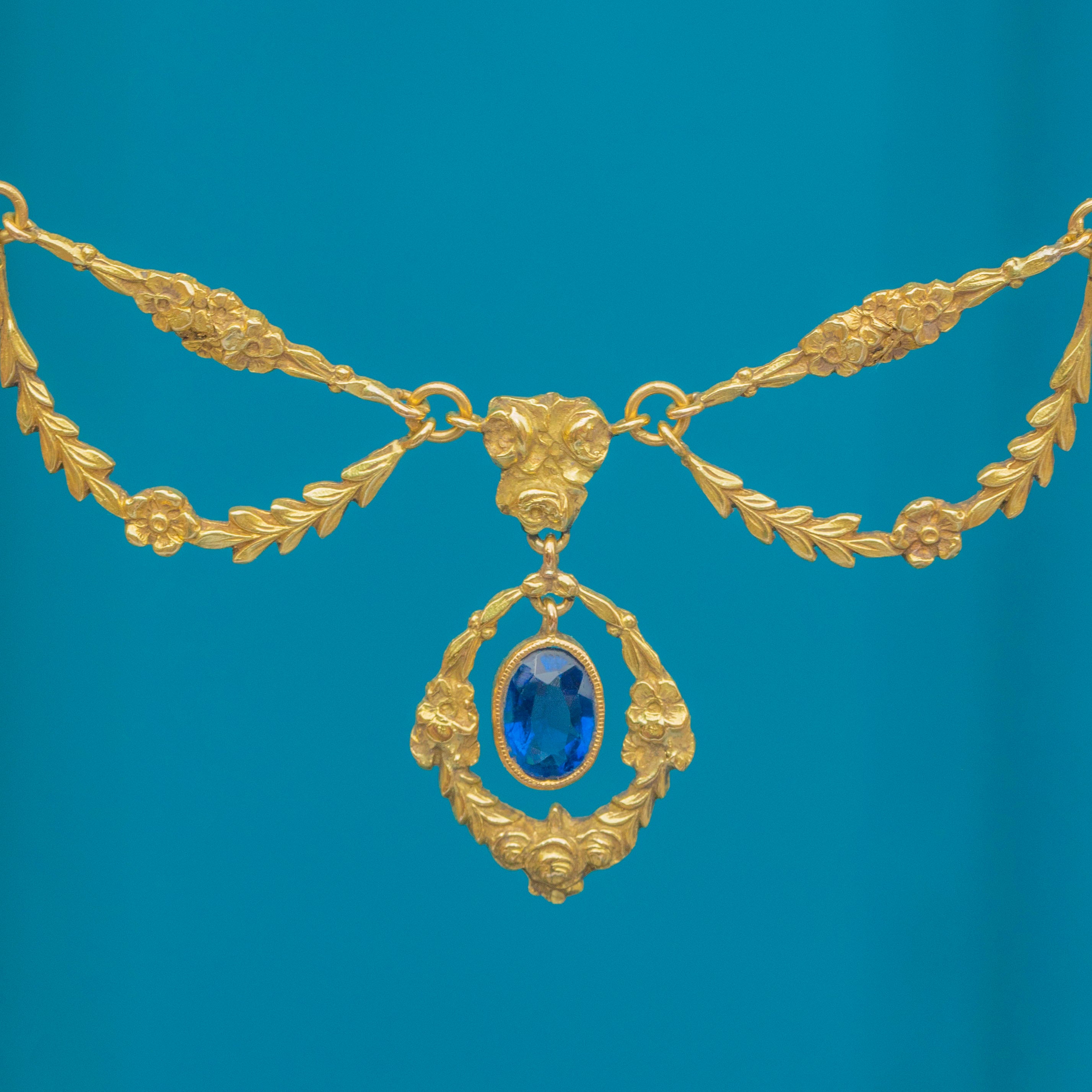 French Art Nouveau 18ct Gold Floral Swag Necklace with Blue Paste