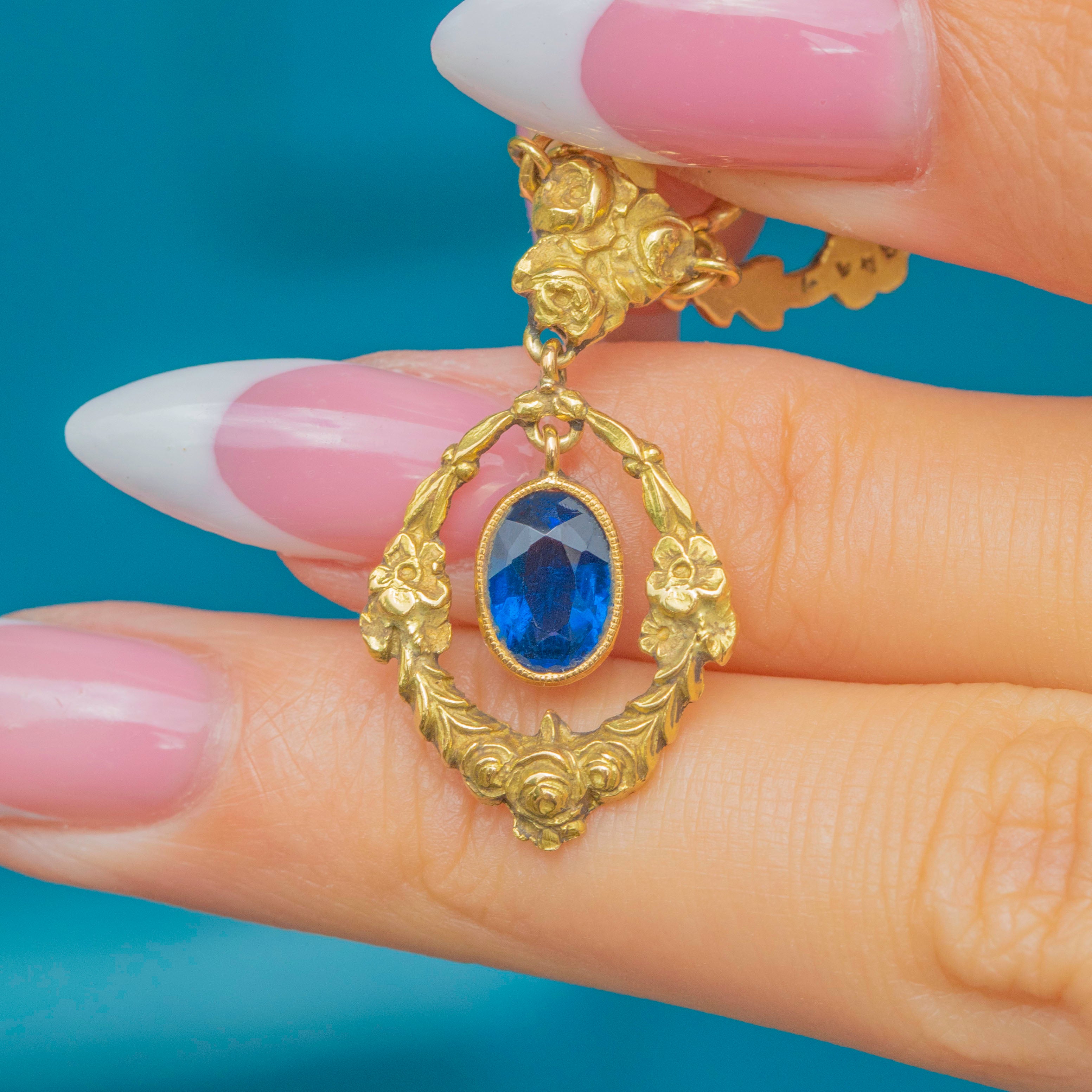 The necklace is adorned throughout with intricate foliate motifs and is features a saturated blue Paste drop focal point. Complete with French stamps, this antique swag necklace radiates Art Nouveau charm!