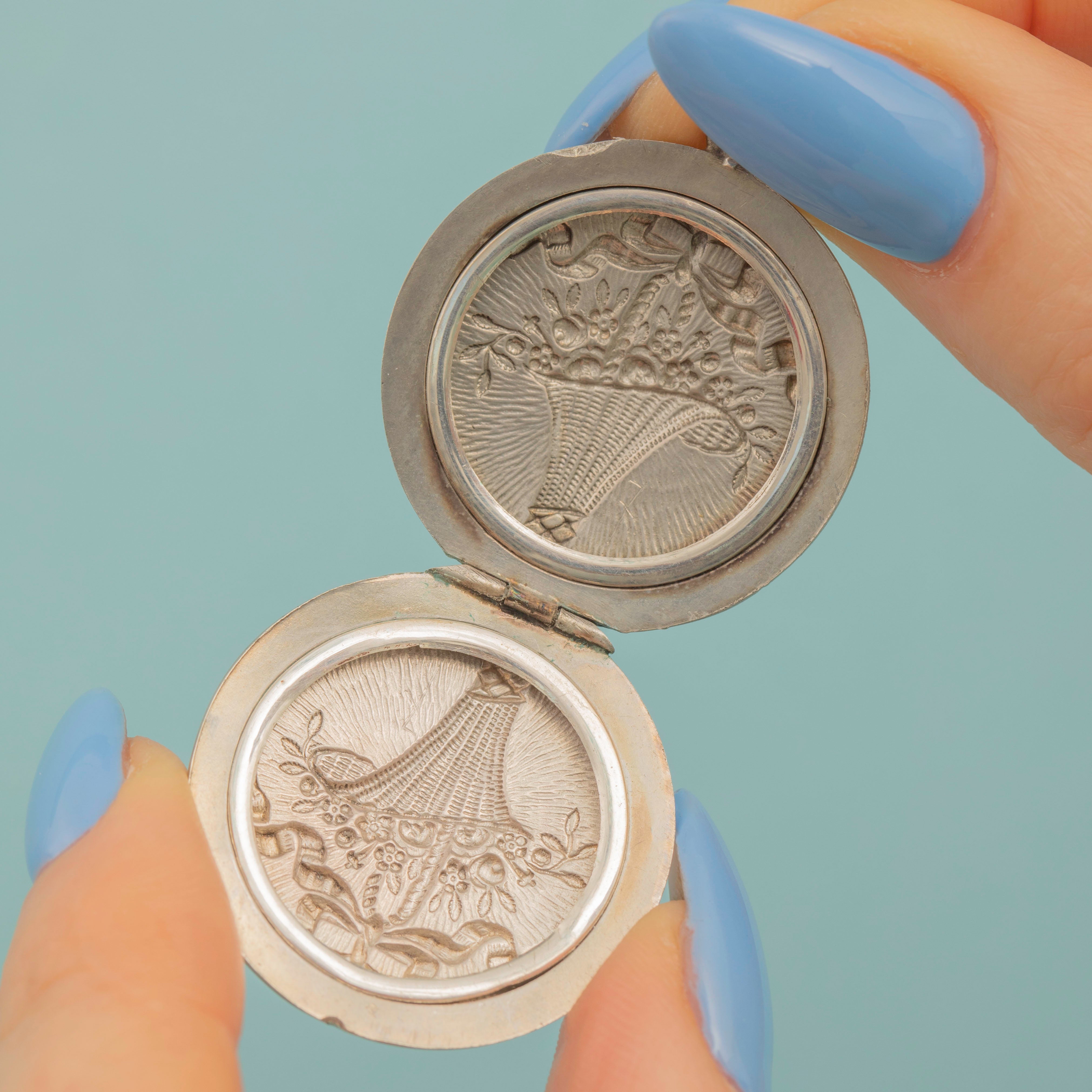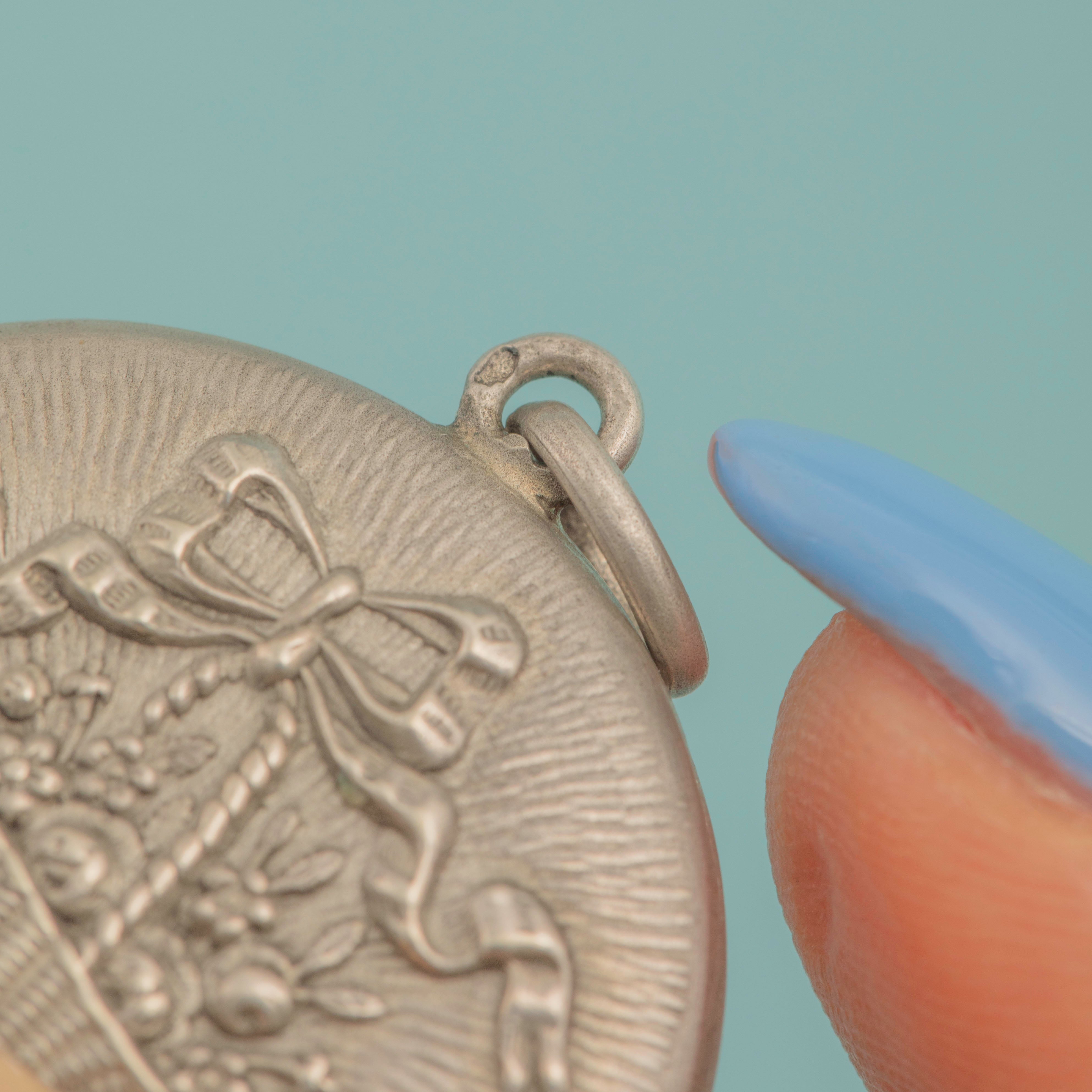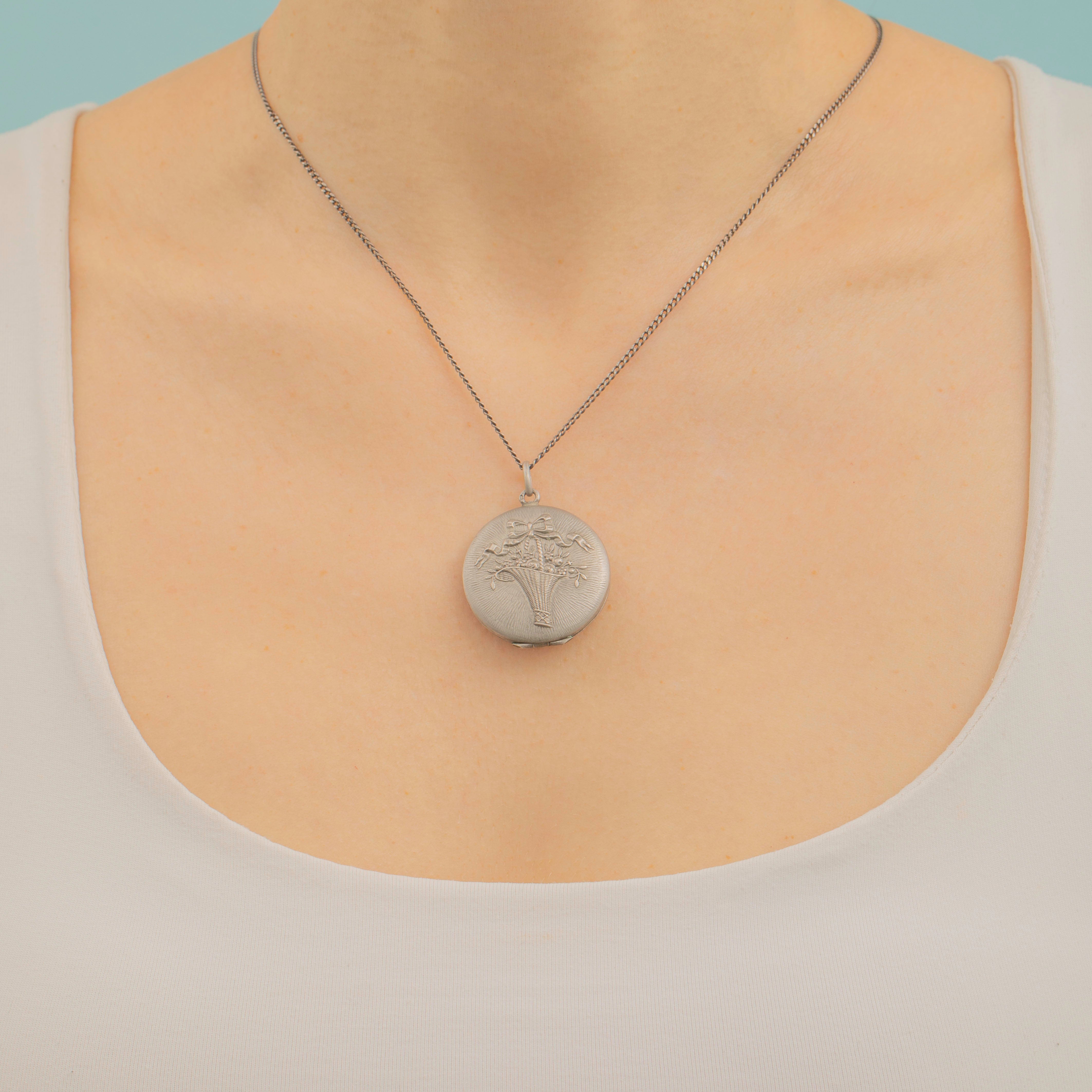 Epitomising the whimsical and ethereal aesthetic of the Art Nouveau era, this striking repoussé locket features an abundant basket of flowers with a perfectly tied ribbon on top! With space for two photographs to be added inside, this antique locket would make a lovely sentimental gift choice or wonderful treat for yourself.