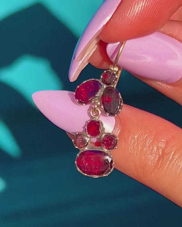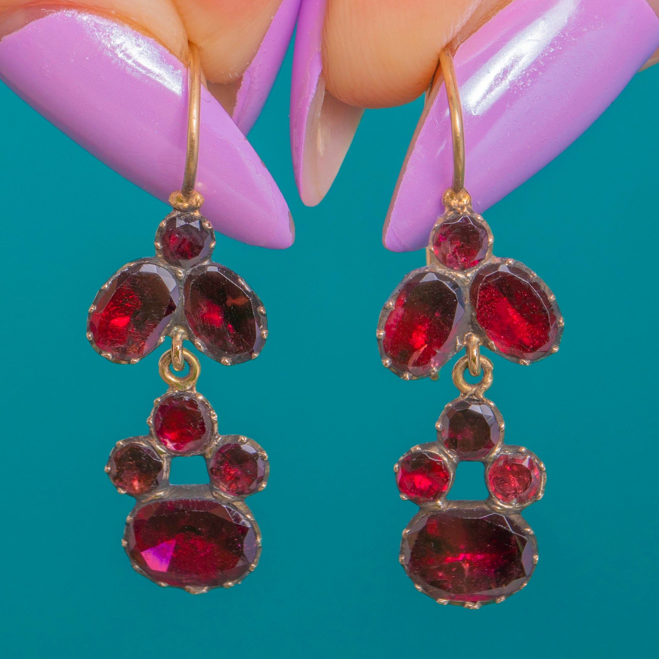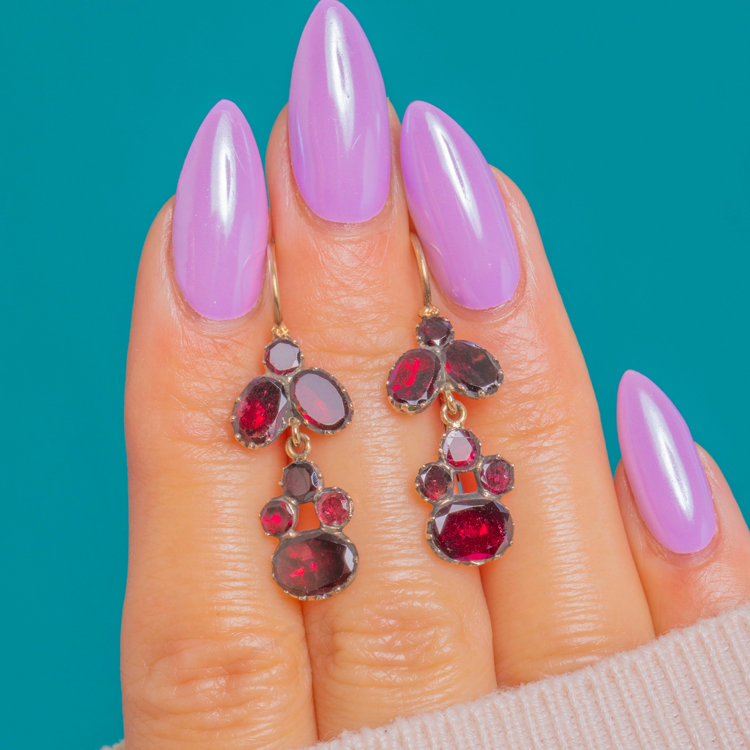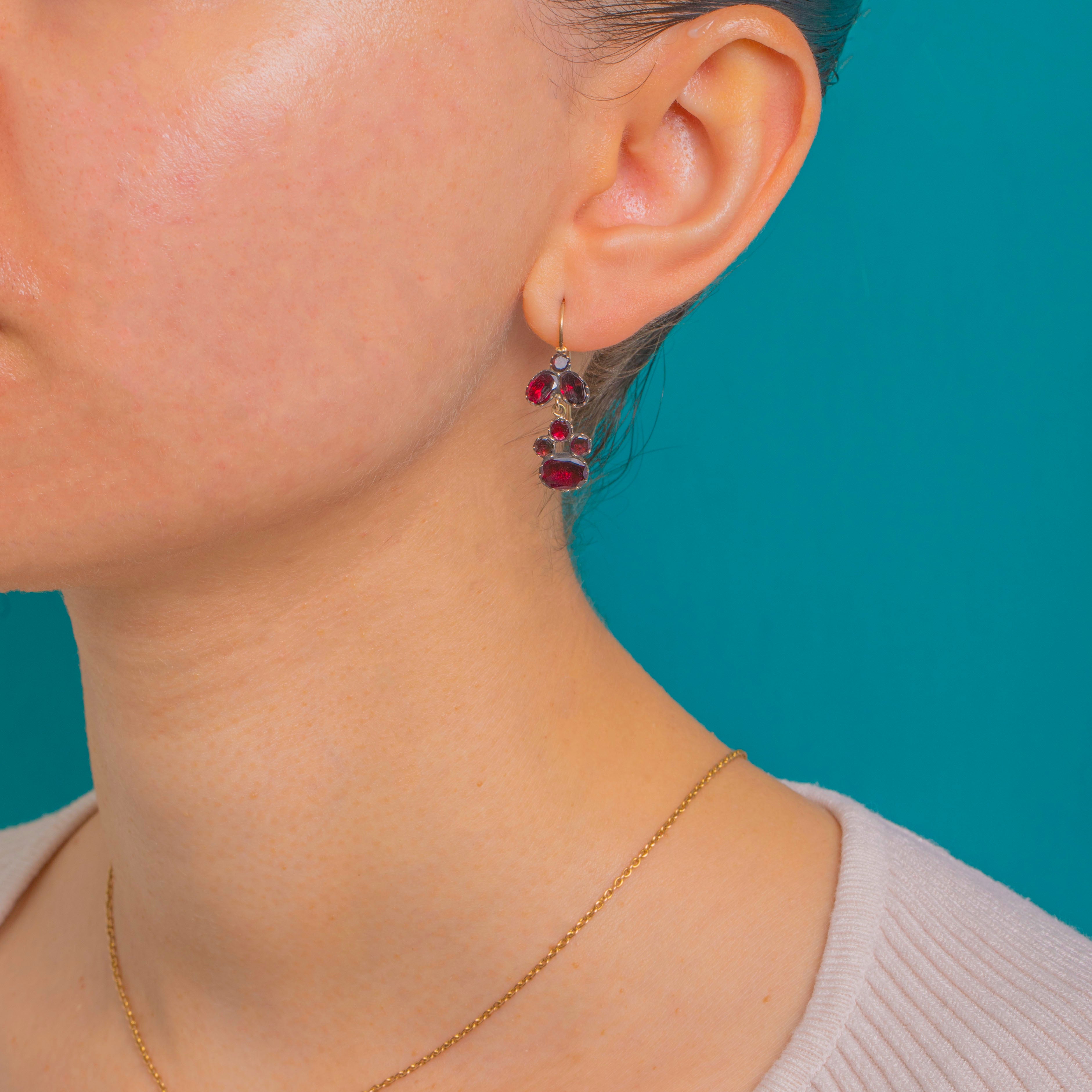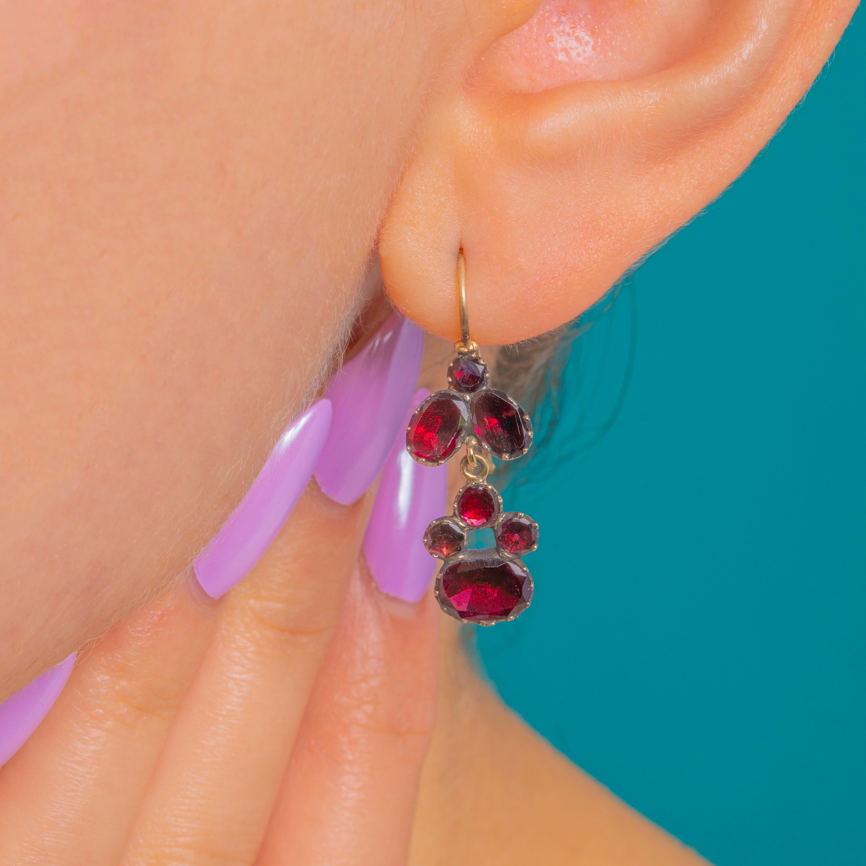 Elegant and richly hued, these Georgian Garnet drop earrings showcase glowing foiled flat-cut Garnets set in 15ct Gold settings. A charming cluster arrangement flows into a larger pendant drop below, creating a graceful, tapering silhouette that moves beautifully with the wearer.