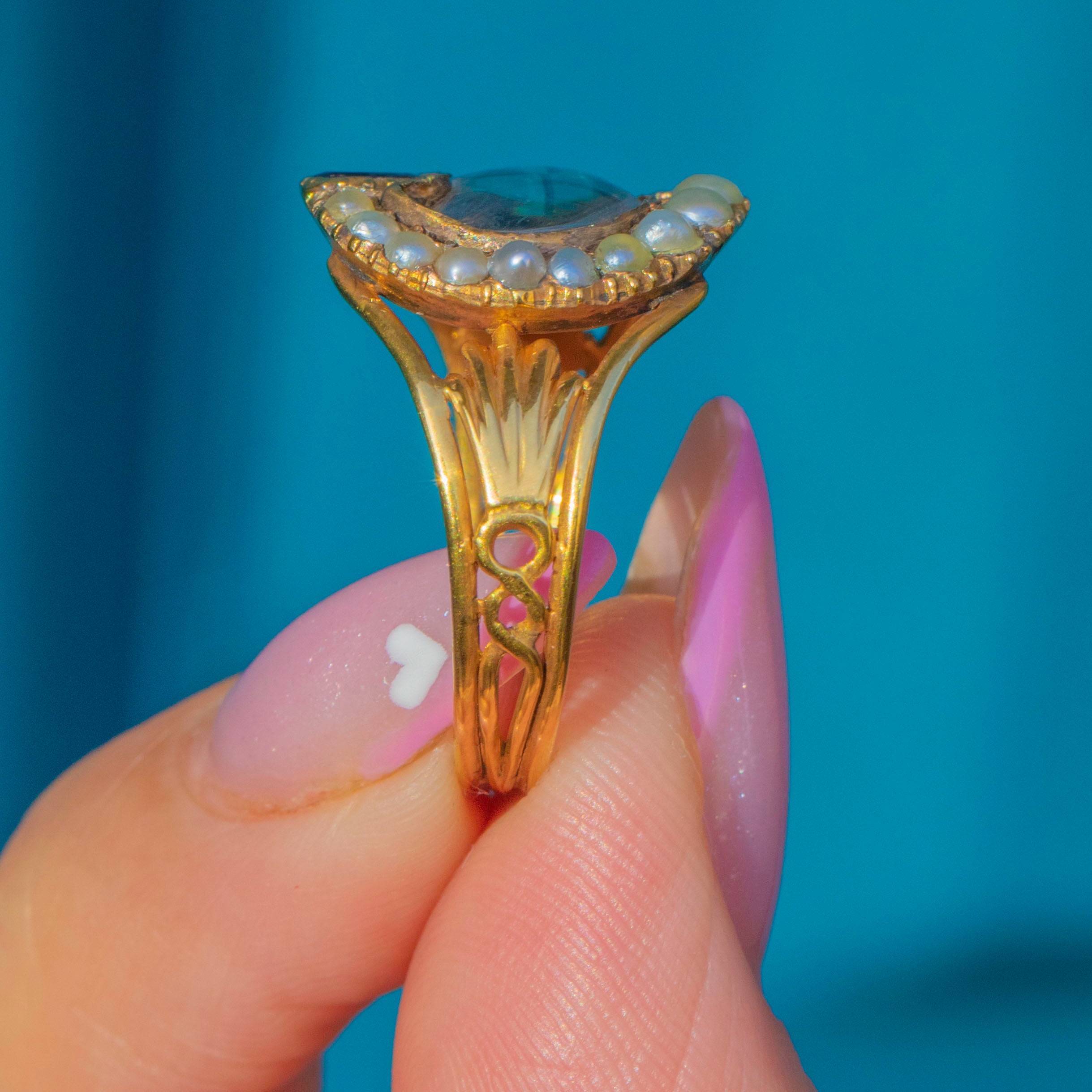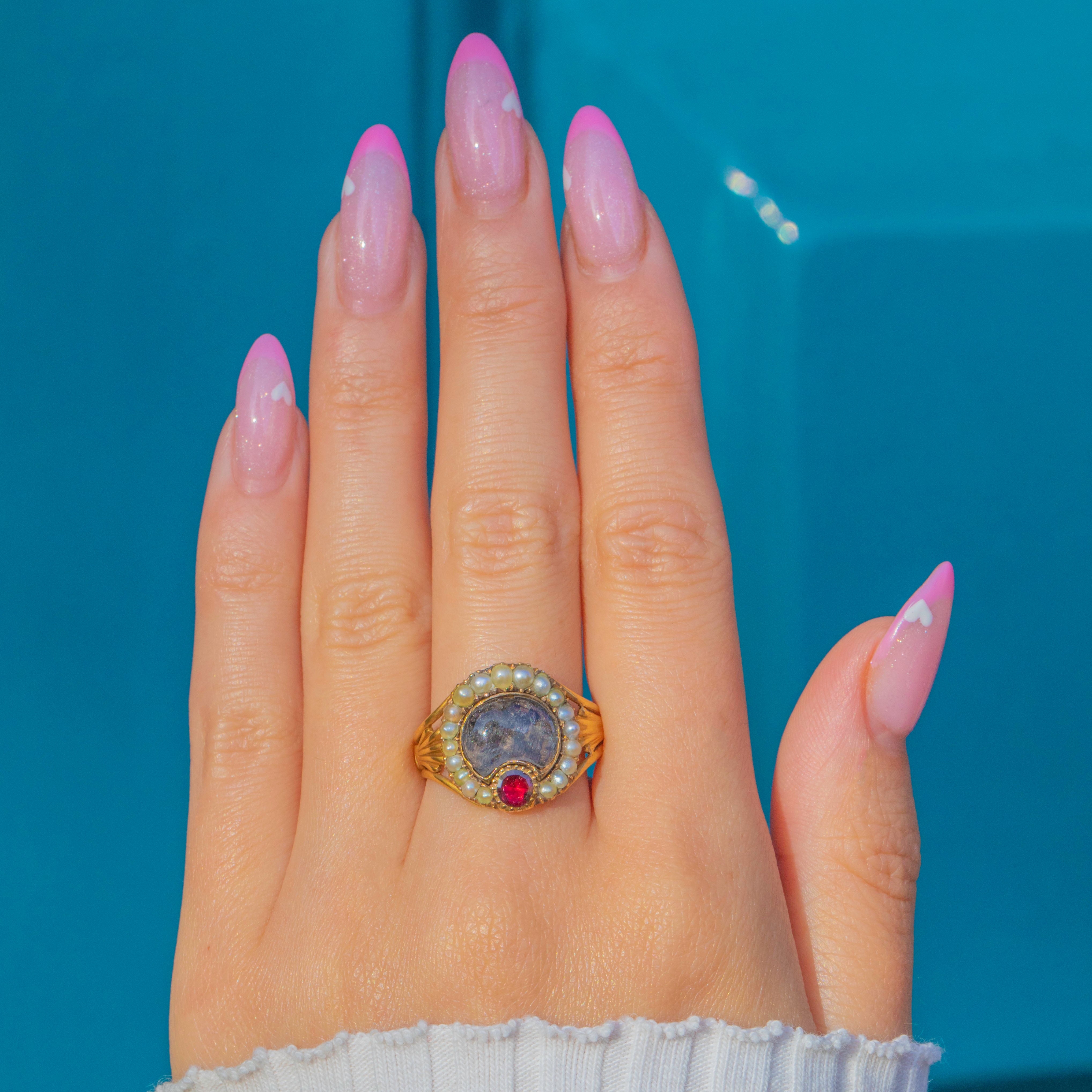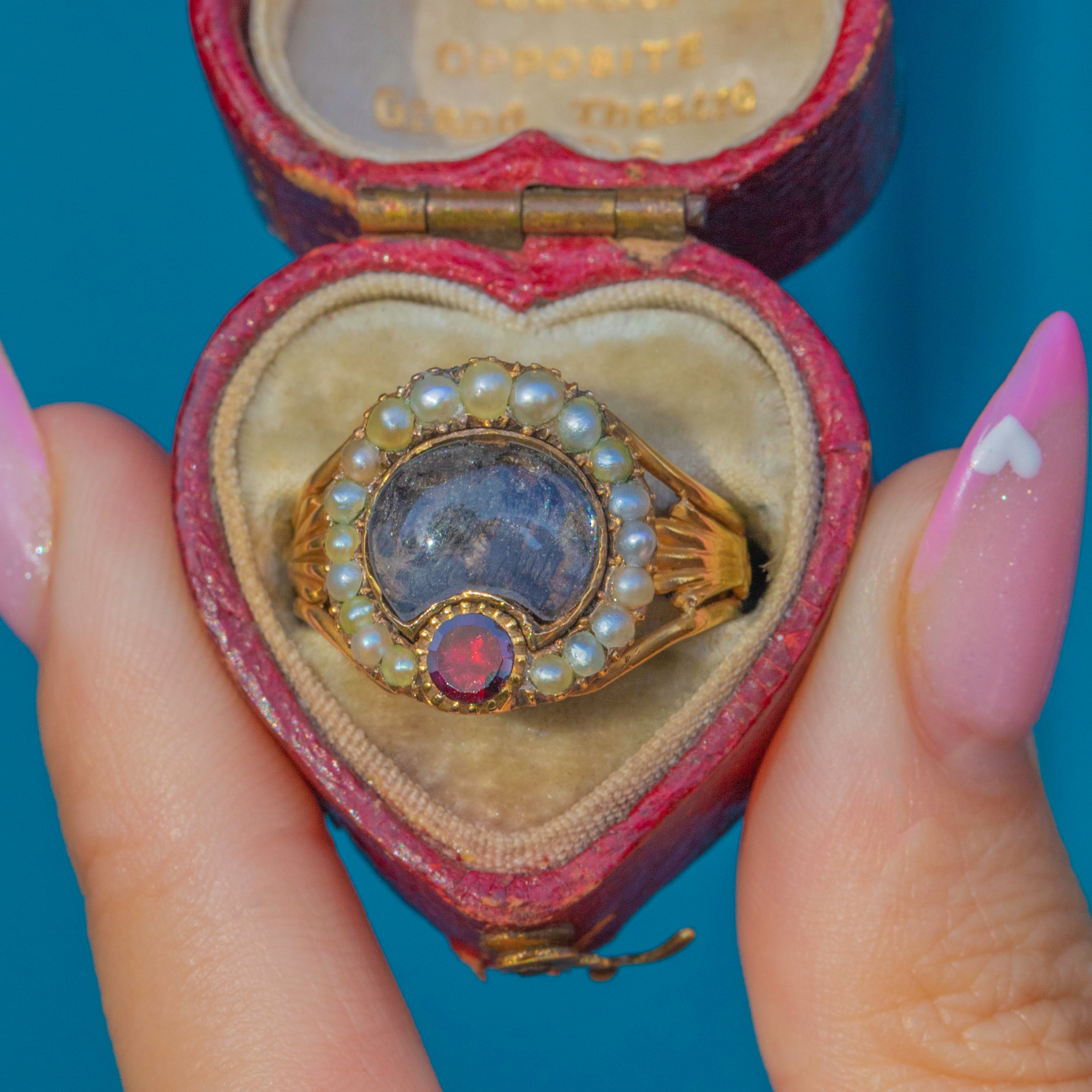 Elegant and symbolic, the combination of Garnet and Pearl represents love, purity, and remembrance. A beautiful example of Georgian sentimentality and craftsmanship, full of quiet emotion and historical charm.