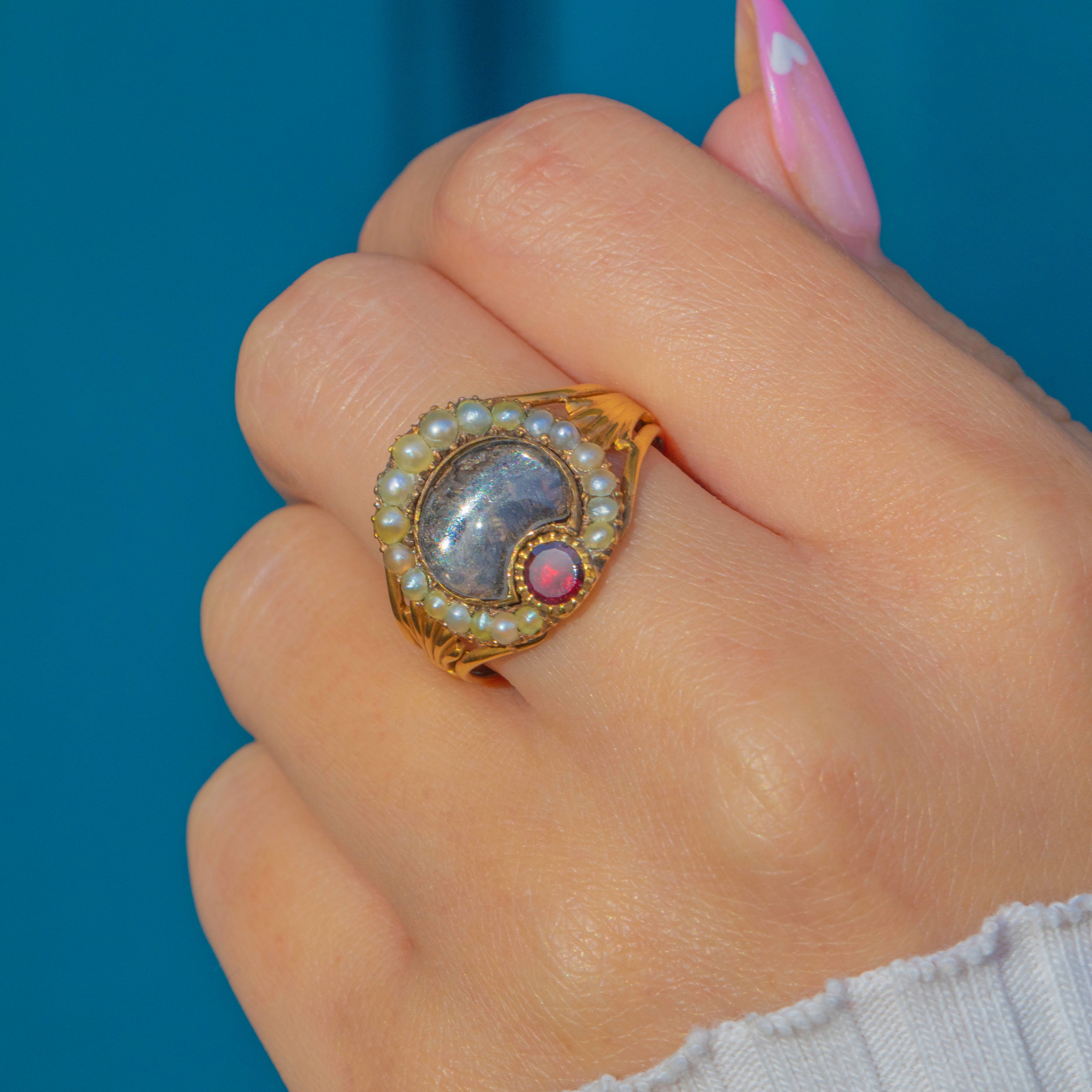 A sentimental Georgian mourning ring crafted in 15ct Gold, set with a deep red Garnet framed by delicate natural Pearls. The piece displays a lock of woven hair beneath a glass panel, a touching tribute to a loved one from the early 19th century.