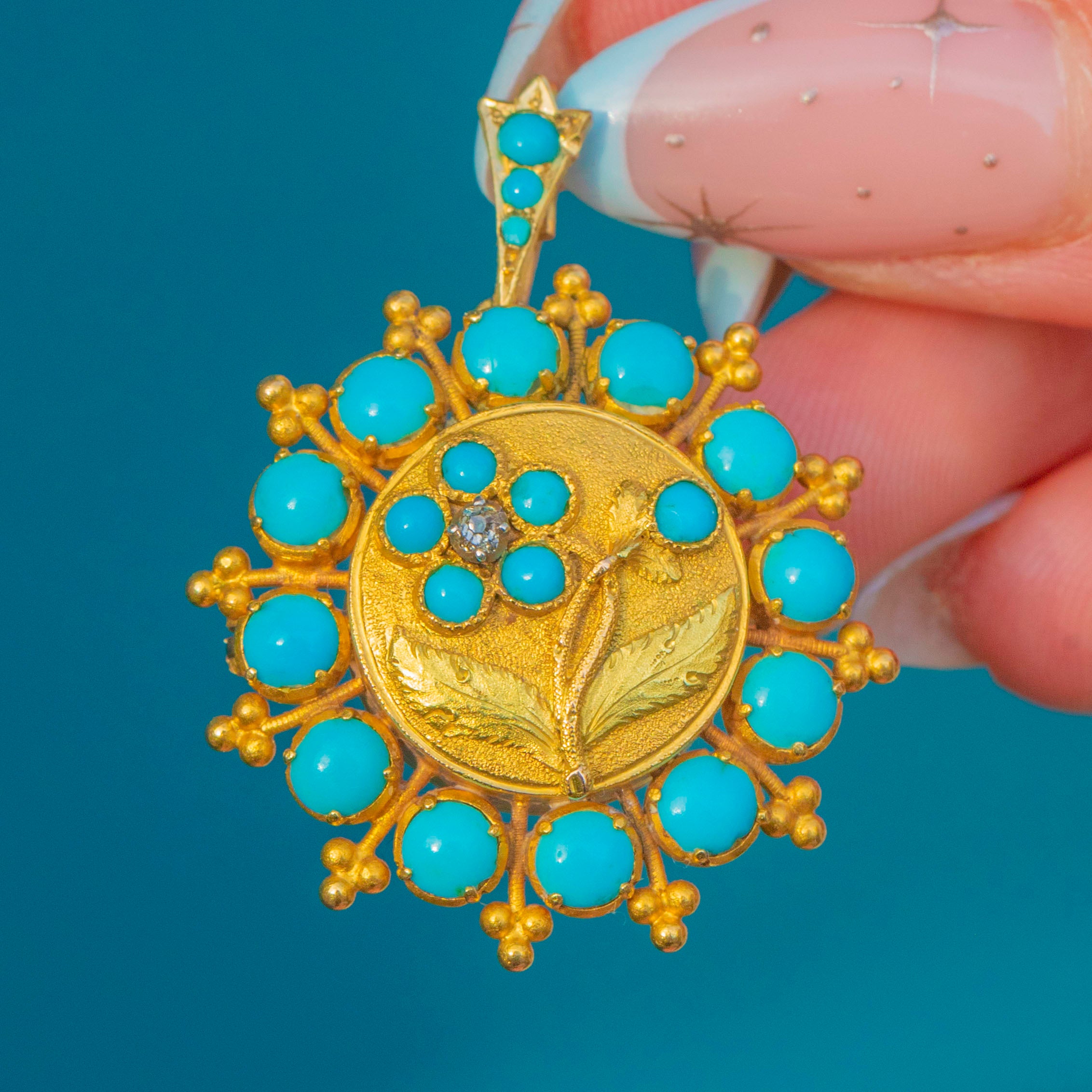 A luminous Georgian treasure in rich 15ct Gold, this convertible pendant-brooch is haloed by bright Turquoise cabochons and crowned with a petite Diamond at the heart of a delicate floral rosette. The central plaque has a satin, chased finish with applied foliate detail, while fine granulation and beaded knops lend beautiful texture and depth around the perimeter and surmount.