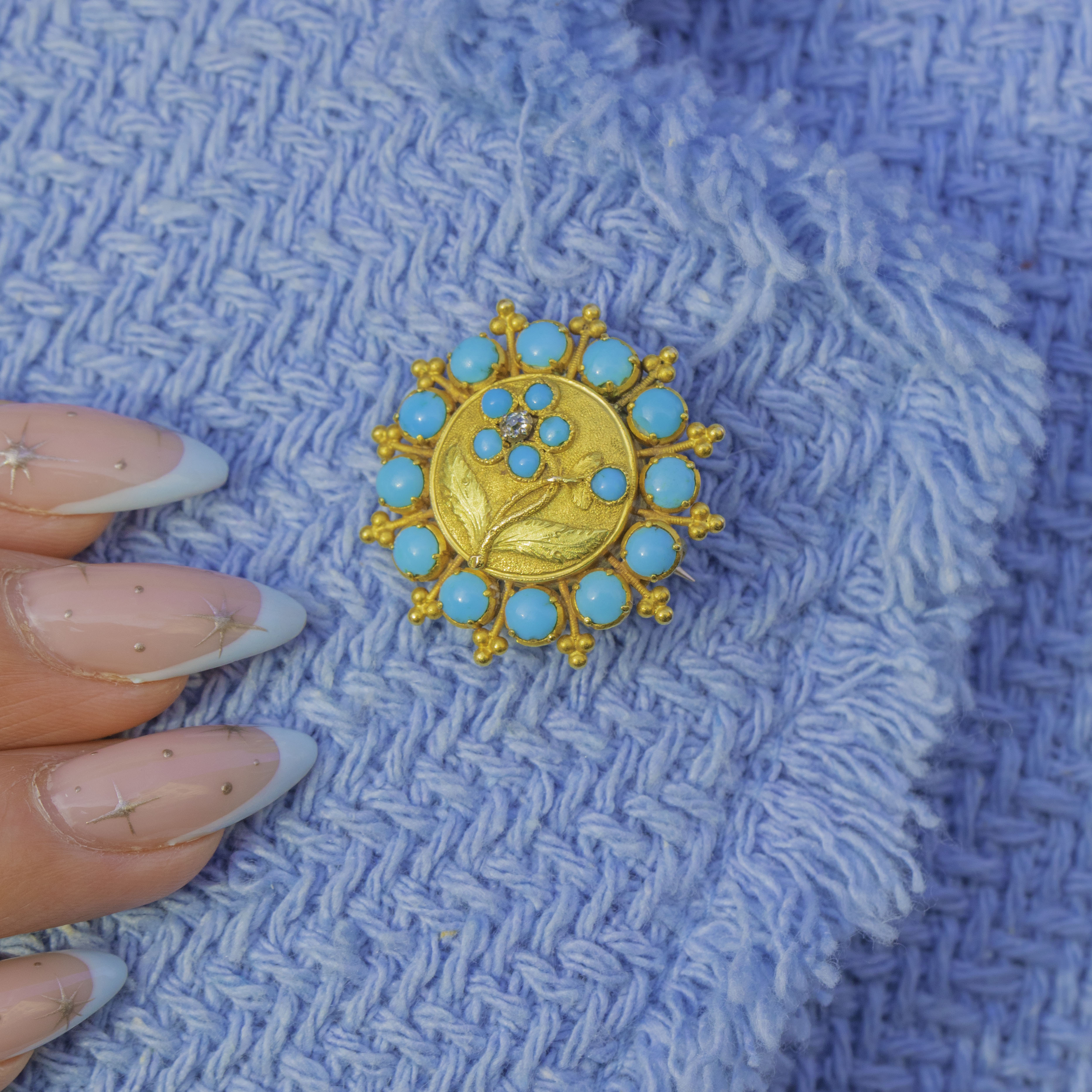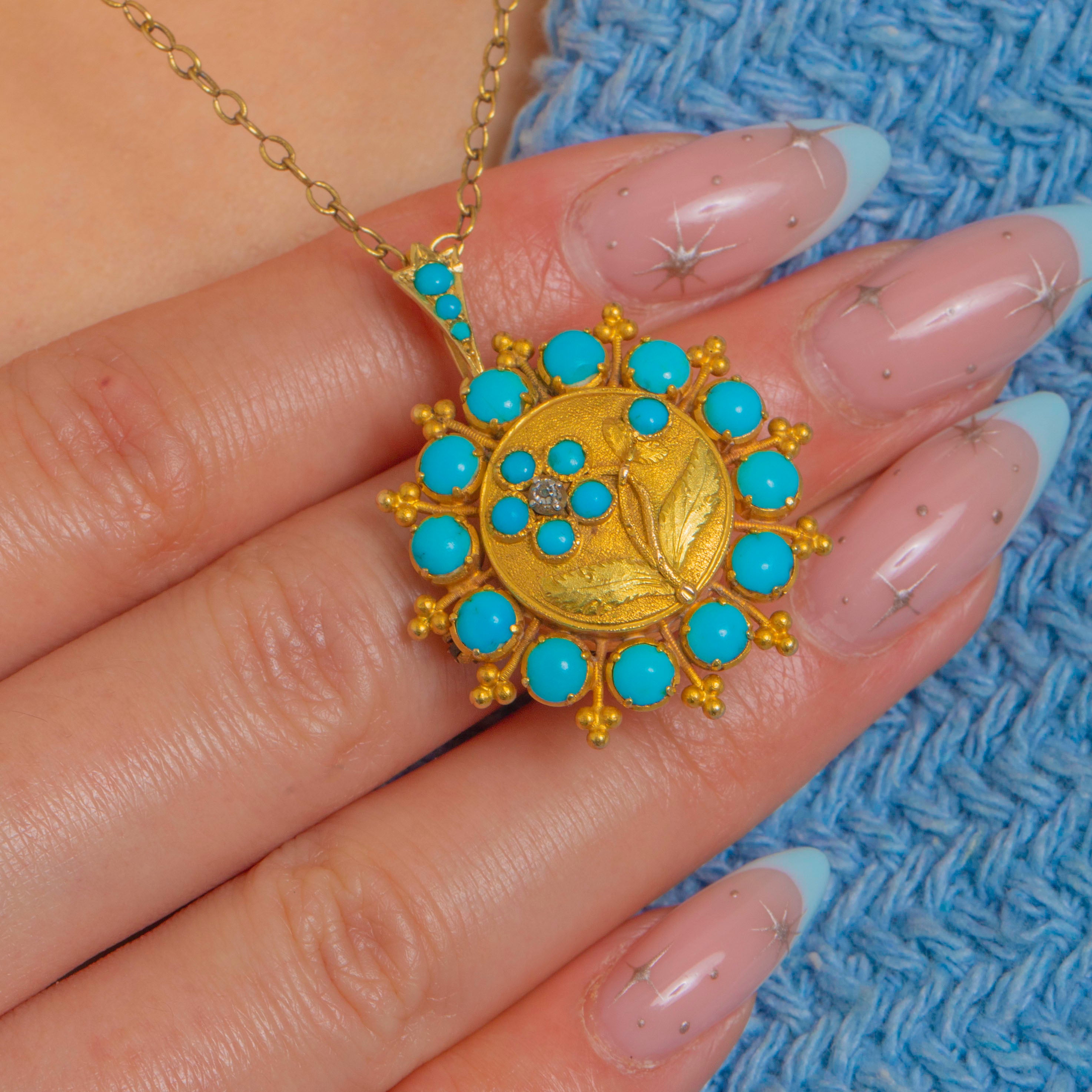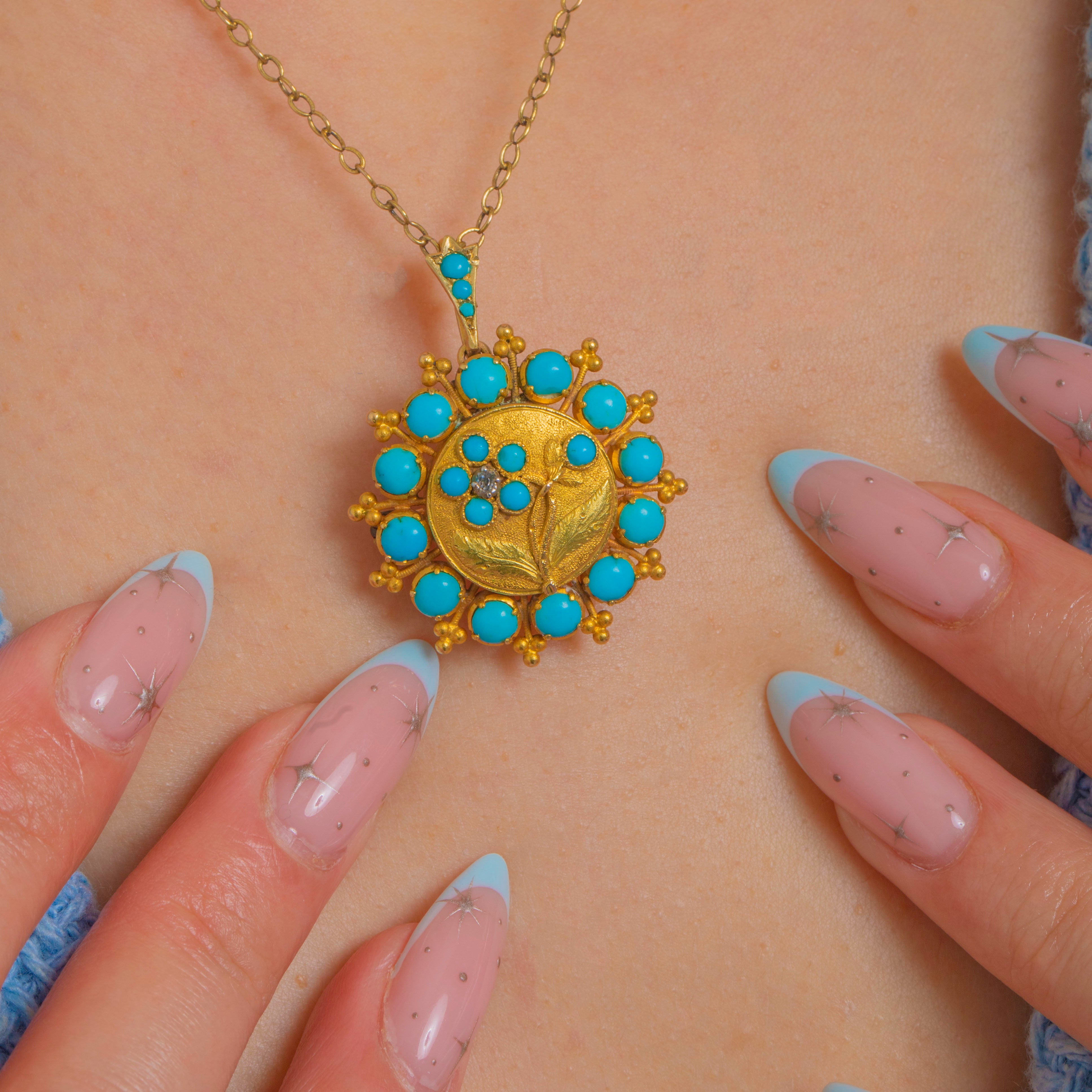 EXCELLENT: Turquoise cabochons are bright and well-matched, and the Diamond accent is lively; all stones appear secure. Gold surfaces, granulation and chased details are crisp with only light surface wear and a warm patina. The glazed locket back shows light scratches/clouding and the pin stem is slightly bent, but fittings remain functional.