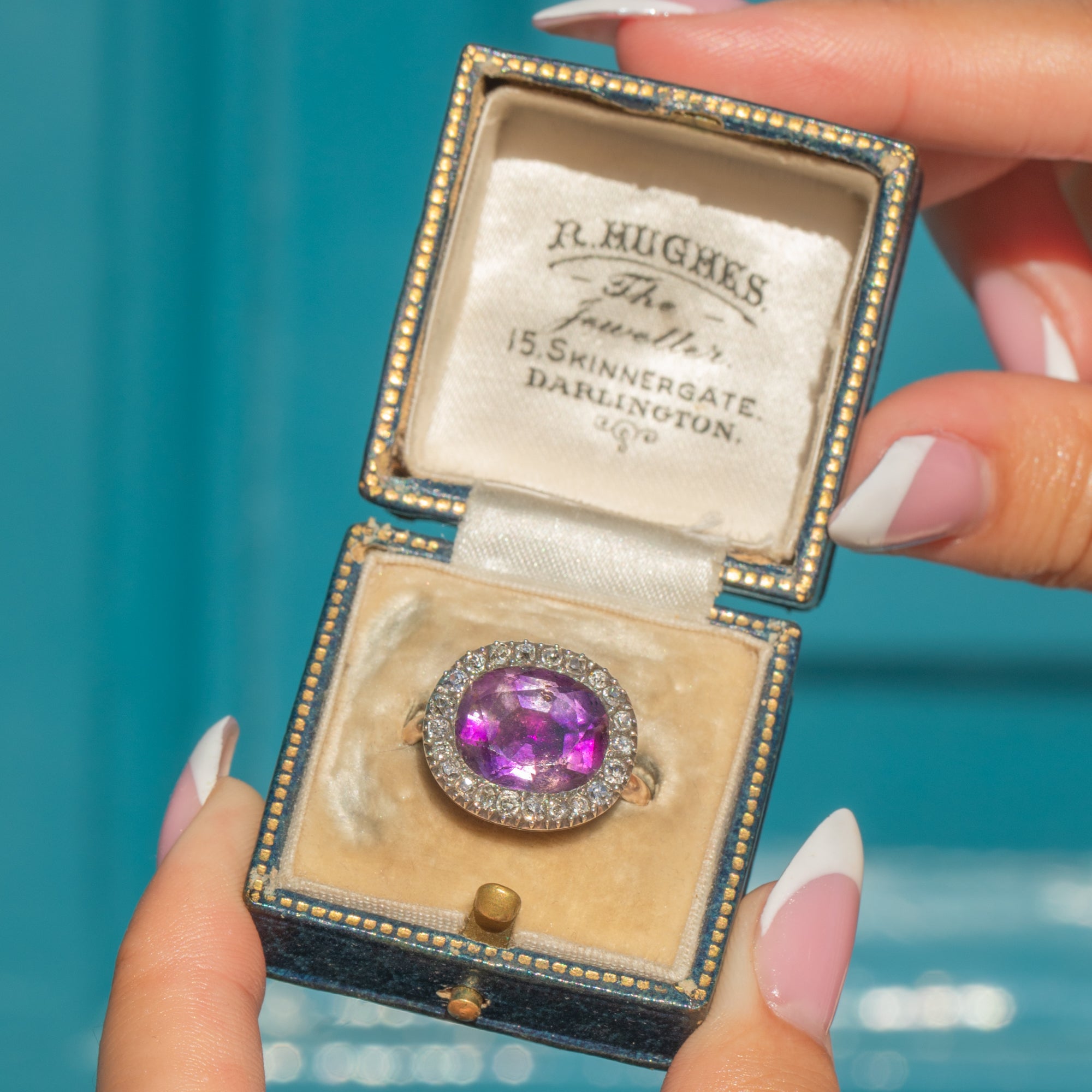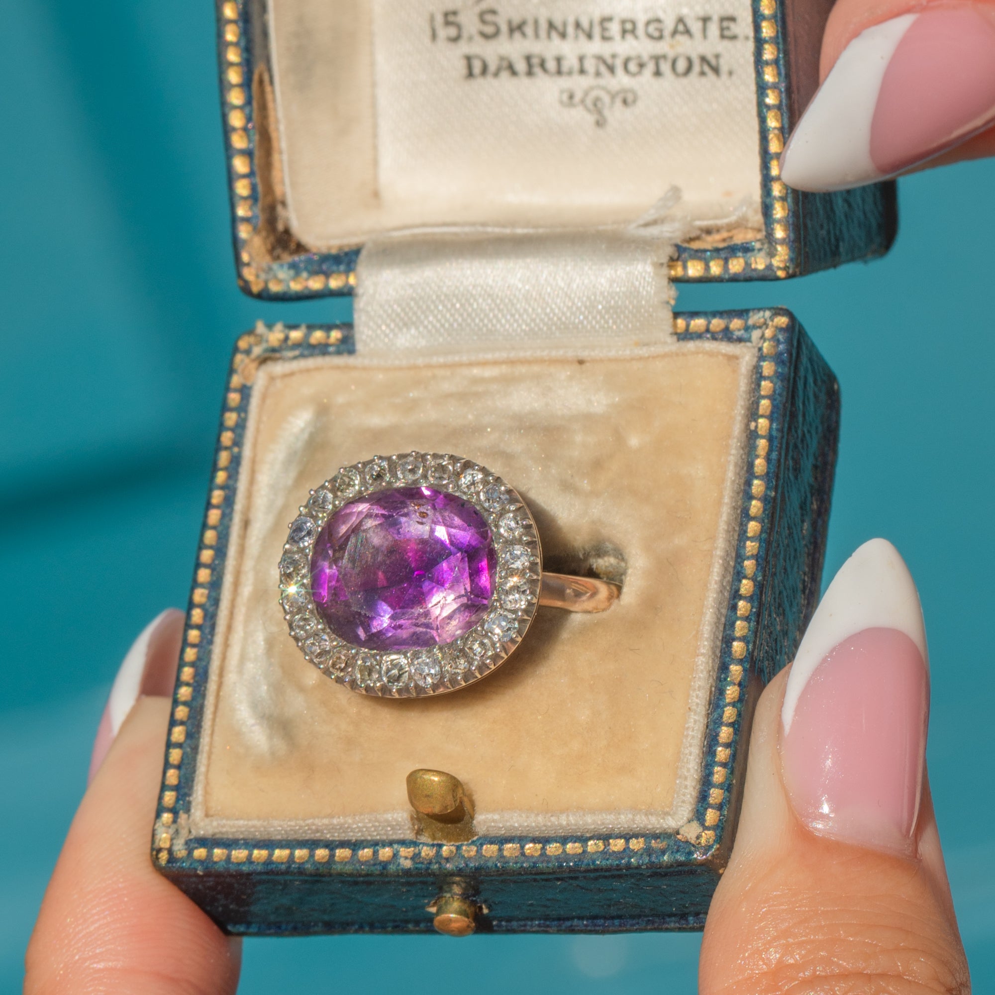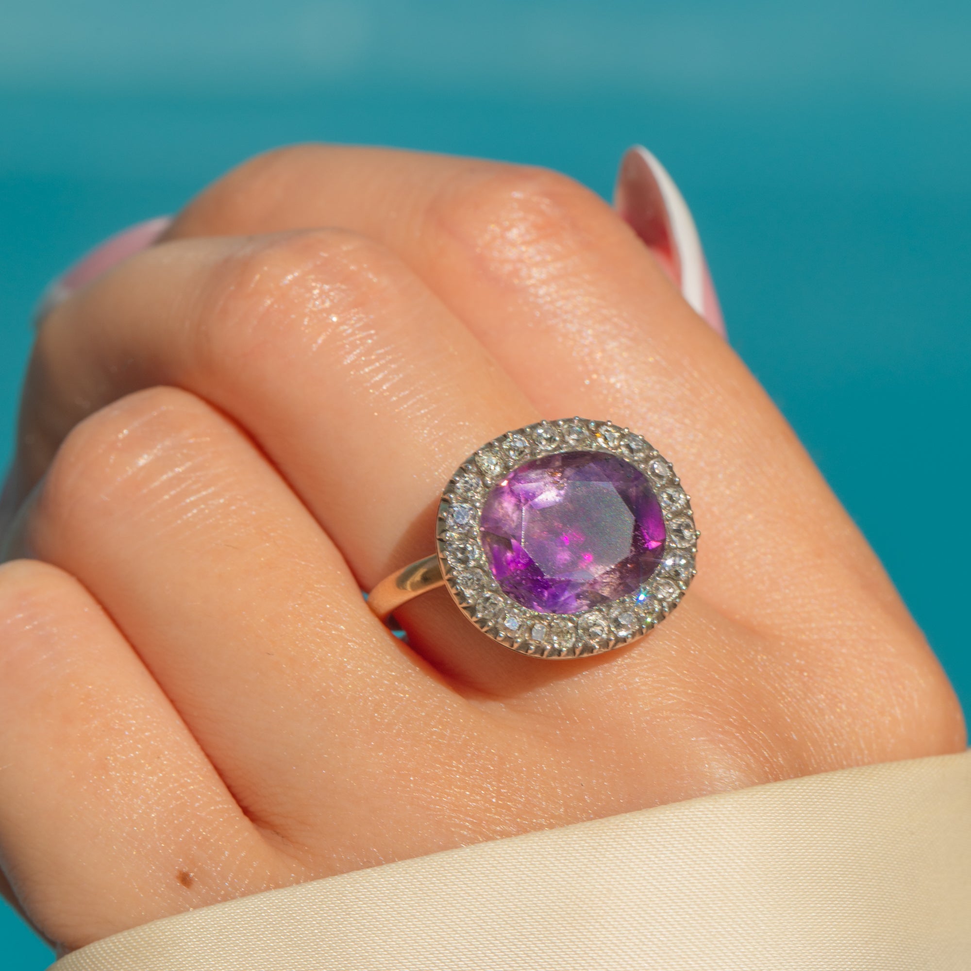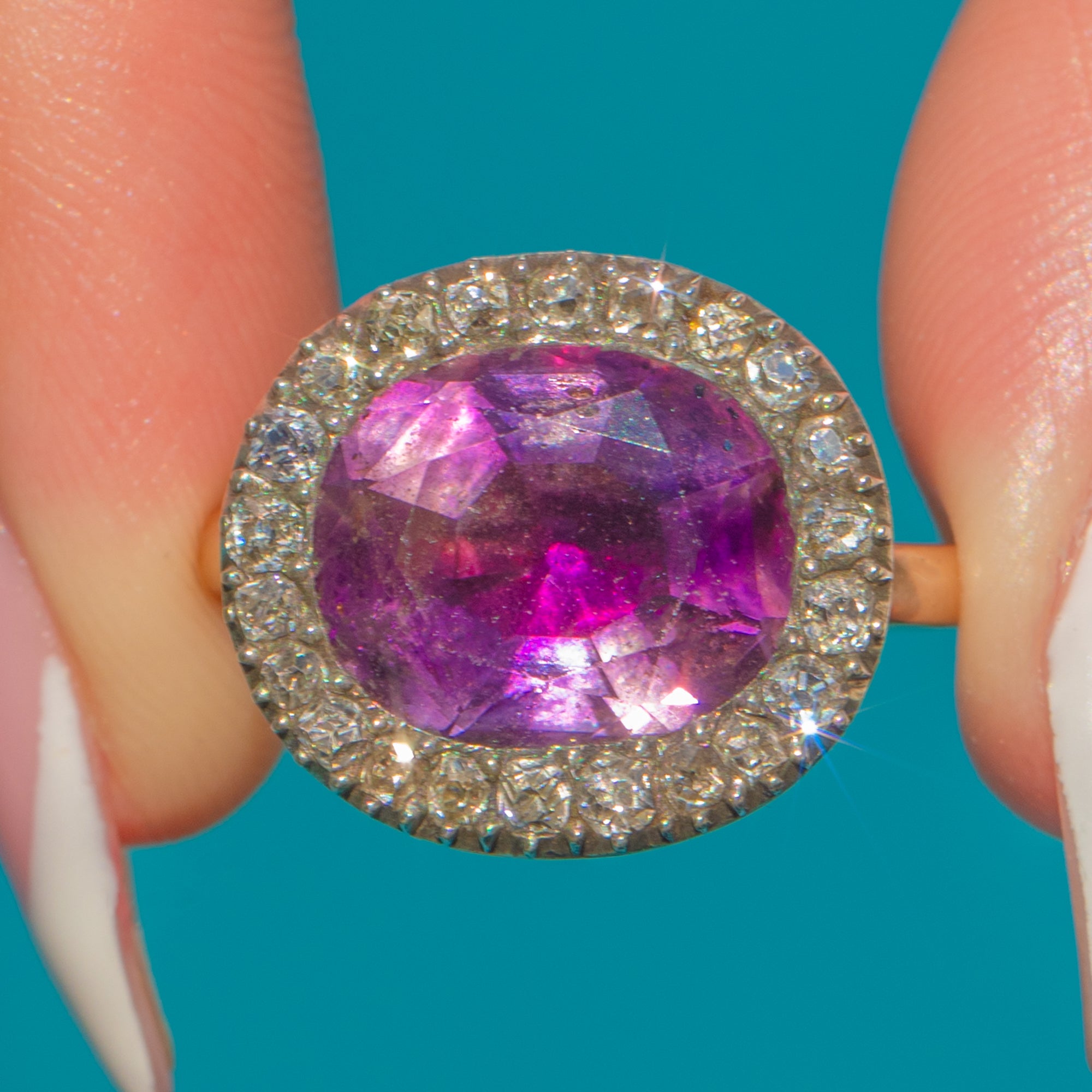 The face is set with a richly coloured 12.5 x 10.5mm faceted Amethyst of approximately 1.8cts, surrounded by a halo of 22 glittering old mine cut Diamonds totalling around 0.35cts. Crafted in the late 18th century with remarkable care, it remains pristine — a wearable piece of Georgian history.