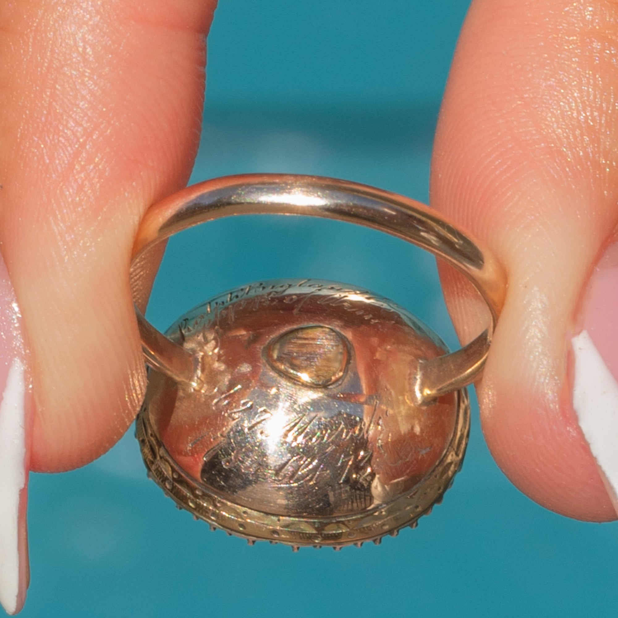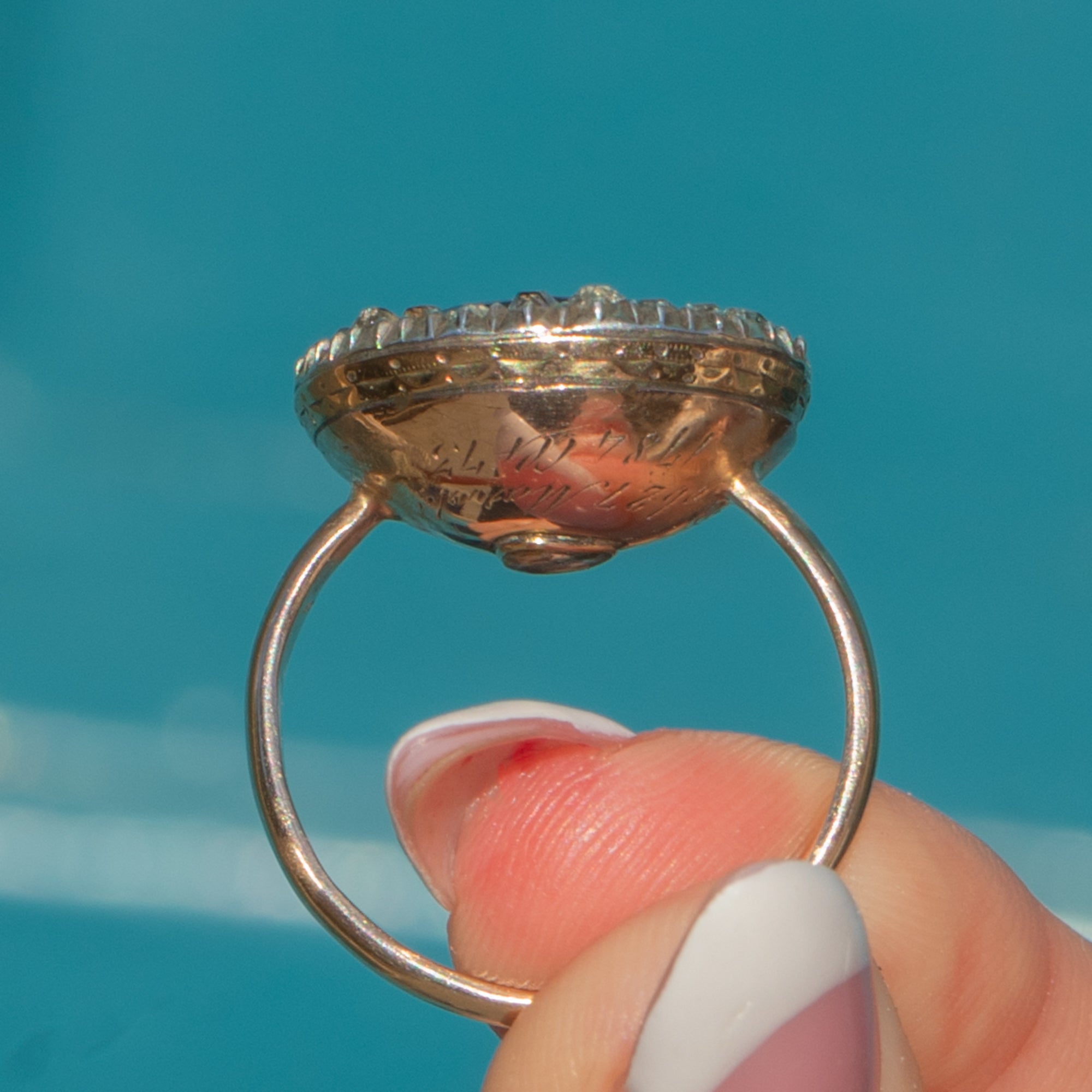 The reverse is engraved: “ob 27 March 1784 at 73. GPH of Arms” and bears a tiny glazed panel, a typical feature of high-status Georgian mourning jewellery. The inscription refers to Ralph Bigland, Garter Principal King of Arms, the most senior herald at the College of Arms in London, who served from 1780 until his death in 1784. As Garter King of Arms, Bigland was responsible for state ceremonial occasions and the granting of coats of arms, making this ring a piece of national heritage as well as a personal memorial.
