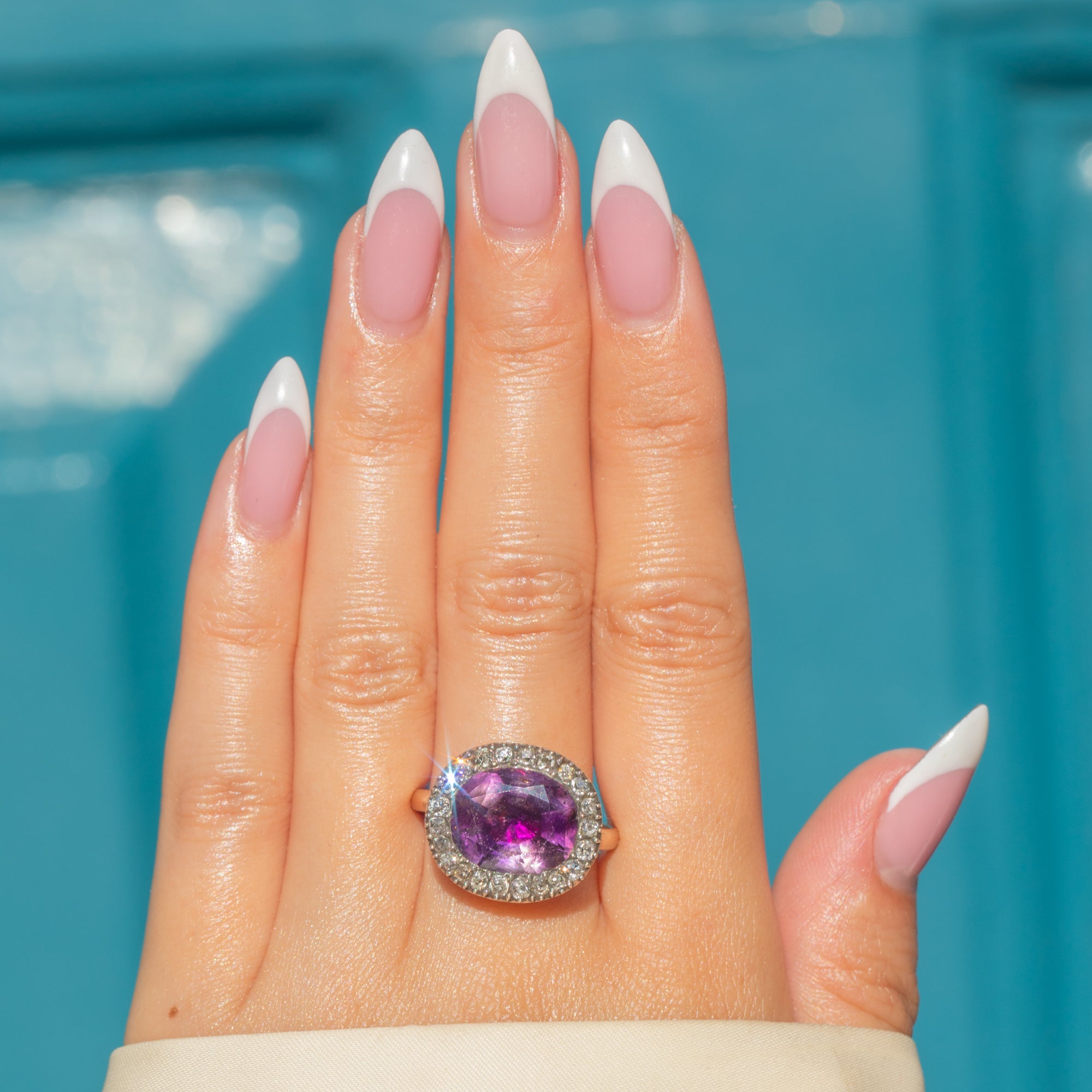 MEASUREMENTS: Amethyst measures 12.5 x 10.5mm (0.49" x 0.41"), approx. 1.8ct. 22 x 1.5–1.7mm old mine cut Diamonds totalling approx. 0.35cts.